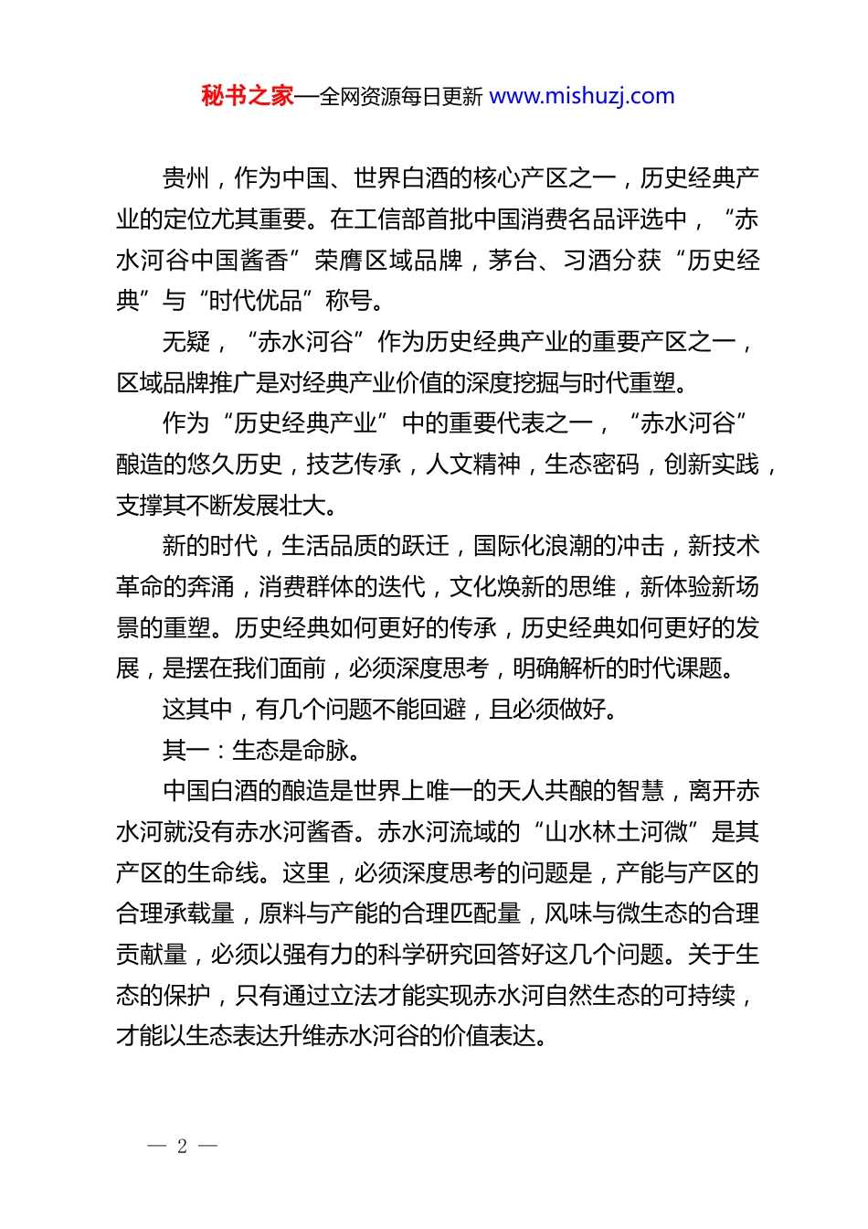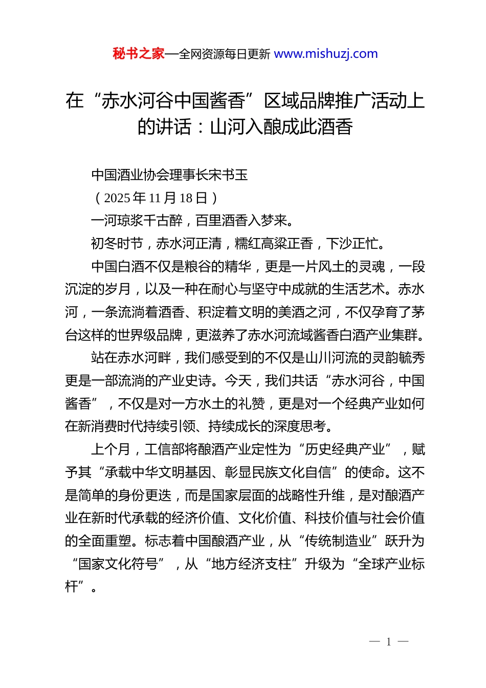 秘书之家—全网资源每日更新 www.mishuzj.com在“赤水河谷中国酱香”区域品牌推广活动上的讲话:山河入酿成此酒香中国酒业协会理事长宋书玉(2025 年 11 月 18 日)一河琼浆千古醉,百里酒香入梦来。初冬时节,赤水河正清,糯红高粱正香,下沙正忙。中国白酒不仅是粮谷的精华,更是一片风土的灵魂,一段沉淀的岁月,以及一种在耐心与坚守中成就的生活艺术。赤水河,一条流淌着酒香、积淀着文明的美酒之河,不仅孕育了茅台这样的世界级品牌,更滋养了赤水河流域酱香白酒产业集群。站在赤水河畔,我们感受到的不仅是山川河流的灵韵毓秀更是一部流淌的产业史诗。今天,我们共话“赤水河谷,中国酱香”,不仅是对一方水土的礼赞,更是对一个经典产业如何在新消费时代持续引领、持续成长的深度思考。上个月,工信部将酿酒产业定性为“历史经典产业”,赋予其“承载中华文明基因、彰显民族文化自信”的使命。这不是简单的身份更迭,而是国家层面的战略性升维,是对酿酒产业在新时代承载的经济价值、文化价值、科技价值与社会价值的全面重塑。标志着中国酿酒产业,从“传统制造业”跃升为“国家文化符号”,从“地方经济支柱”升级为“全球产业标杆”。— 1 —秘书之家—全网资源每日更新 www.mishuzj.com贵州,作为中国、世界白酒的核心产区之一,历史经典产业的定位尤其重要。在工信部首批中国消费名品评选中,“赤水河谷中国酱香”荣膺区域品牌,茅台、习酒分获“历史经典”与“时代优品”称号。无疑,“赤水河谷”作为历史经典产业的重要产区之一,区域品牌推广是对经典产业价值的深度挖掘与时代重塑。作为“历史经典产业”中的重要代表之一,“赤水河谷”酿造的悠久历史,技艺传承,人文精神,生态密码,创新实践,支撑其不断发展壮大。新的时代,生活品质的跃迁,国际化浪潮的冲击,新技术革命的奔涌,消费群体的迭代,文化焕新的思维,新体验新场景的重塑。历史经典如何更好的传承,历史经典如何更好的发展,是摆在我们面前,必须深度思考,明确解析的时代课题。这其中,有几个问题不能回避,且必须做好。其一:生态是命脉。中国白酒的酿造是世界上唯一的天人共酿的智慧,离开赤水河就没有赤水河酱香。赤水河流域的“山水林土河微”是其产区的生命线。这里,必须深度思考的问题是,产能与产区的合理承载量,原料与产能的合理匹配量,风味与微生态的合理贡献量,必须以强有力的科学研究回答好这几个问题。关于生态的保护,只有通过立法才能实现赤水河自然生态的可持续,才能以生态表达升维赤水河谷的价值表达。— 2 —秘书之家—全网资源每日更新 www.mishuzj.com其二:文化是核心为什么而酿,为谁而酿必须清晰而明确。人,只有在历史维度中才能领会自身。中国酒文化,就是中华民族所创造、传承、选择、整合的饮酒思维方式和生活方式的系统组成。以文化为中心就是消费者为中心。“感恩互敬、分享表达利他为主、兼顾悦己”。这是中国酿造的共性文化表达。赤水河谷的文化核心是什么?当然需要明确。我们酒业的问题,根本的不在政策、环境,而在我们自己所有问题,都是文化问题。传承技艺,弘扬精神,走向国际亦是文化的突围。我们必须传承、选择、整合、创造,走出一条中国酒文化的“中国式现代化”之路。其三:传承是根本中国白酒的成功者,都是传统技艺的优秀传承者。中国白酒酿造的神秘是世界难题,亦是世纪难题。建国以来,所有的科学研究,基本上都是对传统酿造的科学性和合理性的解析。所以,以敬畏之心传承传统工艺,是历史经典产业的立命之本。谨遵端午制曲、重阳下沙、九次蒸煮、八次发酵、七次取酒……这套复杂、漫长而严谨的酿造工艺,是历代酿酒师心口相传的智慧。也是其风味的极致艺术。其四:时间是成就— 3 —秘书之家—全网资源每日更新 www.mishuzj.com酿的长,存的长,成就了赤水河谷酱酒的味道。白酒产业是典型的时间产业。我曾讲:产业未来的竞争,不仅是你能产多少酒,酿多少好酒,而是看你存了多少好酒。酒是陈的香,陈香的酒是贮存出来的,是时间的味道,不是吹牛吹出来的。越来越多的企业越来越注重贮存能力的提升,越来越注重酿、存、销的合...