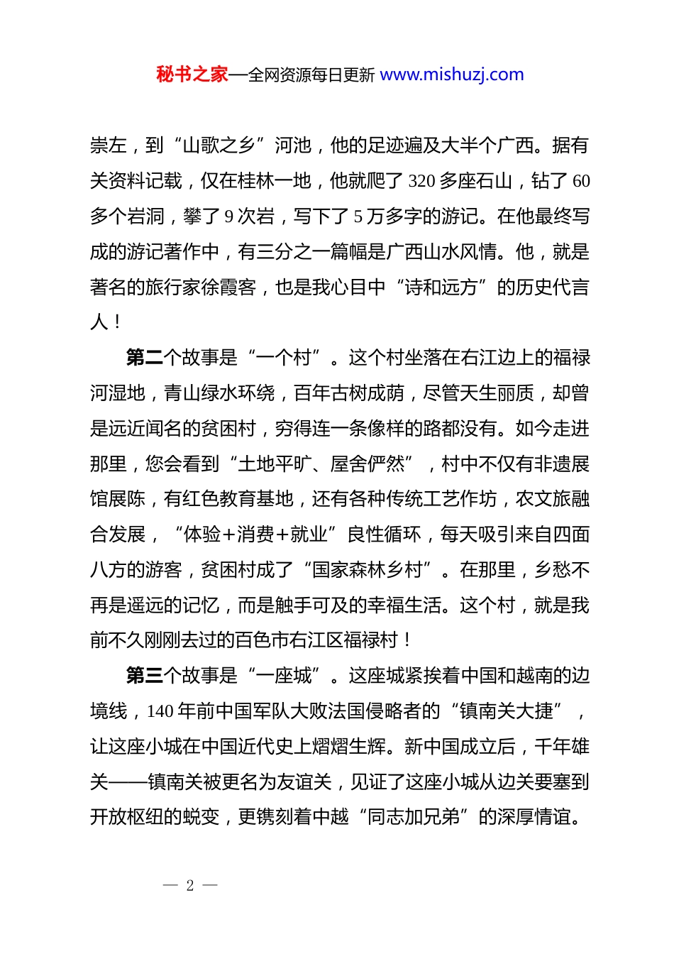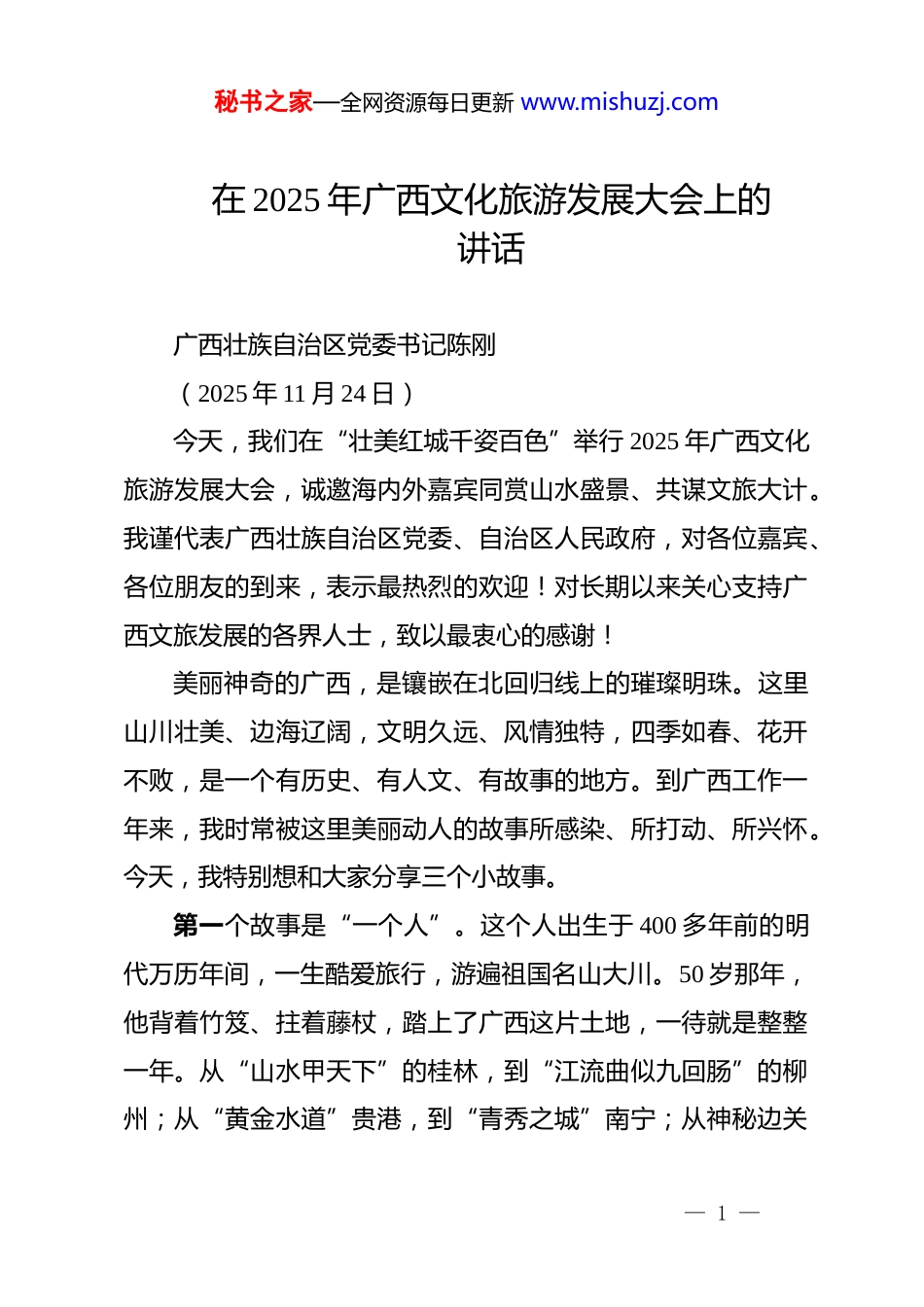 秘书之家—全网资源每日更新 www.mishuzj.com在 2025 年广西文化旅游发展大会上的讲话广西壮族自治区党委书记陈刚(2025 年 11 月 24 日)今天,我们在“壮美红城千姿百色”举行 2025 年广西文化旅游发展大会,诚邀海内外嘉宾同赏山水盛景、共谋文旅大计。我谨代表广西壮族自治区党委、自治区人民政府,对各位嘉宾、各位朋友的到来,表示最热烈的欢迎!对长期以来关心支持广西文旅发展的各界人士,致以最衷心的感谢!美丽神奇的广西,是镶嵌在北回归线上的璀璨明珠。这里山川壮美、边海辽阔,文明久远、风情独特,四季如春、花开不败,是一个有历史、有人文、有故事的地方。到广西工作一年来,我时常被这里美丽动人的故事所感染、所打动、所兴怀。今天,我特别想和大家分享三个小故事。第一个故事是“一个人”。这个人出生于 400 多年前的明代万历年间,一生酷爱旅行,游遍祖国名山大川。50 岁那年,他背着竹笈、拄着藤杖,踏上了广西这片土地,一待就是整整一年。从“山水甲天下”的桂林,到“江流曲似九回肠”的柳州;从“黄金水道”贵港,到“青秀之城”南宁;从神秘边关— 1 —秘书之家—全网资源每日更新 www.mishuzj.com崇左,到“山歌之乡”河池,他的足迹遍及大半个广西。据有关资料记载,仅在桂林一地,他就爬了 320 多座石山,钻了 60多个岩洞,攀了 9 次岩,写下了 5 万多字的游记。在他最终写成的游记著作中,有三分之一篇幅是广西山水风情。他,就是著名的旅行家徐霞客,也是我心目中“诗和远方”的历史代言人!第二个故事是“一个村”。这个村坐落在右江边上的福禄河湿地,青山绿水环绕,百年古树成荫,尽管天生丽质,却曾是远近闻名的贫困村,穷得连一条像样的路都没有。如今走进那里,您会看到“土地平旷、屋舍俨然”,村中不仅有非遗展馆展陈,有红色教育基地,还有各种传统工艺作坊,农文旅融合发展,“体验+消费+就业”良性循环,每天吸引来自四面八方的游客,贫困村成了“国家森林乡村”。在那里,乡愁不再是遥远的记忆,而是触手可及的幸福生活。这个村,就是我前不久刚刚去过的百色市右江区福禄村!第三个故事是“一座城”。这座城紧挨着中国和越南的边境线,140 年前中国军队大败法国侵略者的“镇南关大捷”,让这座小城在中国近代史上熠熠生辉。新中国成立后,千年雄关——镇南关被更名为友谊关,见证了这座小城从边关要塞到开放枢纽的蜕变,更镌刻着中越“同志加兄弟”的深厚情谊。— 2 —秘书之家—全网资源每日更新 www.mishuzj.com过去边民肩挑背扛做点边贸生意,如今车货穿梭、游人如织,15 秒过卡,24 小时通关,东盟水果从这里新鲜直达,中国制造从这里畅行世界。今年恰逢中越建交 75 周年暨人文交流年,跨境一日游、两日游持续火爆,边关旅游节欢乐交融,前三季度通关量达 300 万人次、进出口总额达 4400 多亿元。这座城,就是素有“中国南大门”之称的凭祥市,正以开放包容之姿,续写着文明交融的新故事,成为广西服务构建更为紧密的中国—东盟命运共同体的生动写照!“一个人”“一个村”“一座城”,三个小故事串起了广西文旅长卷的动人篇章。绚丽多姿的壮乡大地,这样的故事说不尽、道不完。这两天,大家参加了丰富多彩的嘉年华活动,还将走访边关风情、民族文化、跨境旅游、长寿养生等线路,一定能切身感受到这片土地的厚重与多元、传承与创新、交融与共生。在这里,您可以观赏自然风光之奇。全球三分之一的喀斯特地貌在此汇聚,漓江、红水河、十万大山、大石围天坑群、北部湾海滨海岛等无数奇观令人叹为观止,支撑起广西“全域皆景、四季宜游”的文旅版图。在这里,您可以体验文化交融之盛。这里自古以来就是多民族聚居区,12 个世居民族团结和— 3 —秘书之家—全网资源每日更新 www.mishuzj.com睦,创造了世界文化遗产花山岩画以及壮锦、铜鼓、刘三姐歌谣等 70 项国家级非遗,历史文化、海洋文化、农耕文化、红色文化交相辉映。在这里,您可以细品生态宜居之韵。这里森林覆盖率高达 60.2%,负氧离子含量领跑全国,是名副其实的“天然氧吧”,更是颐养身心的理想家园,置身“世界长寿之乡”巴马...