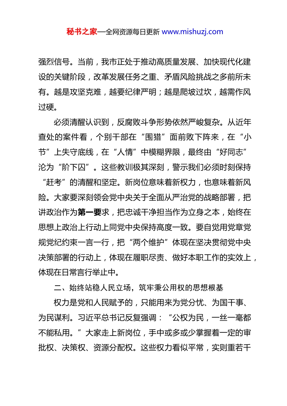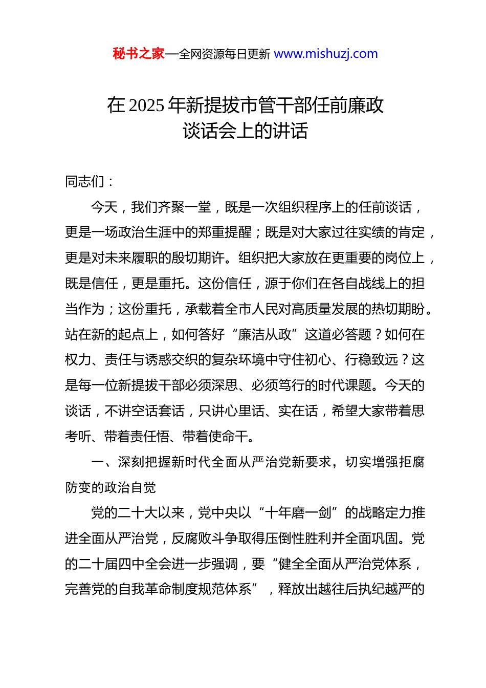 秘书之家—全网资源每日更新 www.mishuzj.com在 2025 年新提拔市管干部任前廉政谈话会上的讲话 同志们:今天,我们齐聚一堂,既是一次组织程序上的任前谈话,更是一场政治生涯中的郑重提醒;既是对大家过往实绩的肯定,更是对未来履职的殷切期许。组织把大家放在更重要的岗位上,既是信任,更是重托。这份信任,源于你们在各自战线上的担当作为;这份重托,承载着全市人民对高质量发展的热切期盼。站在新的起点上,如何答好“廉洁从政”这道必答题?如何在权力、责任与诱惑交织的复杂环境中守住初心、行稳致远?这是每一位新提拔干部必须深思、必须笃行的时代课题。今天的谈话,不讲空话套话,只讲心里话、实在话,希望大家带着思考听、带着责任悟、带着使命干。一、深刻把握新时代全面从严治党新要求,切实增强拒腐防变的政治自觉党的二十大以来,党中央以“十年磨一剑”的战略定力推进全面从严治党,反腐败斗争取得压倒性胜利并全面巩固。党的二十届四中全会进一步强调,要“健全全面从严治党体系,完善党的自我革命制度规范体系”,释放出越往后执纪越严的秘书之家—全网资源每日更新 www.mishuzj.com强烈信号。当前,我市正处于推动高质量发展、加快现代化建设的关键阶段,改革发展任务之重、矛盾风险挑战之多前所未有。越是攻坚克难,越要纪律严明;越是爬坡过坎,越需作风过硬。必须清醒认识到,反腐败斗争形势依然严峻复杂。从近年查处的案件看,个别干部在“围猎”面前败下阵来,在“小节”上失守底线,在“人情”中模糊界限,最终由“好同志”沦为“阶下囚”。这些教训极其深刻,警示我们必须时刻保持“赶考”的清醒和坚定。新岗位意味着新权力,也意味着新风险。大家要深刻领会党中央关于全面从严治党的战略部署,把讲政治作为第一要求,把忠诚干净担当作为立身之本,始终在思想上政治上行动上同党中央保持高度一致。要自觉用党章党规党纪约束一言一行,把“两个维护”体现在坚决贯彻党中央决策部署的行动上,体现在履职尽责、做好本职工作的实效上,体现在日常言行举止中。二、始终站稳人民立场,筑牢秉公用权的思想根基权力是党和人民赋予的,只能用来为党分忧、为国干事、为民谋利。习近平总书记反复强调:“公权为民,一丝一毫都不能私用。”大家走上新岗位,手中或多或少掌握着一定的审批权、决策权、资源分配权。这些权力看似平常,实则重若千秘书之家—全网资源每日更新 www.mishuzj.com钧。用得好,能造福一方;用得偏,必贻害无穷。要牢固树立正确的权力观、政绩观、事业观。坚持“为了谁、依靠谁、我是谁”的根本立场,把群众满意作为最高标准。无论是制定政策、推动项目,还是处理信访、化解矛盾,都要多问一问“群众答应不答应、高兴不高兴、满意不满意”。某县一位新任乡镇长上任后,没有急着搞“形象工程”,而是连续一周走村入户,摸清了 137 户困难群众的实际需求,协调资金修通了断头路、建起了老年食堂。他说:“老百姓家门口的路通了,我的心才踏实。”这样的干部,群众自然信得过、靠得住。要警惕“微权力”背后的“大风险”。基层一线、窗口单位、执法岗位的同志,直接面对群众,一言一行都关乎党和政府形象。一次推诿扯皮、一次吃拿卡要,看似小事,却可能寒了群众的心,损了党的威信。要坚决杜绝“门好进、脸好看、事难办”的隐形变异问题,力戒形式主义、官僚主义,真正把好事办好、实事办实。三、严守纪律规矩底线,习惯在受监督和约束的环境中工作生活纪律是管党治党的“戒尺”,也是党员干部约束自身行为的标准和遵循。新修订的《中国共产党纪律处分条例》进一步秘书之家—全网资源每日更新 www.mishuzj.com划出了不可触碰的红线。大家要逐条学习、逐项对照,真正把纪律规矩刻印在心、落实于行。要把政治纪律和政治规矩摆在首位。决不允许搞“七个有之”,决不允许做“两面人”,决不允许在重大原则问题上含糊其词、左右摇摆。要严格执行请示报告制度,对重大事项、重要情况必须按规定及时向组织报告,决不能先斩后奏,甚至斩而不奏。要严守廉洁纪律,做到清清白白做人、干干净净做事。正确处理亲清政商关系,既要主动服务企业、优...
