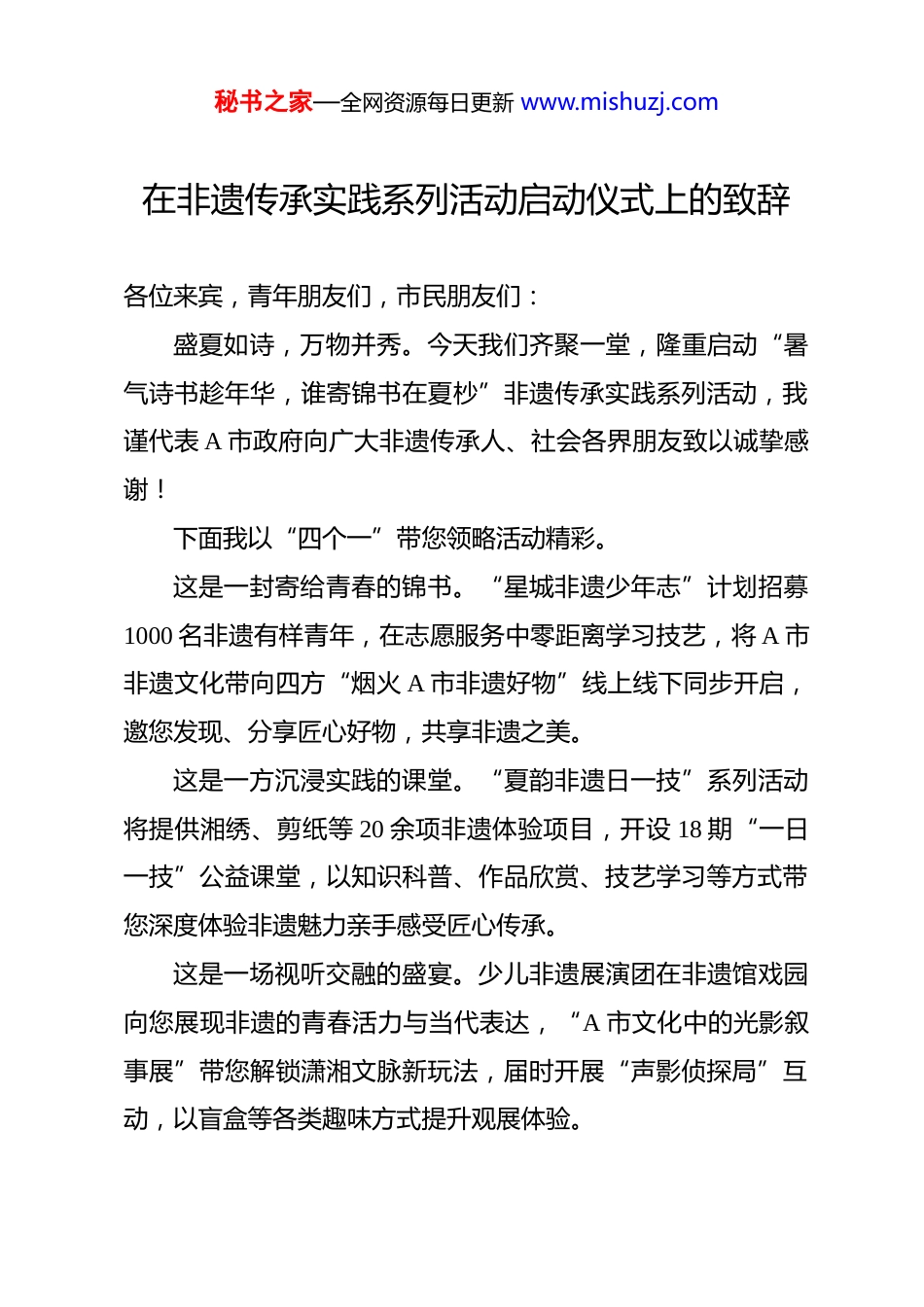 秘书之家—全网资源每日更新 www.mishuzj.com在非遗传承实践系列活动启动仪式上的致辞各位来宾,青年朋友们,市民朋友们:盛夏如诗,万物并秀。今天我们齐聚一堂,隆重启动“暑气诗书趁年华,谁寄锦书在夏杪”非遗传承实践系列活动,我谨代表 A 市政府向广大非遗传承人、社会各界朋友致以诚挚感谢!下面我以“四个一”带您领略活动精彩。这是一封寄给青春的锦书。“星城非遗少年志”计划招募1000 名非遗有样青年,在志愿服务中零距离学习技艺,将 A 市非遗文化带向四方“烟火 A 市非遗好物”线上线下同步开启,邀您发现、分享匠心好物,共享非遗之美。这是一方沉浸实践的课堂。“夏韵非遗日一技”系列活动将提供湘绣、剪纸等 20 余项非遗体验项目,开设 18 期“一日一技”公益课堂,以知识科普、作品欣赏、技艺学习等方式带您深度体验非遗魅力亲手感受匠心传承。这是一场视听交融的盛宴。少儿非遗展演团在非遗馆戏园向您展现非遗的青春活力与当代表达,“A 市文化中的光影叙事展”带您解锁潇湘文脉新玩法,届时开展“声影侦探局”互动,以盲盒等各类趣味方式提升观展体验。秘书之家—全网资源每日更新 www.mishuzj.com这是一段非遗研学的旅途。“乘地铁读非遗”亲子活动橘子洲站启程,手绘地图寻踪古韵;贯穿暑期的“非遗田野行”深入区县;非遗“湘”伴研学游邀您走进浏阳,宁乡,探访湘绣博物馆、玉和醋传习所等,感受非遗魅力。朋友们,传承体验非遗是守护文化根脉,这场夏日的非遗之约,期待各位来宾热情参与,让非遗在体验中“活”起来,在研学中“传”下去,在创意中“潮”起来!预祝活动圆满成功!祝大家收获满满文化记忆!谢谢大家!