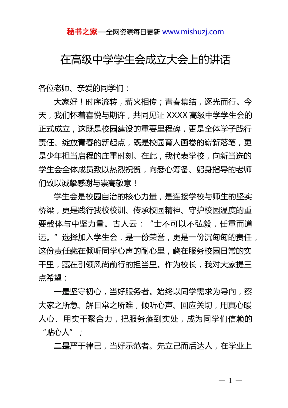 秘书之家—全网资源每日更新 www.mishuzj.com在高级中学学生会成立大会上的讲话各位老师、亲爱的同学们:大家好!时序流转,薪火相传;青春集结,逐光而行。今天,我们怀着喜悦与期许,共同见证 XXXX 高级中学学生会的正式成立,这既是校园建设的重要里程碑,更是全体学子践行责任、绽放青春的新起点,既是校园育人画卷的崭新落笔,更是少年担当启程的庄重时刻。在此,我代表学校,向新当选的学生会全体成员致以热烈祝贺,向悉心筹备、躬身指导的老师们致以诚挚感谢与崇高敬意!学生会是校园自治的核心力量,是连接学校与师生的坚实桥梁,更是践行我校校训、传承校园精神、守护校园温度的重要载体与中坚力量。古人云:“士不可以不弘毅,任重而道远。”选择加入学生会,是一份荣誉,更是一份沉甸甸的责任,这份责任藏在倾听同学心声的耐心里,藏在服务校园日常的实干里,藏在引领风尚前行的担当里。作为校长,我对大家提三点希望:一是坚守初心,当好服务者。始终以同学需求为导向,察大家之所急、解日常之所难,倾听心声、回应关切,用真心暖人心、用实干聚合力,把服务落到实处,成为同学们信赖的“贴心人”;二是严于律己,当好示范者。先立己而后达人,在学业上— 1 —秘书之家—全网资源每日更新 www.mishuzj.com勤学善思、精进不怠,在品行上正心修身、砥砺修身,以一言一行诠释 XX 学子的素养、风骨与朝气,成为全体同学的“标杆者”;三是勇于担当,当好建设者。主动扛起校园发展责任,牢记“知行合一,笃行致远”的初心,积极策划优质活动、凝聚青春力量,以鲜活创意丰富校园文化,以务实举措助力学校发展,为校园进步献策出力,成为校园发展的“推动者”。“独木不成林,单弦难成曲。”学生会的生命力在于团结,战斗力在于协作,希望大家心往一处想、劲往一处使,既能各展所长、各尽其能,又能互帮互助、同心致远,让每一项活动都有温度、有意义,让每一份付出都有回响、有价值。学校永远是大家最坚实的后盾,会全力支持学生会开展各项工作,支持大家大胆探索、积极作为,也期待全体成员不负使命、脚踏实地,在服务中沉淀成长,在奉献中绽放光彩,把青春的热血与担当,写进 XX 发展的篇章里,与全校师生携手,共同书写XXXX 高质量发展的崭新篇章。最后,祝愿学生会凝心聚力、蓬勃发展、砥砺前行,祝愿各位同学不负韶华、以梦为马、逐梦前行、向阳而生,共同让XXXX 的校园更有活力、更有底蕴、更有力量!谢谢大家!— 2 —