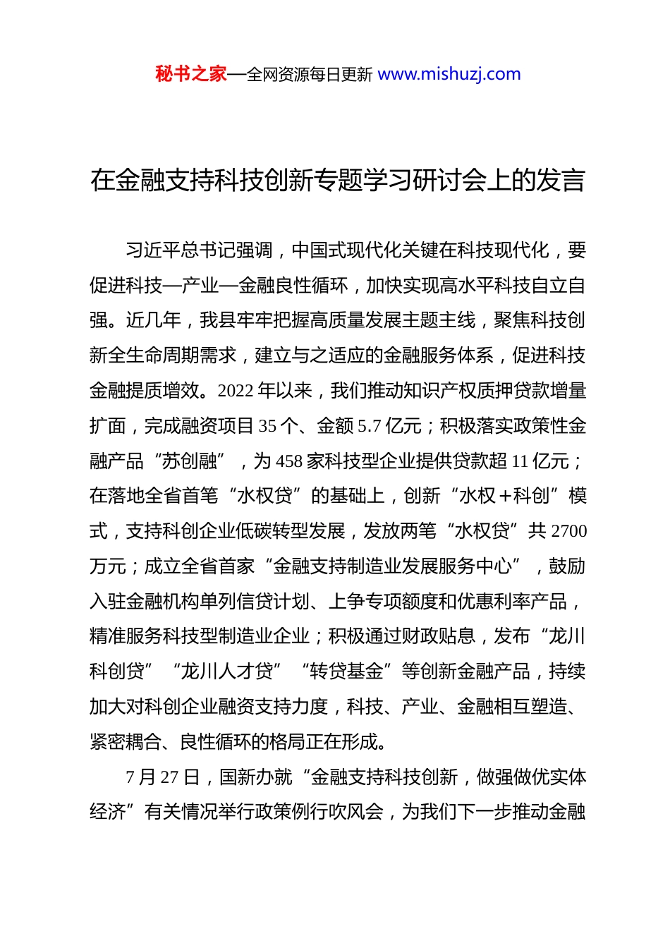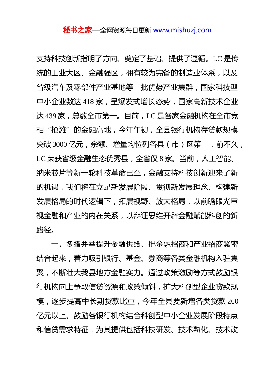 秘书之家—全网资源每日更新 www.mishuzj.com在金融支持科技创新专题学习研讨会上的发言习近平总书记强调,中国式现代化关键在科技现代化,要促进科技—产业—金融良性循环,加快实现高水平科技自立自强。近几年,我县牢牢把握高质量发展主题主线,聚焦科技创新全生命周期需求,建立与之适应的金融服务体系,促进科技金融提质增效。2022 年以来,我们推动知识产权质押贷款增量扩面,完成融资项目 35 个、金额 5.7 亿元;积极落实政策性金融产品“苏创融”,为 458 家科技型企业提供贷款超 11 亿元;在落地全省首笔“水权贷”的基础上,创新“水权+科创”模式,支持科创企业低碳转型发展,发放两笔“水权贷”共 2700万元;成立全省首家“金融支持制造业发展服务中心”,鼓励入驻金融机构单列信贷计划、上争专项额度和优惠利率产品,精准服务科技型制造业企业;积极通过财政贴息,发布“龙川科创贷”“龙川人才贷”“转贷基金”等创新金融产品,持续加大对科创企业融资支持力度,科技、产业、金融相互塑造、紧密耦合、良性循环的格局正在形成。7 月 27 日,国新办就“金融支持科技创新,做强做优实体经济”有关情况举行政策例行吹风会,为我们下一步推动金融秘书之家—全网资源每日更新 www.mishuzj.com支持科技创新指明了方向、奠定了基础、提供了遵循。LC 是传统的工业大区、金融强区,拥有较为完备的制造业体系,以及省级汽车及零部件产业基地等一批优势产业集群,国家科技型中小企业数达 418 家,呈爆发式增长态势,国家高新技术企业达 439 家,总数全市第一。目前,LC 是各家金融机构在全市竞相“抢滩”的金融高地,今年年初,全县银行机构存贷款规模突破 3000 亿元,余额、增量均位列各县(市)区第一,前不久,LC 荣获省级金融生态优秀县,全省仅 8 家。当前,人工智能、纳米芯片等新一轮科技革命已至,金融支持科技创新迎来了新的机遇,我们将在立足新发展阶段、贯彻新发展理念、构建新发展格局的时代逻辑下,拓展视野、放大格局,以前瞻眼光审视金融和产业的内在关系,以辩证思维开辟金融赋能科创的新路径。一、多措并举提升金融供给。把金融招商和产业招商紧密结合起来,着力吸引银行、基金、券商等各类金融机构入驻集聚,不断壮大我县地方金融实力。通过政策激励等方式鼓励银行机构向上争取信贷资源和政策倾斜,扩大科创型企业贷款规模,逐步提高中长期贷款比重,今年全县要新增各类贷款 260亿元以上。鼓励各银行机构结合科创型中小企业发展阶段特点和信贷需求特征,为其提供包括科技研发、技术熟化、技术改秘书之家—全网资源每日更新 www.mishuzj.com造、知识产权交易等全方位金融服务支持。持续扩展“苏科贷”“苏科投”“苏科保”等政策性科技金融产品应用,建立政府引导、市场运作的创新创业企业信用增信机制,积极发挥政府性融资担保机构的增信功能。二、投贷联动扩大直融规模。发挥“投贷联动”作用,推动各类产业基金加大科创型企业股权投资,调动证券、保险等金融机构资源,全面开展短融、中期票据、集合票据、项目收益票据等业务。健全企业上市金融服务工作体系,抢抓北交所推动机遇,加强对专尖特新中小企业分类指导,推动硬核科技企业和高成长性创新创业企业在资本市场上市;依托境内外资本市场、债券市场和股权投资基金,有力推进企业首发融资、定向增发,同时,对接债券创新产品信息,支持更多优质企业通过债券融资发展。三、精准对接优化服务效能。常态化开展“政银企”对接活动,聚焦科创型企业,定期梳排融资需求、开展上门服务,加快各类惠企金融政策和产品落地见效。用好用足“金融支持制造业发展服务中心”等金融服务平台,加快科创金融中心建设,提升科创型企业融资服务基础支撑能力,不断化解企业“融资难”“融资贵”“融资慢”问题。围绕“稳金融”的目标,对符合产业发展方向、产品有市场份额、暂时遇到困难的秘书之家—全网资源每日更新 www.mishuzj.com民营企业,进行会诊帮扶、精准扶持,“一企一策”落实转贷续贷、短期流动性支持等举措,与金融机构一起帮助企业通过时间换空间,解决阶段性困难。四、完善机制...