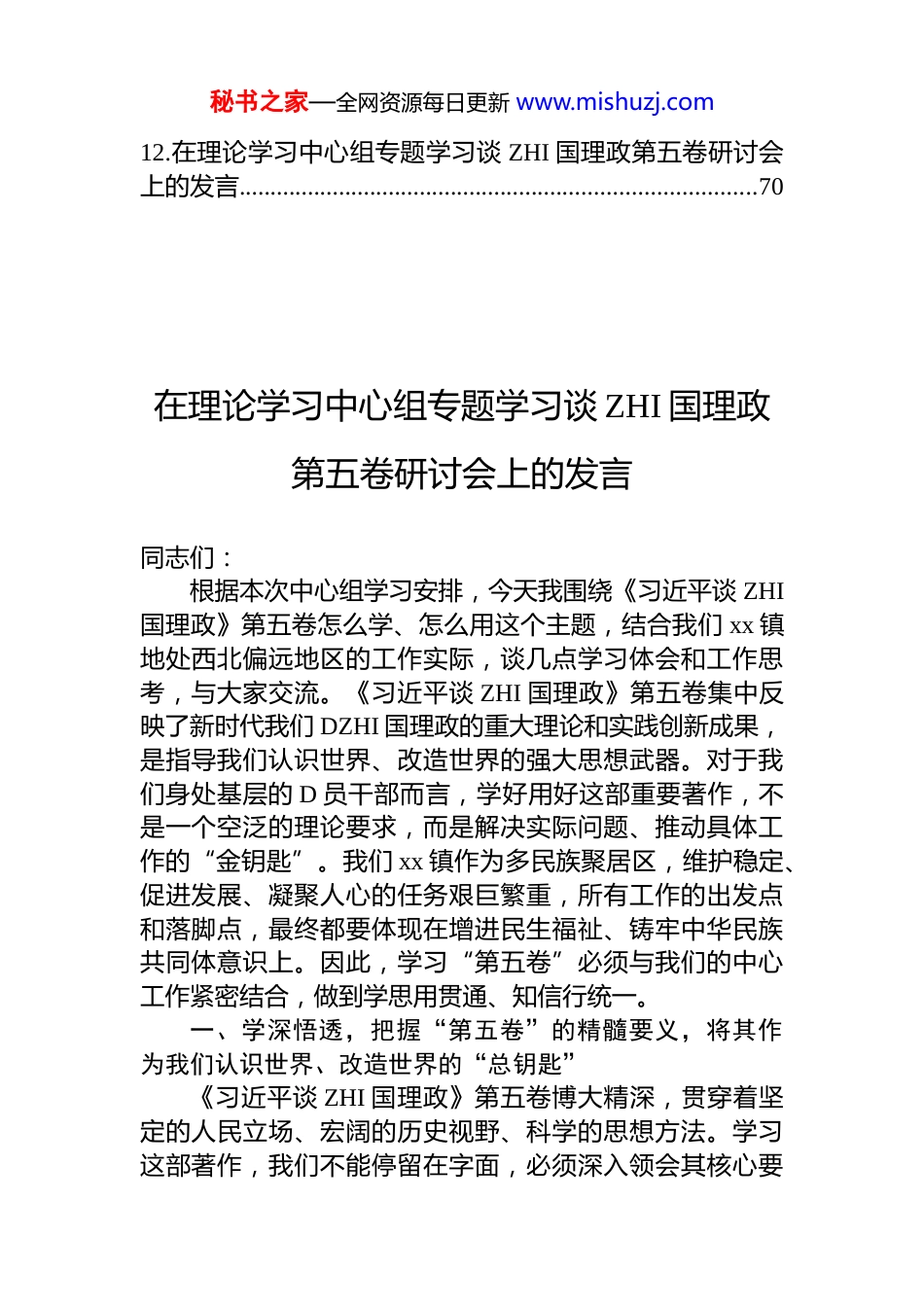秘书之家—全网资源每日更新 www.mishuzj.com在理论学习中心组专题学习谈 ZHI 国理政第五卷研讨会上的发言材料汇编(12 篇)目录1.在理论学习中心组专题学习谈 ZHI 国理政第五卷研讨会上的发言.........................................................................................32.在理论学习中心组专题学习谈 ZHI 国理政第五卷研讨会上的发言.......................................................................................103.在理论学习中心组专题学习谈 ZHI 国理政第五卷研讨会上的发言.......................................................................................164.在理论学习中心组专题学习谈 ZHI 国理政第五卷研讨会上的发言.......................................................................................225.在理论学习中心组专题学习谈 ZHI 国理政第五卷研讨会上的发言.......................................................................................306.在理论学习中心组专题学习谈 ZHI 国理政第五卷研讨会上的发言.......................................................................................377.在理论学习中心组专题学习谈 ZHI 国理政第五卷研讨会上的发言.......................................................................................438.在理论学习中心组专题学习谈 ZHI 国理政第五卷研讨会上的发言.......................................................................................489.在理论学习中心组专题学习谈 ZHI 国理政第五卷研讨会上的发言.......................................................................................5410.在理论学习中心组专题学习谈 ZHI 国理政第五卷研讨会上的发言...................................................................................6011.在理论学习中心组专题学习谈 ZHI 国理政第五卷研讨会上的发言...................................................................................65秘书之家—全网资源每日更新 www.mishuzj.com12.在理论学习中心组专题学习谈 ZHI 国理政第五卷研讨会上的发言...................................................................................70在理论学习中心组专题学习谈 ZHI 国理政第五卷研讨会上的发言同志们:根据本次中心组学习安排,今天我围绕《习近平谈 ZHI国理政》第五卷怎么学、怎么用这个主题,结合我们 xx 镇地处西北偏远地区的工作实际,谈几点学习体会和工作思考,与大家交流。《习近平谈 ZHI 国理政》第五卷集中反映了新时代我们 DZHI 国理政的重大理论和实践创新成果,是指导我们认识世界、改造世界的强大思想武器。对于我们身处基层的 D 员干部而言,学好用好这部重要著作,不是一个空泛的理论要求,而是解决实际问题、推动具体工作的“金钥匙”。我们 xx 镇作为多民族聚居区,维护稳定、促进发展、凝聚人心的任务艰巨繁重,所有工作的出发点和落脚点,最终都要体现在增进民生福祉、铸牢中华民族共同体意识上。因此,学习“第五卷”必须与我们的中心工作紧密结合,做到学思用贯通、知信行统一。一、学深悟透,把握“第五卷”的精髓要义,将其作为我们认识世界、改造世界的“总钥匙”《习近平谈 ZHI 国理政》第五卷博大精深,贯穿着坚定的人民立场、宏阔的历史视野、科学的思想方法。学习这部著作,我们不能停留在字面,必须深入领会其核心要秘书之家—全网资源每日更新 www.mishuzj.com义,特别是要把握好贯穿其中的世界观和方法论,用以指导我们破解发展难题。一是必须坚持人民至上。书中“江山就是人民,人民就是江山”的论述深刻阐明了我们 D 的根本立场。对我们乡镇工作而言,人民就是全镇的各族群众。我们的一切工作,无论是产业发展、环境整 ZHI,还是文化建设,最终都要看群众是否满意、生活是否改善。这要求我们想问题、作决策、办事情,都要站在群众的立场上,把群众的...