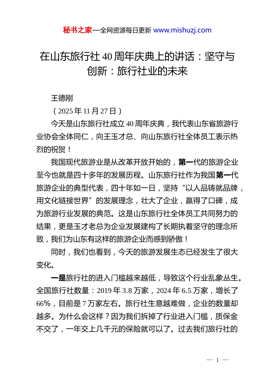 秘书之家—全网资源每日更新 www.mishuzj.com在山东旅行社 40 周年庆典上的讲话:坚守与创新:旅行社业的未来王德刚(2025 年 11 月 27 日)今天是山东旅行社成立 40 周年庆典,我代表山东省旅游行业协会全体同仁,向王玉才总、向山东旅行社全体员工表示热烈的祝贺!我国现代旅游业是从改革开放开始的,第一代的旅游企业至今也就是四十多年的发展历程。山东旅行社作为我国第一代旅游企业的典型代表,四十年如一日,坚持“以人品铸就品牌,用文化链接世界”的发展理念,壮大了企业,赢得了口碑,成为旅游行业发展的典范。这是山东旅行社全体员工共同努力的结果,更是玉才老总为企业发展建构了长期执着坚守的理念所致,我们为山东有这样的旅游企业而感到骄傲!同时,我们也看到,今天的旅游发展生态已经发生了很大变化。一是旅行社的进入门槛越来越低,导致这个行业乱象丛生。全国旅行社数量:2019 年 3.8 万家,2024 年 6.5 万家,增长了66%,目前是 7 万家左右。旅行社生意越难做,企业的数量却越多。为什么会这样?因为我们拆掉了行业进入门槛,质保金不交了,一年交上几千元的保险就可以了。过去我们旅行社的— 1 —秘书之家—全网资源每日更新 www.mishuzj.com老总们总是说,旅游服务我们是专业的,现在你的计调、导游都跑到新成立的保健品营销公司旅行社、汽车俱乐部旅行社、交通广播旅行社去打工了,你还有什么优势!我们算个简单算术题,全国 7 万家旅行社,按人口计算,平均每家旅行社对应着 2 万人口,但使用旅行社服务的人数连总人口的 10%都不到,能养活一家旅行社吗?因此,一定意义上说,这种低门槛制度,是旅行社乱象的根源。二是竞争格局变了,传统旅行社客源市场被挤压蚕食 。OTA 的数字碾压、自驾游的分流、各类俱乐部、培训学校、保健品营销公司等的蚕食,使传统旅行社的竞争已不再是单纯的同业、同行竞争,跨界竞争成为我们最大的对手。三是生存环境变了,旅行社成为被聚光灯照耀和放大镜监视的对象。在互联网、自媒体高度发达的今天,旅行社始终被放在聚光灯和放大镜下,你的一举一动都被看得清清楚楚,你稍微有一点的服务瑕疵,就会被无限放大,你必须小心翼翼地经营,甚至哆哆嗦嗦地生存。在这种环境下,一些同行感到迷茫。十年前,我们经常遇到踌躇满志的旅行社老总,今天我们经常听到的是叹气声!越是在这样的环境下,我想,我们有两点,一定要坚守、坚持:一是要坚守我们长期传承的理念:旅游服务,我们是专业的!— 2 —秘书之家—全网资源每日更新 www.mishuzj.com疫情期间,浙江温岭市石塘镇搞了一个暑期传统渔家民俗亲子研学项目,4 晚 5 天,售价 7888 元/2 人,网上一推出、立刻秒光,为什么会这样?该项目最大的卖点是研学导师全程英语解说——服务决定品质、品质决定价值!二是要坚持创新发展理念,没有创新,就没有出路!我前天刚看到颂赞酒店创始人白玛多吉发的广告——与大师同行,镜观圣域,西藏摄影主题游,7 晚 8 天,售价 54390 元/人。摄影导师是《美国国家地理》杂志著名的摄影大师——针对小众、专业、高端群体推出的主题化产品。实际上,在前几年我们经历了旅游业的大震荡、大衰退之后,许多企业也涅槃重生,行业内已经涌现出很多创新、转型成功的案例,这两个只是其中的典型代表。我想,坚守是一种品质,坚守的是专业和质量;创新是一种能力,创新的是产品、业态和服务。不是所有的企业都同时具备这两点优势的。所以,我非常赞赏玉才总为山东旅行社确定的两条最朴素的企业信念:做旅游就是做人品,做产品就是做文化;以人品铸就品牌,用文化链接世界。大家可能都感受到了,近期以来,文旅融合和文化旅游正在受到国家层面前所未有的重视。二十大、二十届三中全会、四中全会文件中连续不断地强调推进文化和旅游深度融合,特别是四中全会文件中有一句话:“大力发展文化旅游业,以文— 3 —秘书之家—全网资源每日更新 www.mishuzj.com化赋能经济社会发展”。这是非常重要的信号!人文经济、文化旅游必将在经济社会发展中发挥更大的作用。前几天山东省召开的国际儒商大会,会议的宗旨就是...