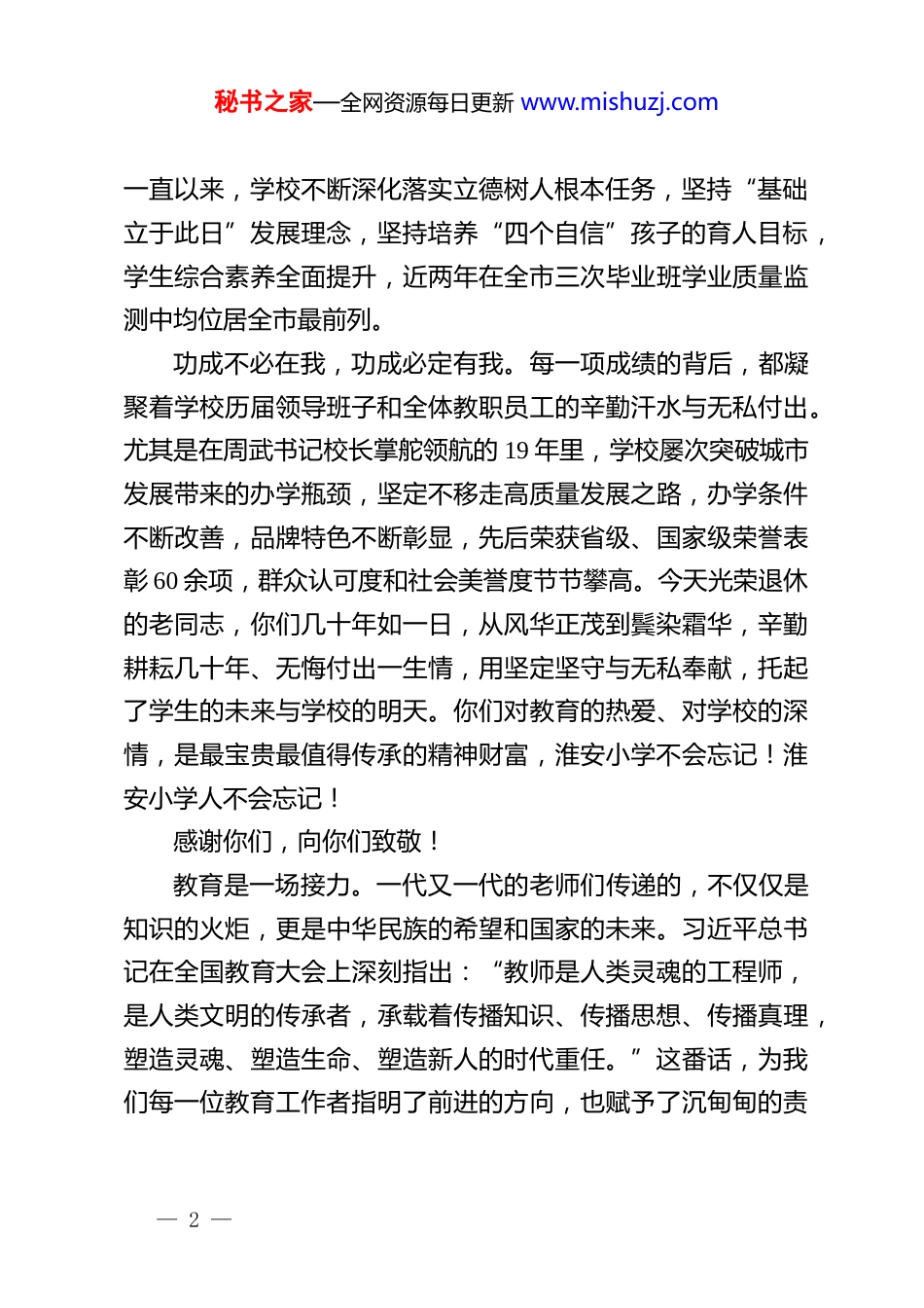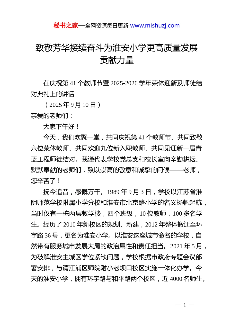秘书之家—全网资源每日更新 www.mishuzj.com致敬芳华接续奋斗为淮安小学更高质量发展贡献力量在庆祝第 41 个教师节暨 2025-2026 学年荣休迎新及师徒结对典礼上的讲话(2025 年 9 月 10 日)亲爱的老师们:大家下午好!今天,我们欢聚一堂,共同庆祝第 41 个教师节、共同致敬六位荣休教师、共同欢迎九位新入职教师、共同见证新一届青蓝工程师徒结对。我谨代表学校党总支和校长室向辛勤耕耘、默默奉献的老师们,致以崇高的敬意和诚挚的问候——老师,您辛苦了!抚今追昔,感慨万千。1989 年 9 月 3 日,学校以江苏省淮阴师范学校附属小学分校和淮安市北京路小学的名义扬帆起航,当时仅有一栋两层教学楼,四个班级,10 位教师,100 多名学生。经历了 2010 年新校区的规划、新建,2012 年整体搬迁至环宇路 36 号,更名为淮安小学。以淮安这座城市命名的学校,自然带有服务城市发展大局的政治属性和责任担当。2021 年 5 月,为破解淮安主城区学位紧缺问题,学校根据市政府专题会议部署安排,与清江浦区师院附小老坝口校区实施一体化办学。今天的淮安小学,拥有环宇路与和平路两个校区,近 4000 名师生。— 1 —秘书之家—全网资源每日更新 www.mishuzj.com一直以来,学校不断深化落实立德树人根本任务,坚持“基础立于此日”发展理念,坚持培养“四个自信”孩子的育人目标,学生综合素养全面提升,近两年在全市三次毕业班学业质量监测中均位居全市最前列。功成不必在我,功成必定有我。每一项成绩的背后,都凝聚着学校历届领导班子和全体教职员工的辛勤汗水与无私付出。尤其是在周武书记校长掌舵领航的 19 年里,学校屡次突破城市发展带来的办学瓶颈,坚定不移走高质量发展之路,办学条件不断改善,品牌特色不断彰显,先后荣获省级、国家级荣誉表彰 60 余项,群众认可度和社会美誉度节节攀高。今天光荣退休的老同志,你们几十年如一日,从风华正茂到鬓染霜华,辛勤耕耘几十年、无悔付出一生情,用坚定坚守与无私奉献,托起了学生的未来与学校的明天。你们对教育的热爱、对学校的深情,是最宝贵最值得传承的精神财富,淮安小学不会忘记!淮安小学人不会忘记!感谢你们,向你们致敬!教育是一场接力。一代又一代的老师们传递的,不仅仅是知识的火炬,更是中华民族的希望和国家的未来。习近平总书记在全国教育大会上深刻指出:“教师是人类灵魂的工程师,是人类文明的传承者,承载着传播知识、传播思想、传播真理,塑造灵魂、塑造生命、塑造新人的时代重任。”这番话,为我们每一位教育工作者指明了前进的方向,也赋予了沉甸甸的责— 2 —秘书之家—全网资源每日更新 www.mishuzj.com任。历年退休的老领导、老教师为我们做出了榜样,从教以来一直兢兢业业、辛勤耕耘的老师也是榜样,你们更是学校高质量发展的坚强基石。本学期排课,一些老师因为身体和参赛的原因需要阶段性请假,学校遇到了史无前例的“人荒”,涌现了很多感人的事迹,臧杭飞校长、杨跃珍老师义无反顾临时顶班上课,刘红云、王绍山、王彩丽及时顶上,其中刘红云带三年级两个班级数学兼任班主任,王彩丽老师一个人连续两周全程负责西校区全部代伙学生的午餐和餐后管理,於韦伟、张明祎老师备战省基本功大赛期间,搭班老师和张志娟、陆晓云、渠婷婷、许书杰、戴林霞老师承担起了全部课务,让两位参赛老师心无旁骛、全心备战。五年级三位英语老师因病暂时不能上班,本组刘爱菊、张鹏宇、孙希贝、陈一平四位老师和六年级李佳、顾莹莹老师克服困难做好顶班工作,期间刘爱菊老师身体出现状况,没有请假,而是利用中午和周末去医院挂水。三年级英语老师基本上担任班主任,教三个班,工作的辛苦可想而知,目前没有一个老师提出减轻负担的要求。级部管理团队也经历了多次调整,涉及到的老师没有怨言,在哪个岗位都能担起责任扛起事。行政管理团队特别是处室负责人,几乎整个暑假基本上泡在学校,认真细致做好上学年各项扫尾工作,谋划新学年和十五五规划,张晓红、房胜国、李金钟常常携孩子一起上班、常常加班。恶劣天气时,总是少不了浦晓晨和物业团队的身影,校园设施老化,下大雨时出水...