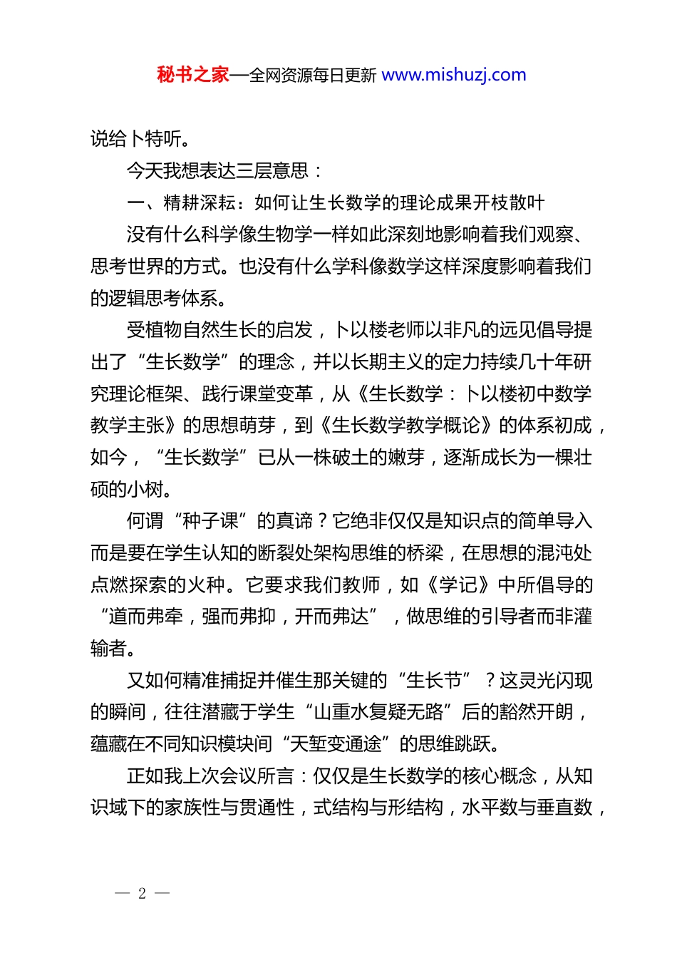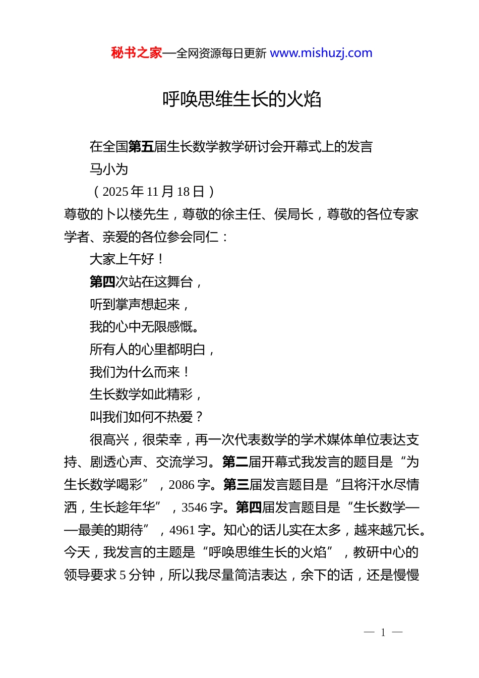 秘书之家—全网资源每日更新 www.mishuzj.com呼唤思维生长的火焰在全国第五届生长数学教学研讨会开幕式上的发言马小为(2025 年 11 月 18 日)尊敬的卜以楼先生,尊敬的徐主任、侯局长,尊敬的各位专家学者、亲爱的各位参会同仁:大家上午好!第四次站在这舞台,听到掌声想起来,我的心中无限感慨。所有人的心里都明白,我们为什么而来!生长数学如此精彩,叫我们如何不热爱?很高兴,很荣幸,再一次代表数学的学术媒体单位表达支持、剧透心声、交流学习。第二届开幕式我发言的题目是“为生长数学喝彩”,2086 字。第三届发言题目是“且将汗水尽情洒,生长趁年华”,3546 字。第四届发言题目是“生长数学——最美的期待”,4961 字。知心的话儿实在太多,越来越冗长。今天,我发言的主题是“呼唤思维生长的火焰”,教研中心的领导要求 5 分钟,所以我尽量简洁表达,余下的话,还是慢慢— 1 —秘书之家—全网资源每日更新 www.mishuzj.com说给卜特听。今天我想表达三层意思:一、精耕深耘:如何让生长数学的理论成果开枝散叶没有什么科学像生物学一样如此深刻地影响着我们观察、思考世界的方式。也没有什么学科像数学这样深度影响着我们的逻辑思考体系。受植物自然生长的启发,卜以楼老师以非凡的远见倡导提出了“生长数学”的理念,并以长期主义的定力持续几十年研究理论框架、践行课堂变革,从《生长数学:卜以楼初中数学教学主张》的思想萌芽,到《生长数学教学概论》的体系初成,如今,“生长数学”已从一株破土的嫩芽,逐渐成长为一棵壮硕的小树。何谓“种子课”的真谛?它绝非仅仅是知识点的简单导入而是要在学生认知的断裂处架构思维的桥梁,在思想的混沌处点燃探索的火种。它要求我们教师,如《学记》中所倡导的“道而弗牵,强而弗抑,开而弗达”,做思维的引导者而非灌输者。又如何精准捕捉并催生那关键的“生长节”?这灵光闪现的瞬间,往往潜藏于学生“山重水复疑无路”后的豁然开朗,蕴藏在不同知识模块间“天堑变通途”的思维跳跃。正如我上次会议所言:仅仅是生长数学的核心概念,从知识域下的家族性与贯通性,式结构与形结构,水平数与垂直数,— 2 —秘书之家—全网资源每日更新 www.mishuzj.com“形内外”与“数正负”;到学习域下的控制变量与“一有尽有”,形异实同与形同实异,定性把握与定量刻画,“六化”处理与抽屉定位;再到教学域下的生长节与硬核芯,最近联想与生长念头,枝繁叶茂与根系充盈,雕塑式板书与可视化表达。没有复杂的绕圈子、卖关子,全是结构化的理论建构和可重复的实践干货,卜特个人谦卑低调,很多人并不知晓,其身边群体研发团队的井喷式成果和卓越成就,已经被全国越来越多的人看到!“诗玉要烧三日满,辨材须待七年期。”“莫道浮云终蔽日,严冬过尽绽春蕾。”还有即将面世的《再论》与《新论》的宏伟蓝图,其理论架构已展现出日臻完善的清晰脉络,其课堂实践已迸发出蓬勃旺盛的生命张力。“生长数学”已经在从“理论高地”向“教学实地”进行华美转身和深度落地。要让“它”成长为根系发达、枝繁叶茂的参天大树,必须给它更多的阳光、养料、水分和空间。因此,我们当下的首要使命,是推动“生长数学”的实验田从小作坊走向大天地!“生长数学”是卜以楼老师研究团队的汗水和智慧,更是宁海的光芒,是鼓楼的精彩,是南京的荣耀,是江苏的自豪,是中国数学教育研究颠覆性创新的杰出代表!我们更想看到的是浪花飞溅的活学活用,波涛奔涌的落地— 3 —秘书之家—全网资源每日更新 www.mishuzj.com践行!《中数参》自当以此为己任,也期待鼓楼区、南京市更多的领导和同仁共谋共助,聚力功成!我提议:下一届研讨会上,我们可否倡导:共读一本书——《生长数学教学概论》,优秀学人的阅读分享!共创一节课:生长数学思维创新教学设计的课堂落地,全国智慧的共创共启!此处,我有点期待认同的掌声!二、继往开来:擘画生长数学系统研究的五维新图景回望上一届太仓盛会,我满怀期待地提出了生长数学未来发展的“五个方向”:课题众创、理论拓展、学段跨越、时代融合、媒体助推。欣慰的是,我们看到了诸位同仁已经在这条路...