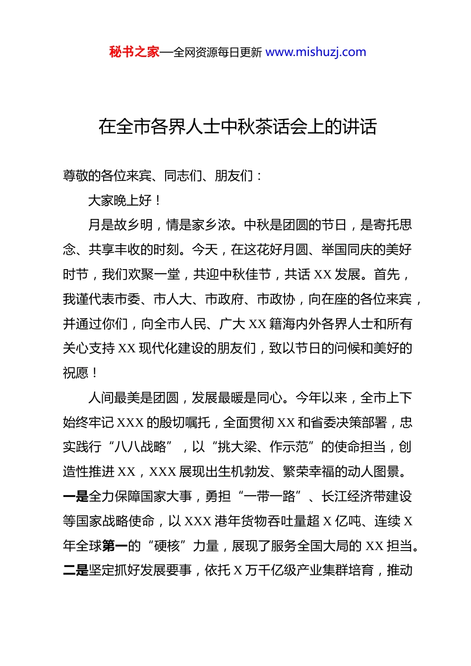 秘书之家—全网资源每日更新 www.mishuzj.com在全市各界人士中秋茶话会上的讲话尊敬的各位来宾、同志们、朋友们:大家晚上好!月是故乡明,情是家乡浓。中秋是团圆的节日,是寄托思念、共享丰收的时刻。今天,在这花好月圆、举国同庆的美好时节,我们欢聚一堂,共迎中秋佳节,共话 XX 发展。首先,我谨代表市委、市人大、市政府、市政协,向在座的各位来宾,并通过你们,向全市人民、广大 XX 籍海内外各界人士和所有关心支持 XX 现代化建设的朋友们,致以节日的问候和美好的祝愿!人间最美是团圆,发展最暖是同心。今年以来,全市上下始终牢记 XXX 的殷切嘱托,全面贯彻 XX 和省委决策部署,忠实践行“八八战略”,以“挑大梁、作示范”的使命担当,创造性推进 XX,XXX 展现出生机勃发、繁荣幸福的动人图景。一是全力保障国家大事,勇担“一带一路”、长江经济带建设等国家战略使命,以 XXX 港年货物吞吐量超 X 亿吨、连续 X年全球第一的“硬核”力量,展现了服务全国大局的 XX 担当。二是坚定抓好发展要事,依托 X 万千亿级产业集群培育,推动秘书之家—全网资源每日更新 www.mishuzj.com高新技术产业投资增长 X%,以创新动能支撑了全市地区生产总值 X%的快速增长。三是用心办好民生实事,将 X%的财政支出用于民生领域,高质量办成 XXX 等民生实事 X 项,切实增进了千万 XX 人民的福祉。这些成绩的取得,凝聚着全市各条战线干部群众的辛劳和智慧,饱含着各民主党派、工商联、无党派人士、各人民团体和社会各界人士的同心与合力,也离不开广大港澳台同胞、海外侨胞和在外 XX 人士的关心与支持。在此,我向大家表示衷心的感谢!心在一起,就是团圆;干在一起,就有力量。这份力量,源于我们共同的信念,成于我们一致的步伐。面向未来,我们要将这份同心同德,转化为推动 XX 高质量发展的具体行动:一要固守圆心,把牢政治“方向盘”,在同心同向上彰显更高站位。这个圆心,就是坚持党的领导,就是坚持和发展中国特色社会主义。我们要以习近平新时代中国特色社会主义思想定向领航,深刻领悟“两个确立”的决定性意义,将“四个意识”“四个自信两个维护”熔铸于灵魂、见诸于行动。具体而言,就是要将 XX“4+1”重要要求和省委“132”总体部署,与市委、市政府的中心工作紧密结合、一体推进,确保中央和省委的宏阔蓝图在 XX 大地精准落地,转化为波澜壮阔的“施工秘书之家—全网资源每日更新 www.mishuzj.com图”与气象万千的“实景画”。二要拉长半径,拓展发展“同心圆”,在实干笃行中展现更大作为。半径的长度,决定发展的格局与气度。半径延伸一尺,发展的疆域就拓宽一丈。我们要紧紧围绕高质量发展这一首要任务,将“同心圆”的半径延伸到经济社会发展的每一个角落,全力支持各民主党派、工商联、无党派人士和各界精英,聚焦“361”万千亿级产业集群建设、全球数字贸易中心打造、高水平创新型城市构建等战略任务,建睿智之言、献务实之策、行监督之责。要全面激发全体民营企业的创新活力,弘扬“XX”精神,鼓励他们在先进制造、科技创新、开拓国际市场等方面勇立新功。三要扩大圆周,汇聚奋斗“强磁场”,在团结联合中凝聚更强合力。圆周越长,团结的力量就越大;力量越大,事业的根基就越牢。要坚持大团结大联合,持续深化与各民主党派、工商联、无党派人士的合作共事,密切与党外知识分子、民族宗教界人士、新的社会阶层人士的联系沟通,加强同港澳台同胞、海外侨胞和 XX 籍乡贤的联谊交流,使大家心往一处想、劲往一处使。要搭建联谊沟通平台,持续深化“发展大会”“乡贤之家”等平台,完善常态化联络机制,畅通意见表达渠道,最广泛地凝聚各界智慧与力量。秘书之家—全网资源每日更新 www.mishuzj.com长风破浪会有时,直挂云帆济沧海。同志们,朋友们,XX发展的蓝图已经绘就,前进的号角已经吹响。让我们更加紧密地团结起来,弘扬爱国爱乡、创新创业、向上向善、开放开明的优良传统,汇聚全体 XX 人民和 XX 籍海内外人士的智慧和力量,以最强合力在新时代新征程上干出新的优异业绩!今天,在这个充满温情与感动的传统佳节...