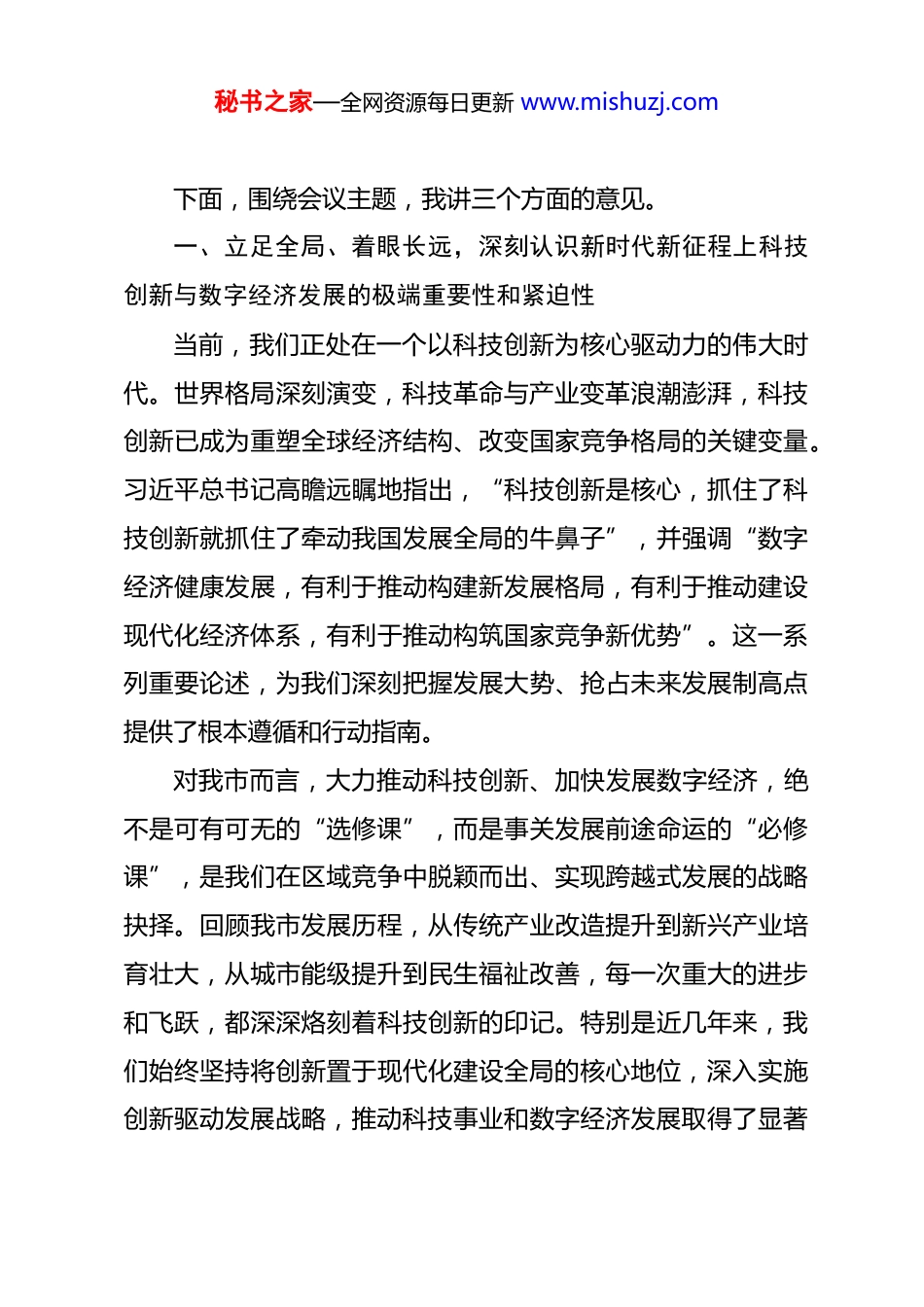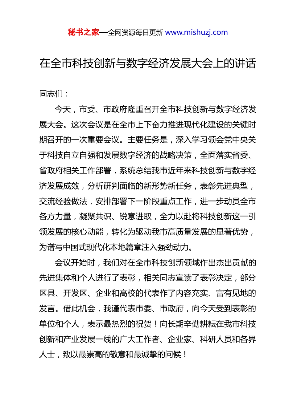秘书之家—全网资源每日更新 www.mishuzj.com在全市科技创新与数字经济发展大会上的讲话同志们:今天,市委、市政府隆重召开全市科技创新与数字经济发展大会。这次会议是在全市上下奋力推进现代化建设的关键时期召开的一次重要会议。主要任务是,深入学习领会党中央关于科技自立自强和发展数字经济的战略决策,全面落实省委、省政府相关工作部署,系统总结我市近年来科技创新与数字经济发展成效,分析研判面临的新形势新任务,表彰先进典型,交流经验做法,安排部署下一阶段重点工作,进一步动员全市各方力量,凝聚共识、锐意进取,全力以赴将科技创新这一引领发展的核心动能,转化为驱动我市高质量发展的显著优势,为谱写中国式现代化本地篇章注入强劲动力。会议开始时,我们对在全市科技创新领域作出杰出贡献的先进集体和个人进行了表彰,相关同志宣读了表彰决定,部分区县、开发区、企业和高校的代表作了内容充实、富有见地的发言。借此机会,我谨代表市委、市政府,向今天受到表彰的单位和个人,表示最热烈的祝贺!向长期辛勤耕耘在我市科技创新和产业发展一线的广大工作者、企业家、科研人员和各界人士,致以最崇高的敬意和最诚挚的问候!秘书之家—全网资源每日更新 www.mishuzj.com下面,围绕会议主题,我讲三个方面的意见。一、立足全局、着眼长远,深刻认识新时代新征程上科技创新与数字经济发展的极端重要性和紧迫性当前,我们正处在一个以科技创新为核心驱动力的伟大时代。世界格局深刻演变,科技革命与产业变革浪潮澎湃,科技创新已成为重塑全球经济结构、改变国家竞争格局的关键变量。习近平总书记高瞻远瞩地指出,“科技创新是核心,抓住了科技创新就抓住了牵动我国发展全局的牛鼻子”,并强调“数字经济健康发展,有利于推动构建新发展格局,有利于推动建设现代化经济体系,有利于推动构筑国家竞争新优势”。这一系列重要论述,为我们深刻把握发展大势、抢占未来发展制高点提供了根本遵循和行动指南。对我市而言,大力推动科技创新、加快发展数字经济,绝不是可有可无的“选修课”,而是事关发展前途命运的“必修课”,是我们在区域竞争中脱颖而出、实现跨越式发展的战略抉择。回顾我市发展历程,从传统产业改造提升到新兴产业培育壮大,从城市能级提升到民生福祉改善,每一次重大的进步和飞跃,都深深烙刻着科技创新的印记。特别是近几年来,我们始终坚持将创新置于现代化建设全局的核心地位,深入实施创新驱动发展战略,推动科技事业和数字经济发展取得了显著秘书之家—全网资源每日更新 www.mishuzj.com成就。聚焦创新投入,全市研发经费投入强度持续攀升,已跻身全国先进行列;聚焦创新主体,高新技术企业数量实现快速增长,创新型企业集群不断壮大;聚焦数字经济,核心产业增加值占地区生产总值的比重稳步提高,展现出强劲的发展势头;同时,一批高能级的创新平台和载体加快建设,创新基础设施日益完善,为我市高质量发展积攒了宝贵家底、奠定了坚实基础。在肯定成绩的同时,我们必须保持清醒的头脑,正视存在的短板与不足。客观来看,我市科技创新体系整体效能有待提升,特别是在基础研究和原始创新领域,具有重大影响力的原创性成果还不多;在产业技术层面,部分关键核心环节仍受制于人,“断点”、“堵点”问题亟待破解;具有全球竞争力和行业引领力的龙头科技企业相对缺乏,高层次创新人才尤其是顶尖领军人才和团队的引进培育仍需加强。数字经济发展方面,规模体量有了较大提升,但发展质量和核心竞争力有待增强,数据作为关键生产要素的价值潜能尚未充分释放,其在驱动产业升级、赋能社会治理等方面的作用有待进一步深化。面对前有标兵、后有追兵的激烈竞争态势,面对不进则退、慢进亦退的严峻挑战,全市上下必须进一步增强忧患意识、机遇意识和责任意识,切实把科技创新和数字经济发展摆在更加突出、更秘书之家—全网资源每日更新 www.mishuzj.com加优先的战略位置,以更大的决心、更强的力度、更实的举措,奋力在这条关乎未来的赛道上抢占先机、赢得主动。二、明确目标、聚焦重点,奋力开创我市科技创新与数字经济发展新局面做好当前和今后一个时期...