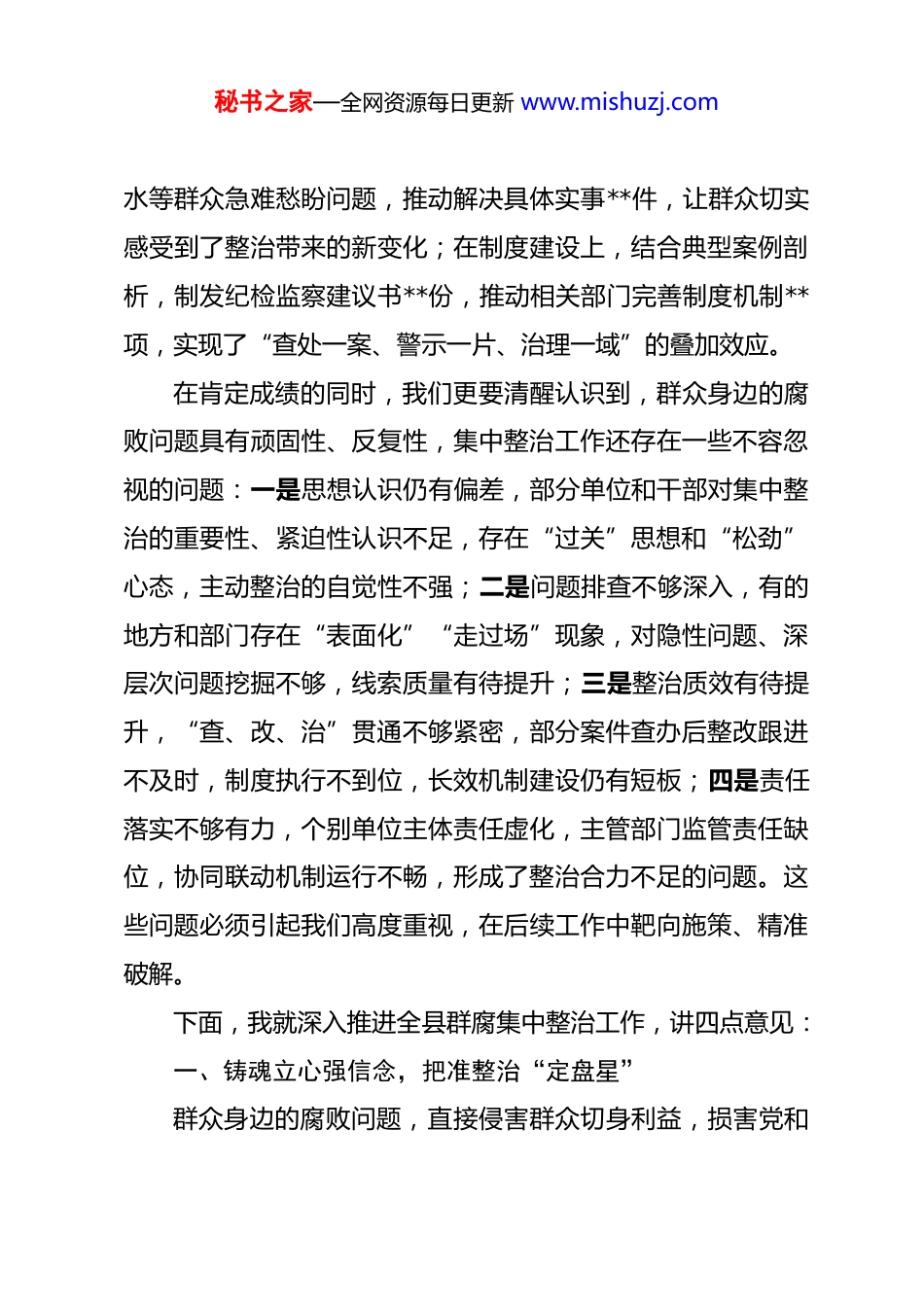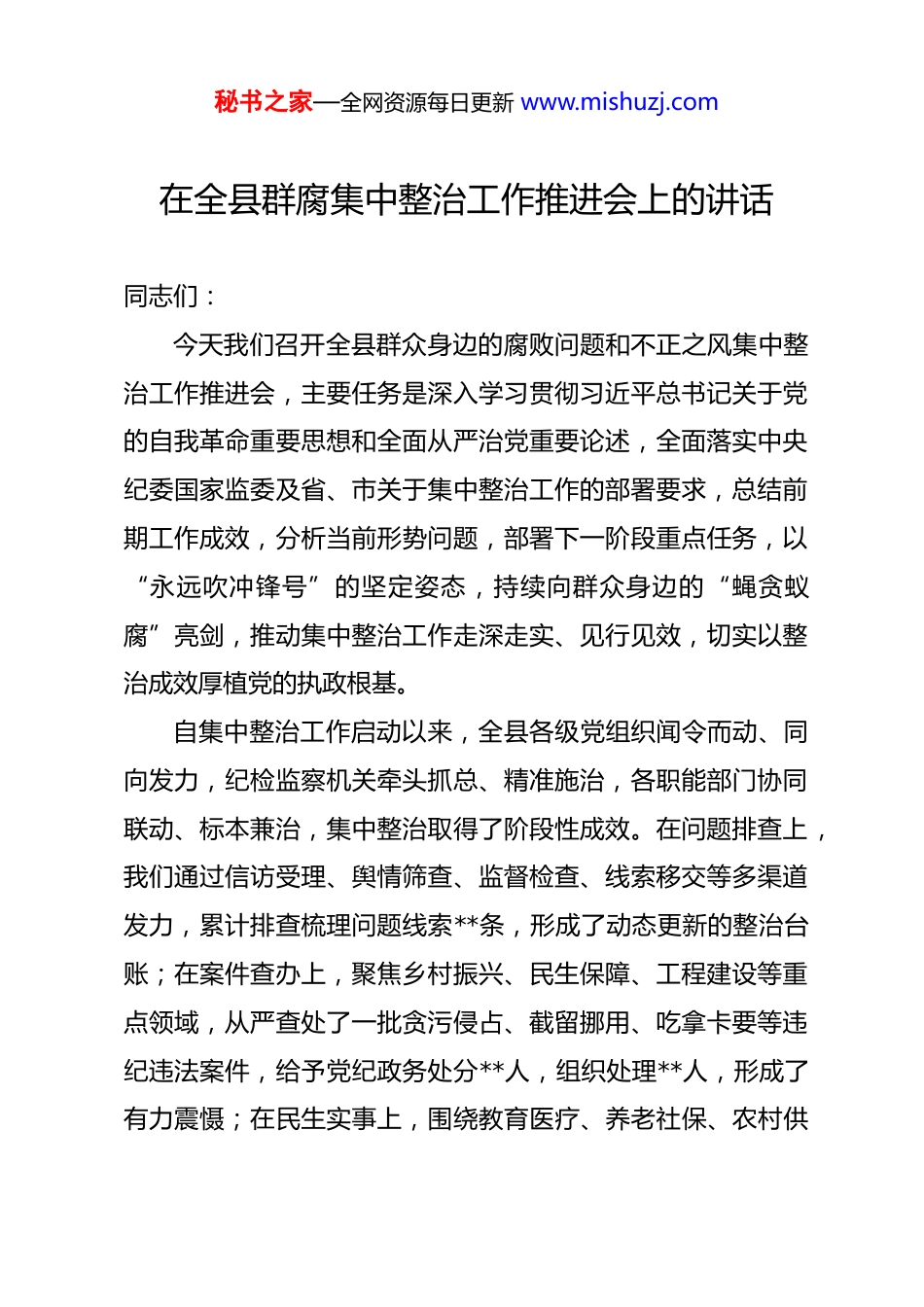 秘书之家—全网资源每日更新 www.mishuzj.com在全县群腐集中整治工作推进会上的讲话 同志们:今天我们召开全县群众身边的腐败问题和不正之风集中整治工作推进会,主要任务是深入学习贯彻习近平总书记关于党的自我革命重要思想和全面从严治党重要论述,全面落实中央纪委国家监委及省、市关于集中整治工作的部署要求,总结前期工作成效,分析当前形势问题,部署下一阶段重点任务,以“永远吹冲锋号”的坚定姿态,持续向群众身边的“蝇贪蚁腐”亮剑,推动集中整治工作走深走实、见行见效,切实以整治成效厚植党的执政根基。自集中整治工作启动以来,全县各级党组织闻令而动、同向发力,纪检监察机关牵头抓总、精准施治,各职能部门协同联动、标本兼治,集中整治取得了阶段性成效。在问题排查上,我们通过信访受理、舆情筛查、监督检查、线索移交等多渠道发力,累计排查梳理问题线索**条,形成了动态更新的整治台账;在案件查办上,聚焦乡村振兴、民生保障、工程建设等重点领域,从严查处了一批贪污侵占、截留挪用、吃拿卡要等违纪违法案件,给予党纪政务处分**人,组织处理**人,形成了有力震慑;在民生实事上,围绕教育医疗、养老社保、农村供秘书之家—全网资源每日更新 www.mishuzj.com水等群众急难愁盼问题,推动解决具体实事**件,让群众切实感受到了整治带来的新变化;在制度建设上,结合典型案例剖析,制发纪检监察建议书**份,推动相关部门完善制度机制**项,实现了“查处一案、警示一片、治理一域”的叠加效应。在肯定成绩的同时,我们更要清醒认识到,群众身边的腐败问题具有顽固性、反复性,集中整治工作还存在一些不容忽视的问题:一是思想认识仍有偏差,部分单位和干部对集中整治的重要性、紧迫性认识不足,存在“过关”思想和“松劲”心态,主动整治的自觉性不强;二是问题排查不够深入,有的地方和部门存在“表面化”“走过场”现象,对隐性问题、深层次问题挖掘不够,线索质量有待提升;三是整治质效有待提升,“查、改、治”贯通不够紧密,部分案件查办后整改跟进不及时,制度执行不到位,长效机制建设仍有短板;四是责任落实不够有力,个别单位主体责任虚化,主管部门监管责任缺位,协同联动机制运行不畅,形成了整治合力不足的问题。这些问题必须引起我们高度重视,在后续工作中靶向施策、精准破解。下面,我就深入推进全县群腐集中整治工作,讲四点意见:一、铸魂立心强信念,把准整治“定盘星”群众身边的腐败问题,直接侵害群众切身利益,损害党和秘书之家—全网资源每日更新 www.mishuzj.com政府的公信力,是侵蚀党的执政根基的“绊脚石”。习近平总书记反复强调,“人民群众反对什么、痛恨什么,我们就要坚决防范和打击”“只要存在腐败问题产生的土壤和条件,反腐败斗争就一刻不能停,必须永远吹冲锋号”。全县各级党组织和广大党员干部必须提高政治站位,深刻认识集中整治的重大意义,切实增强推进工作的政治自觉、思想自觉和行动自觉。(一)提高政治站位,深刻把握群腐整治的政治属性。开展群众身边腐败集中整治,是坚定拥护“两个确立”、坚决做到“两个维护”的具体实践,是践行以人民为中心发展思想的必然要求,是纵深推进全面从严治党向基层延伸的重要举措。各级党组织要始终把政治建设摆在首位,把集中整治作为重要政治任务,从关乎人心向背、关乎事业兴衰的高度,不折不扣落实各项整治要求,以实际行动回应党中央和省委、市委的重托,回应群众的殷切期盼。(二)站稳人民立场,深刻把握群腐整治的民生导向。“蝇贪蚁腐”虽小,危害极大。从近年来查处的案件来看,有的干部截留挪用乡村振兴补助资金,有的在医保报销中虚报冒领,有的在入学就业中吃拿卡要,这些问题看似“微腐败”,却直接啃食群众的“获得感”、损害群众的“幸福感”、影响群众的“安全感”。各级各部门要始终站稳人民立场,把群众秘书之家—全网资源每日更新 www.mishuzj.com满意作为检验整治成效的根本标准,聚焦群众反映强烈的突出问题,精准发力、重拳整治,让群众感受到公平正义就在身边。(三)增强斗争精神,深刻把握群腐整治的实践要求。当前,腐败问题产生的土壤和条...