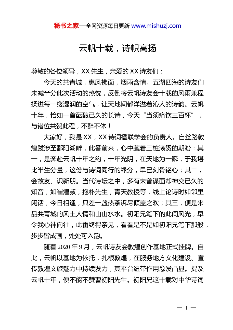 秘书之家—全网资源每日更新 www.mishuzj.com云帆十载,诗帜高扬尊敬的各位领导,XX 先生,亲爱的 XX 诗友们:今天的共青城,惠风拂面,烟雨含情。五湖四海的诗友们未减半分此次活动的热忱,反倒将云帆诗友会十载的风雨兼程揉进每一缕湿润的空气,让天地间都洋溢着沁人的诗韵。云帆十年,恰如一首酝酿已久的长诗,今天“当须痛饮三百杯”,与诸位共贺此程,不醉不休!大家好,我是 XX,XX 诗词楹联学会的负责人。自丝路敦煌跋涉至鄱阳湖畔,此番前来,心中藏着三桩滚烫的期盼:其一,是奔赴云帆十年之约,十年光阴,在天地为一瞬,于我堪比半生分量,这份与诗词同行的缘分,早已刻骨铭心;其二,会故友、识新朋。当代诗坛之中,多有未曾谋面却神交已久的知音,如崔煌叔,抱朴先生,青天教授等,线上论诗时如邻里闲话,今日相逢,只差一盏热茶诉尽倾盖之欢;其三,便是来品共青城的风土人情和山山水水。初阳兄笔下的此间风光,早令我心神向往,此番终得亲见,看看是不是如初阳兄笔下那般,步步皆成画,处处可入韵。随着 2020 年 9 月,云帆诗友会敦煌创作基地正式挂牌。自此,云帆以基地为依托,扎根敦煌,在服务地方文化建设、宣传敦煌文旅魅力中持续发力,其平台纽带作用愈发凸显。提及云帆十年,便不能不赞曹初阳先生。初阳兄这十载对中华诗词— 1 —秘书之家—全网资源每日更新 www.mishuzj.com的守望,从不是案头冰冷的数字,而是浸润在每一位诗友笔尖的成长,是藏在每一次雅集里的温暖。恰似敦煌月牙泉边的引路人,在诗词的戈壁中跋涉时,不忘将那汪滋养灵感的清泉,捧予每一个追寻诗意的同路人。犹记某夜,我将新作匆匆传与初阳兄,原以为待次日方得回音,未料五分钟后便收到他的信息,让人感动不已。末了那句“兄弟,咱们立平台、聚诗友,不为名禄,只为心头这份对诗词的赤诚。你这稿子里有敦煌的风沙气、有大漠的豪情,当登云帆头条!”,至今仍暖我心。在此,请允许我代众诗友,向初阳兄道一声:您辛苦了!这十年诗路,如不知疲倦的行者,昼夜奔忙,为诗友审稿至深夜,为雅集筹备至黎明。他以一己之力,艰难的扛起诗词大旗,将每个诗友的心愿都视作己任。这般坚守,恰如“春风织就千重锦,吹暖人间诗酒茶”,让云帆从一株幼苗,长成如今的参天大树。初阳兄是中华诗词发展的贡献者,更是我辈心中的举旗人!我与初阳兄的交契,少不了雨涵萧兄的牵线。雨涵兄常笑言,咱仨是好基友,胜似金兰,还总叮嘱:“挚友之道,当如诗词唱和,彼此扶持,彼此照亮,方能让寻常岁月满是诗味。”这番话,我始终铭记。当年雨涵兄引我与初阳兄相见,一句“竹松,此乃初阳,性情磊落如你,诗心澄澈如你,二位定能成莫逆之交”,这一番话便开启了我们这段惺惺相惜的缘分。这份情义,如鸣沙山与月牙泉,相守相依而不变。世人常— 2 —秘书之家—全网资源每日更新 www.mishuzj.com说今时友谊如蒲公英,风过即散,可我与初阳兄、雨涵兄、清辉兄还有好些老朋友的情分,却能经风雨而弥坚,任岁月而弥厚。今天置身共青城,参加云帆十周年之庆,心中满是欢喜与激动。这片土地,山含秀色,水带柔情,与敦煌的“大漠孤烟直,长河落日圆”的苍凉之美截然不同,却同样让人心魂沉醉。同时,感谢云帆诗友会所有工作人员将云帆打造成了诗友们的精神家园!无论大家来自何方,身居何职,只要心怀诗梦,便能在云帆寻得知音,共话诗词。值此,感谢共青城对全国诗人之美意与盛情,愿云帆诗友会下一个十年,能如鄱阳湖般,纳百川而壮阔,承诗脉而辉煌;愿我们大家能伴着诗词,跨越山海,直至岁月尽头;更愿在座每一位诗友,都能笔底生花,写出可慰己心、可悦世人的佳作,将往后的每一段时光,都过成诗中最动人的模样!最后,诗与远方,如梦敦煌欢迎大家的到来!— 3 —