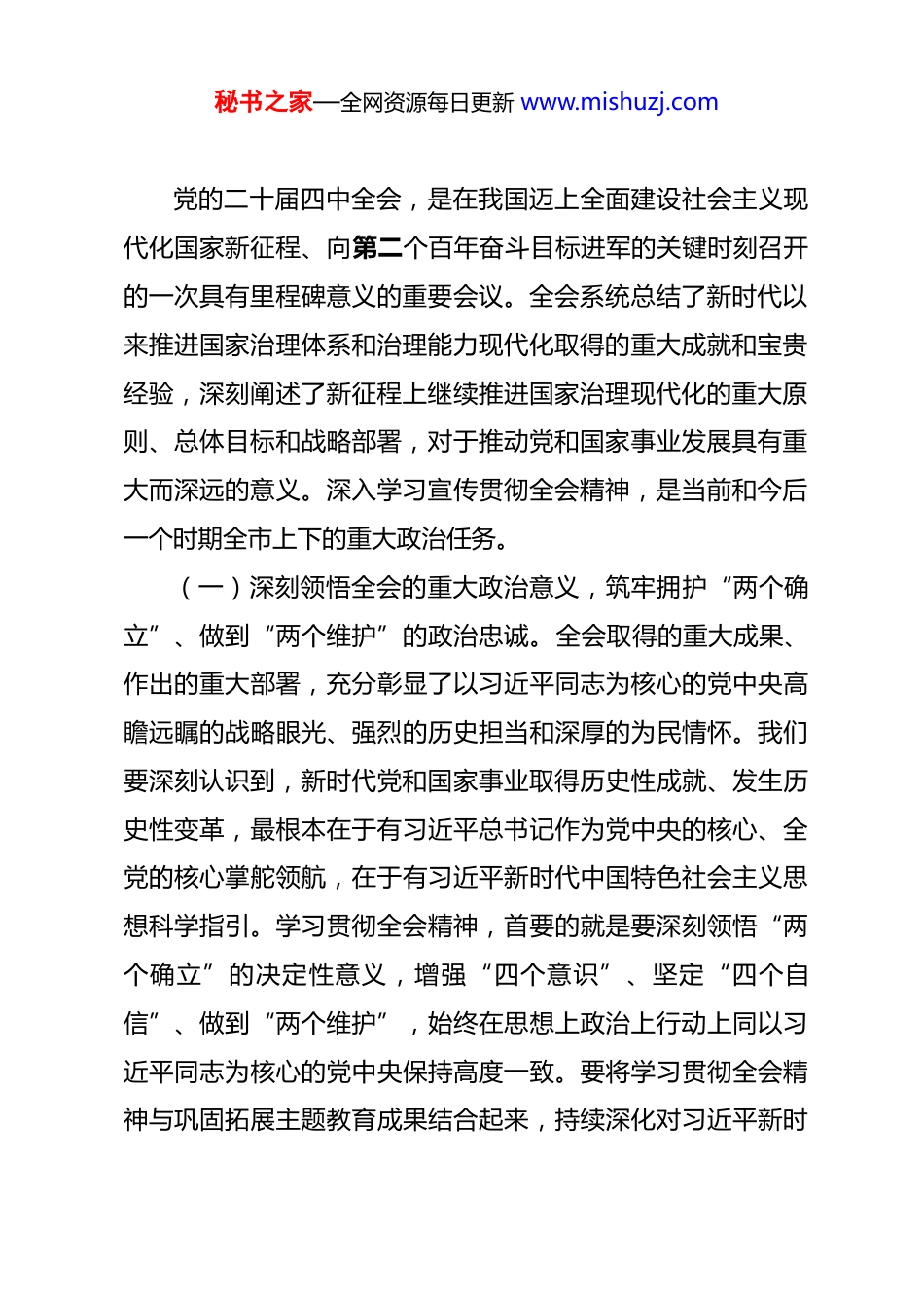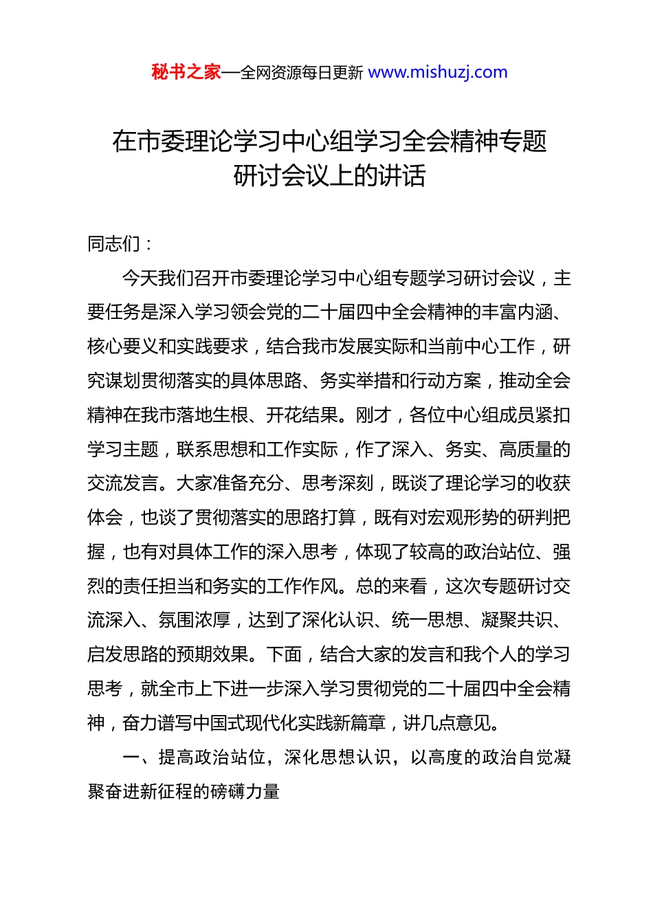 秘书之家—全网资源每日更新 www.mishuzj.com在市委理论学习中心组学习全会精神专题研讨会议上的讲话 同志们:今天我们召开市委理论学习中心组专题学习研讨会议,主要任务是深入学习领会党的二十届四中全会精神的丰富内涵、核心要义和实践要求,结合我市发展实际和当前中心工作,研究谋划贯彻落实的具体思路、务实举措和行动方案,推动全会精神在我市落地生根、开花结果。刚才,各位中心组成员紧扣学习主题,联系思想和工作实际,作了深入、务实、高质量的交流发言。大家准备充分、思考深刻,既谈了理论学习的收获体会,也谈了贯彻落实的思路打算,既有对宏观形势的研判把握,也有对具体工作的深入思考,体现了较高的政治站位、强烈的责任担当和务实的工作作风。总的来看,这次专题研讨交流深入、氛围浓厚,达到了深化认识、统一思想、凝聚共识、启发思路的预期效果。下面,结合大家的发言和我个人的学习思考,就全市上下进一步深入学习贯彻党的二十届四中全会精神,奋力谱写中国式现代化实践新篇章,讲几点意见。一、提高政治站位,深化思想认识,以高度的政治自觉凝聚奋进新征程的磅礴力量秘书之家—全网资源每日更新 www.mishuzj.com党的二十届四中全会,是在我国迈上全面建设社会主义现代化国家新征程、向第二个百年奋斗目标进军的关键时刻召开的一次具有里程碑意义的重要会议。全会系统总结了新时代以来推进国家治理体系和治理能力现代化取得的重大成就和宝贵经验,深刻阐述了新征程上继续推进国家治理现代化的重大原则、总体目标和战略部署,对于推动党和国家事业发展具有重大而深远的意义。深入学习宣传贯彻全会精神,是当前和今后一个时期全市上下的重大政治任务。(一)深刻领悟全会的重大政治意义,筑牢拥护“两个确立”、做到“两个维护”的政治忠诚。全会取得的重大成果、作出的重大部署,充分彰显了以习近平同志为核心的党中央高瞻远瞩的战略眼光、强烈的历史担当和深厚的为民情怀。我们要深刻认识到,新时代党和国家事业取得历史性成就、发生历史性变革,最根本在于有习近平总书记作为党中央的核心、全党的核心掌舵领航,在于有习近平新时代中国特色社会主义思想科学指引。学习贯彻全会精神,首要的就是要深刻领悟“两个确立”的决定性意义,增强“四个意识”、坚定“四个自信”、做到“两个维护”,始终在思想上政治上行动上同以习近平同志为核心的党中央保持高度一致。要将学习贯彻全会精神与巩固拓展主题教育成果结合起来,持续深化对习近平新时秘书之家—全网资源每日更新 www.mishuzj.com代中国特色社会主义思想的学习领悟,不断提高政治判断力、政治领悟力、政治执行力,确保我市各项工作始终沿着习近平总书记指引的方向坚定前行,确保党中央各项决策部署在不折不扣落到实处。(二)深刻把握全会的重大理论意义,增强运用党的创新理论指导实践的思想自觉。全会围绕推进国家治理体系和治理能力现代化提出的一系列新思想、新论断、新要求,是习近平新时代中国特色社会主义思想的重要组成部分,进一步丰富和发展了马克思主义国家治理理论。我们要坚持读原著、学原文、悟原理,全面系统学习全会《决定》和习近平总书记重要讲话精神,准确把握其精神实质、核心要义和实践要求。要深刻理解关于坚持和完善中国特色社会主义制度、推进国家治理体系和治理能力现代化的重大原则、总体目标和重点任务,深刻理解关于发展全过程人民民主、建设社会主义法治国家、健全全面从严治党体系等一系列重大部署。要发扬理论联系实际的优良学风,自觉用党的创新理论观察新形势、研究新情况、解决新问题,切实把学习成果转化为谋划发展的正确思路、推动落实的具体举措、解决问题的实际成效,不断提升运用科学理论指导改革发展稳定各项工作的能力和水平。(三)深刻认识全会的重大实践意义,激发奋力推进中国秘书之家—全网资源每日更新 www.mishuzj.com式现代化实践的强大动力。全会擘画了新征程上国家治理现代化的宏伟蓝图,明确了时间表、路线图、任务书。这为我们立足实际,找准定位、发挥优势、担当作为提供了根本遵循和行动指南。我们要把学习贯彻全会精神与贯彻落实习近平总...