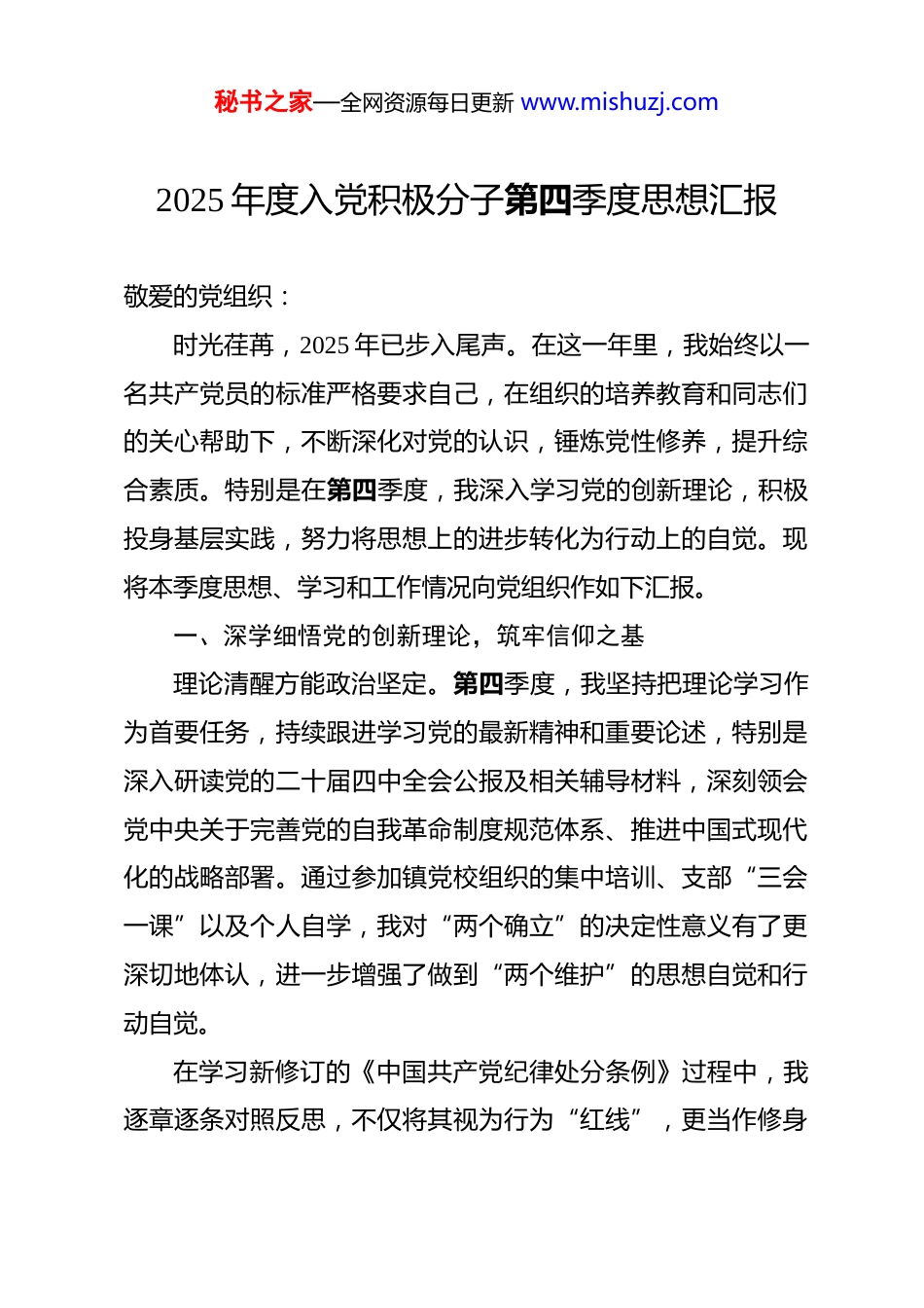 秘书之家—全网资源每日更新 www.mishuzj.com2025 年度入党积极分子第四季度思想汇报 敬爱的党组织:时光荏苒,2025 年已步入尾声。在这一年里,我始终以一名共产党员的标准严格要求自己,在组织的培养教育和同志们的关心帮助下,不断深化对党的认识,锤炼党性修养,提升综合素质。特别是在第四季度,我深入学习党的创新理论,积极投身基层实践,努力将思想上的进步转化为行动上的自觉。现将本季度思想、学习和工作情况向党组织作如下汇报。一、深学细悟党的创新理论,筑牢信仰之基理论清醒方能政治坚定。第四季度,我坚持把理论学习作为首要任务,持续跟进学习党的最新精神和重要论述,特别是深入研读党的二十届四中全会公报及相关辅导材料,深刻领会党中央关于完善党的自我革命制度规范体系、推进中国式现代化的战略部署。通过参加镇党校组织的集中培训、支部“三会一课”以及个人自学,我对“两个确立”的决定性意义有了更深切地体认,进一步增强了做到“两个维护”的思想自觉和行动自觉。在学习新修订的《中国共产党纪律处分条例》过程中,我逐章逐条对照反思,不仅将其视为行为“红线”,更当作修身秘书之家—全网资源每日更新 www.mishuzj.com“标尺”。条例中关于群众纪律、工作纪律的细化规定,让我深刻认识到,作为一名入党积极分子,必须从点滴做起,严守规矩、不逾底线。例如,在参与村级事务协助工作中,我始终坚持公开透明原则,凡涉及群众切身利益的事项,主动建议通过“阳光三务”平台公示,确保权力在阳光下运行。这种将纪律要求内化为日常习惯的过程,使我真切体会到“全面从严治党”不是抽象概念,而是体现在每一次言行选择之中。同时,我注重从中华优秀传统文化中汲取精神滋养。近期重读《论语》《孟子》等典籍,结合总书记关于“第二个结合”的重要论述,更加理解了马克思主义基本原理同中华优秀传统文化相结合的深厚底蕴。比如,“民为邦本”的思想与以人民为中心的发展思想一脉相承;“修齐治平”的理想追求与共产党人的初心使命高度契合。这种文化认同感,进一步坚定了我加入党组织、投身民族复兴伟业的决心。二、投身基层火热实践,砥砺为民初心纸上得来终觉浅,绝知此事要躬行。第四季度正值秋收冬藏、岁末年初的关键时期,我主动请缨参与多项基层重点工作,在服务群众中检验学习成效、践行初心使命。一是助力乡村振兴产业发展。我所在的村正大力发展特色果蔬种植,但部分农户因缺乏技术导致产量不稳。我利用所学秘书之家—全网资源每日更新 www.mishuzj.com农业知识,协助村“两委”联系县农技推广中心,组织 3 场田间培训,覆盖种植户 60 余人次。其间,我跟随技术员逐户走访,记录土壤墒情、病虫害情况,建立问题台账。78 岁的王大爷因腿脚不便无法到场,我连续一周上门送技术资料,并帮他调试滴灌设备。当看到他家大棚辣椒长势喜人时,老人握着我的手说:“你们这些年轻人肯下地,咱心里就有盼头!”这朴实的话语让我深刻体会到,所谓“为民服务”,就是要把群众的小事当作自己的大事来办。二是参与人居环境整治攻坚。为迎接省级卫生乡镇复审,全镇开展“清洁家园”专项行动。我担任网格责任员,负责 3个村民小组的环境督导。起初,个别村民对拆除乱搭乱建有抵触情绪。我没有简单下发整改通知,而是连续三天傍晚入户,用方言拉家常,讲清安全隐患,帮他们规划杂物收纳方案。最终,12 处违建全部自愿拆除,还主动参与公共区域清扫。在此过程中,我学会了用群众语言沟通,明白了“枫桥经验”的精髓在于依靠群众、发动群众。如今,村口那条曾经堆满柴草的小路,已变成铺着青砖、种着月季的“微景观”,孩子们放学后总爱在那里跳皮筋——这细微变化,正是我们工作的价值所在。三是投身民生保障一线。入冬以来,我配合民政专干开展秘书之家—全网资源每日更新 www.mishuzj.com困难群众走访摸排。在核查低保动态调整名单时,发现独居老人李奶奶因子女在外务工,未能及时更新赡养证明材料,面临停保风险。我立即协调村委会出具情况说明,并陪同她到镇便民服务中心补办手续。为防止类似问题发生,我还建议建立“特殊群体关爱档案”,对高龄、残...