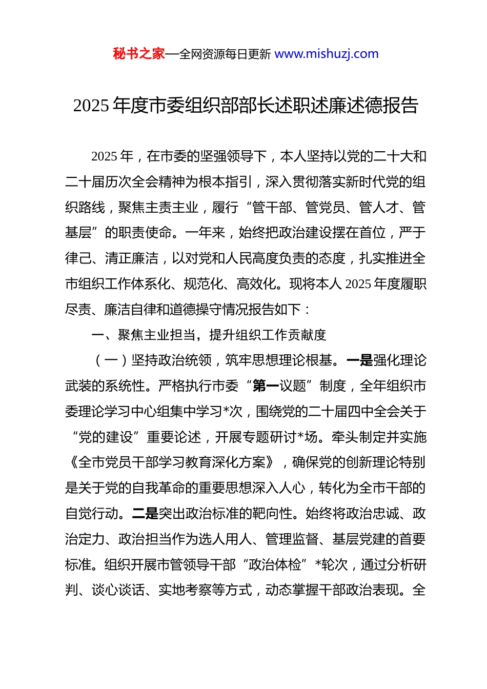 秘书之家—全网资源每日更新 www.mishuzj.com2025 年度市委组织部部长述职述廉述德报告 2025 年,在市委的坚强领导下,本人坚持以党的二十大和二十届历次全会精神为根本指引,深入贯彻落实新时代党的组织路线,聚焦主责主业,履行“管干部、管党员、管人才、管基层”的职责使命。一年来,始终把政治建设摆在首位,严于律己、清正廉洁,以对党和人民高度负责的态度,扎实推进全市组织工作体系化、规范化、高效化。现将本人 2025 年度履职尽责、廉洁自律和道德操守情况报告如下:一、聚焦主业担当,提升组织工作贡献度(一)坚持政治统领,筑牢思想理论根基。一是强化理论武装的系统性。严格执行市委“第一议题”制度,全年组织市委理论学习中心组集中学习*次,围绕党的二十届四中全会关于“党的建设”重要论述,开展专题研讨*场。牵头制定并实施《全市党员干部学习教育深化方案》,确保党的创新理论特别是关于党的自我革命的重要思想深入人心,转化为全市干部的自觉行动。二是突出政治标准的靶向性。始终将政治忠诚、政治定力、政治担当作为选人用人、管理监督、基层党建的首要标准。组织开展市管领导干部“政治体检”*轮次,通过分析研判、谈心谈话、实地考察等方式,动态掌握干部政治表现。全秘书之家—全网资源每日更新 www.mishuzj.com年举办市管干部政治能力提升专题培训班*期,培训干部*人次,确保各级领导班子和干部队伍在政治上坚如磐石。三是服务市委决策的支撑性。围绕市委年度重点工作,组织开展*次重大课题调研,如“激发人才创新活力的体制机制障碍破解”“新业态新就业群体党建融入城市治理”等,形成调研报告*份,为市委科学决策提供组织保障和数据支撑。(二)突出选贤任能,锻造堪当重任的干部队伍。一是优化领导班子结构。坚持好干部标准,注重在重大斗争一线识别、选拔和使用干部。全年对*个重点单位和*个区县领导班子进行调整优化,选拔*名优秀年轻干部充实到重要岗位,班子平均年龄下降*岁,专业化能力进一步增强。在推进*个重大项目攻坚过程中,提拔使用在现场解决问题、勇于担当的干部*名。二是健全精准化考核体系。探索构建与全市高质量发展要求相适应的干部评价体系,将“抓落实的效率、解决问题的能力、对群众的感情”作为考核核心指标。在*个区县试点推行年度考核与重大任务完成情况深度挂钩机制,对*名考核结果为“不称职”的干部进行调整或诫勉,真正让“能者上、优者奖、庸者下、劣者汰”成为常态。三是加大年轻干部培养力度。实施“墩苗壮骨”工程*项,选派*名年轻干部到基层一线、信访维稳、重点项目等急难险重岗位轮岗交流,接受实践淬炼。全年举办中秘书之家—全网资源每日更新 www.mishuzj.com青年干部培训班*期,新招录选调生和基层公务员*名,建立动态后备干部信息库*个,推动干部队伍梯队结构更加合理。(三)聚焦固本强基,增强基层组织功能。一是提升基层党组织政治功能。深入开展“五星级”基层党组织创建活动,全面推进市直机关、事业单位党建与业务深度融合。对*个后进村党组织进行集中整顿,选派*名优秀干部担任驻村第一书记和工作队员,推动村集体经济项目*个落地实施,带动*户脱贫户稳定增收。二是创新城市基层党建模式。针对城市治理痛点和新兴领域特点,推动党建工作向楼宇、商圈、园区、互联网企业延伸。在*个城市社区推行“红色物业”治理模式,将小区党组织、业委会、物业公司三方有效联动,解决群众反映强烈的物业管理难题*件。在新业态新就业群体(如外卖骑手、网约车司机)中组建临时党支部*个,开展主题活动*次,实现组织覆盖率提升*%。三是深化党员教育管理。常态化开展党纪学习教育,组织全市*万余名党员观看警示教育片、参观廉政基地*批次。严格执行“三会一课”、主题党日等组织生活制度,处置不合格党员*人,确保党员队伍纯洁性。(四)实施人才强市战略,激发创新创造活力。一是加大人才引进力度。围绕全市*个重点产业链,全年引进高层次人才*人,其中领军人才*人。组织开展“招才引智高校行”活动*场,秘书之家—全网资源每日更新 www.mishuzj.com签订校地合作项目*项。成功获批设立*个博士后科研工作站。...