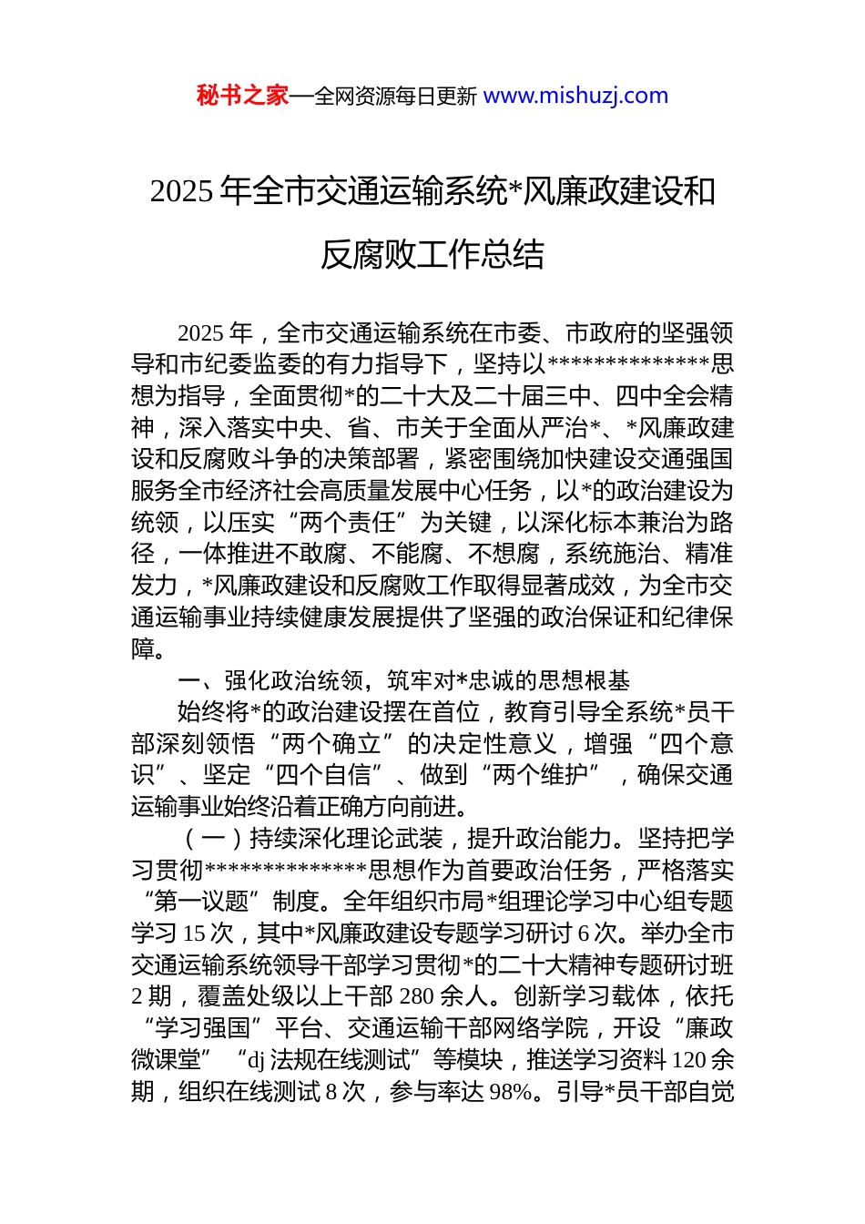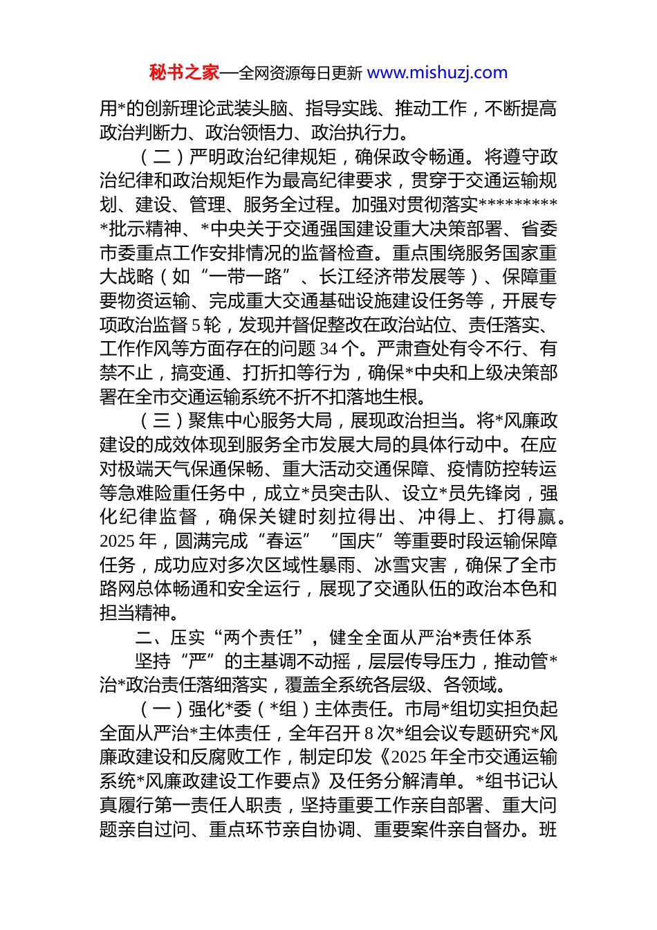 秘书之家—全网资源每日更新 www.mishuzj.com2025 年全市交通运输系统*风廉政建设和反腐败工作总结2025 年,全市交通运输系统在市委、市政府的坚强领导和市纪委监委的有力指导下,坚持以**************思想为指导,全面贯彻*的二十大及二十届三中、四中全会精神,深入落实中央、省、市关于全面从严治*、*风廉政建设和反腐败斗争的决策部署,紧密围绕加快建设交通强国服务全市经济社会高质量发展中心任务,以*的政治建设为统领,以压实“两个责任”为关键,以深化标本兼治为路径,一体推进不敢腐、不能腐、不想腐,系统施治、精准发力,*风廉政建设和反腐败工作取得显著成效,为全市交通运输事业持续健康发展提供了坚强的政治保证和纪律保障。一、强化政治统领,筑牢对*忠诚的思想根基始终将*的政治建设摆在首位,教育引导全系统*员干部深刻领悟“两个确立”的决定性意义,增强“四个意识”、坚定“四个自信”、做到“两个维护”,确保交通运输事业始终沿着正确方向前进。(一)持续深化理论武装,提升政治能力。坚持把学习贯彻**************思想作为首要政治任务,严格落实“第一议题”制度。全年组织市局*组理论学习中心组专题学习 15 次,其中*风廉政建设专题学习研讨 6 次。举办全市交通运输系统领导干部学习贯彻*的二十大精神专题研讨班2 期,覆盖处级以上干部 280 余人。创新学习载体,依托“学习强国”平台、交通运输干部网络学院,开设“廉政微课堂”“dj 法规在线测试”等模块,推送学习资料 120 余期,组织在线测试 8 次,参与率达 98%。引导*员干部自觉秘书之家—全网资源每日更新 www.mishuzj.com用*的创新理论武装头脑、指导实践、推动工作,不断提高政治判断力、政治领悟力、政治执行力。(二)严明政治纪律规矩,确保政令畅通。将遵守政治纪律和政治规矩作为最高纪律要求,贯穿于交通运输规划、建设、管理、服务全过程。加强对贯彻落实**********批示精神、*中央关于交通强国建设重大决策部署、省委市委重点工作安排情况的监督检查。重点围绕服务国家重大战略(如“一带一路”、长江经济带发展等)、保障重要物资运输、完成重大交通基础设施建设任务等,开展专项政治监督 5 轮,发现并督促整改在政治站位、责任落实、工作作风等方面存在的问题 34 个。严肃查处有令不行、有禁不止,搞变通、打折扣等行为,确保*中央和上级决策部署在全市交通运输系统不折不扣落地生根。(三)聚焦中心服务大局,展现政治担当。将*风廉政建设的成效体现到服务全市发展大局的具体行动中。在应对极端天气保通保畅、重大活动交通保障、疫情防控转运等急难险重任务中,成立*员突击队、设立*员先锋岗,强化纪律监督,确保关键时刻拉得出、冲得上、打得赢。2025 年,圆满完成“春运”“国庆”等重要时段运输保障任务,成功应对多次区域性暴雨、冰雪灾害,确保了全市路网总体畅通和安全运行,展现了交通队伍的政治本色和担当精神。二、压实“两个责任”,健全全面从严治*责任体系坚持“严”的主基调不动摇,层层传导压力,推动管*治*政治责任落细落实,覆盖全系统各层级、各领域。(一)强化*委(*组)主体责任。市局*组切实担负起全面从严治*主体责任,全年召开 8 次*组会议专题研究*风廉政建设和反腐败工作,制定印发《2025 年全市交通运输系统*风廉政建设工作要点》及任务分解清单。*组书记认真履行第一责任人职责,坚持重要工作亲自部署、重大问题亲自过问、重点环节亲自协调、重要案件亲自督办。班秘书之家—全网资源每日更新 www.mishuzj.com子成员严格落实“一岗双责”,定期研究、部署、检查和报告分管范围内的*风廉政建设工作,全年开展分管领域廉政风险排查和防控督导 60 余次。(二)支持纪检监察机构履行监督责任。全力支持派驻纪检监察组和系统内各级纪检监察机构依规依纪依法履行监督执纪问责职责。定期听取纪检监察工作汇报,及时研究解决监督执纪中遇到的困难和问题。深化纪检监察体制改革,优化内部监督力量配置,推动监督向基层延伸。保障纪检监察机构独立行使监督权,为其开展工作创造良好条件。2025 年,派驻纪检监察组提出监督建议 42 ...