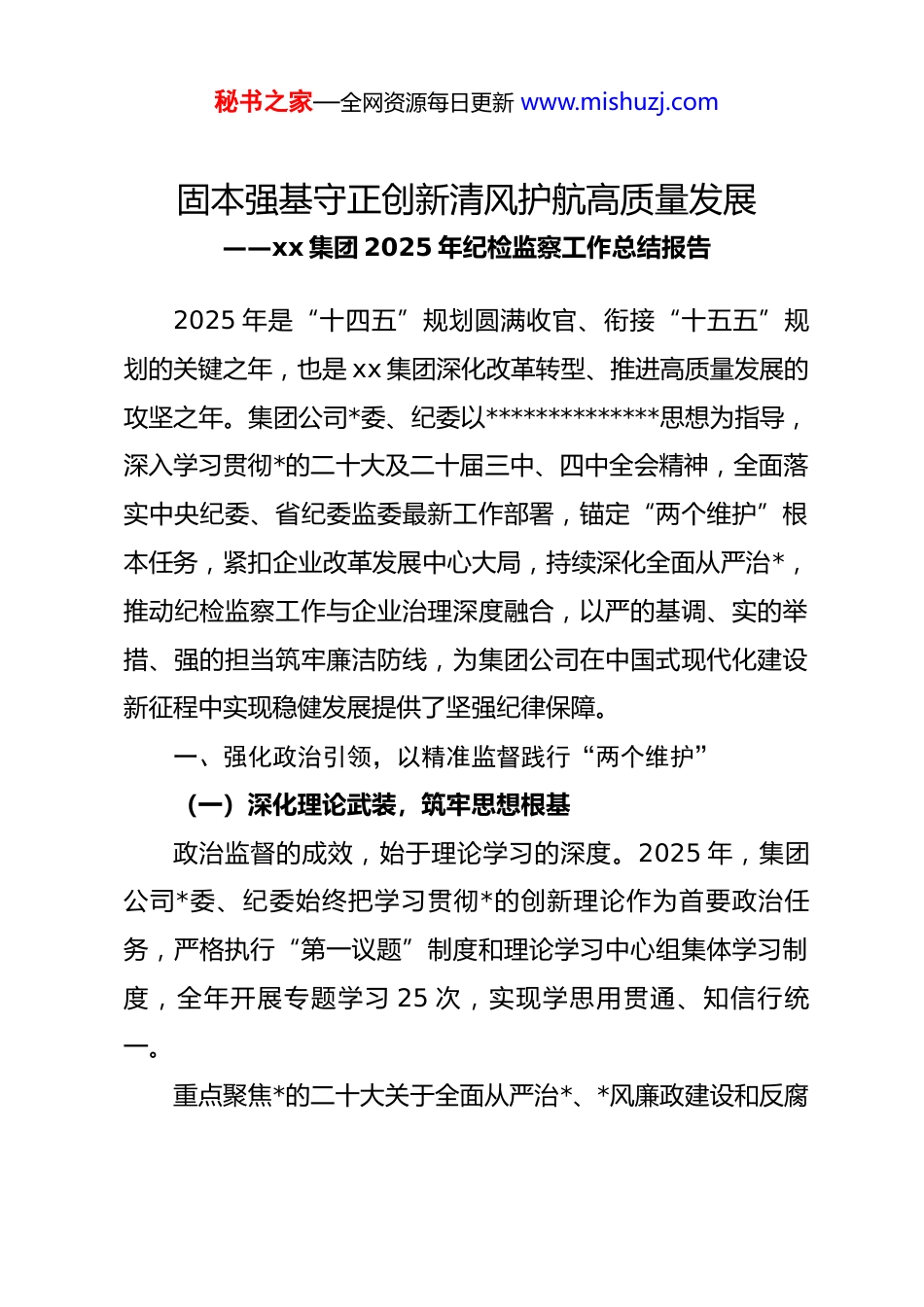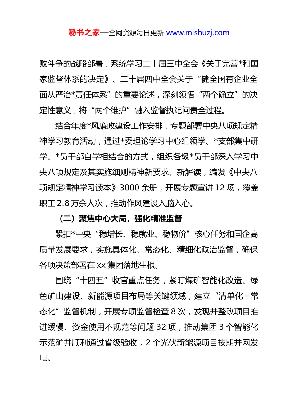 秘书之家—全网资源每日更新 www.mishuzj.com固本强基守正创新清风护航高质量发展——xx 集团 2025 年纪检监察工作总结报告2025 年是“十四五”规划圆满收官、衔接“十五五”规划的关键之年,也是 xx 集团深化改革转型、推进高质量发展的攻坚之年。集团公司*委、纪委以**************思想为指导,深入学习贯彻*的二十大及二十届三中、四中全会精神,全面落实中央纪委、省纪委监委最新工作部署,锚定“两个维护”根本任务,紧扣企业改革发展中心大局,持续深化全面从严治*,推动纪检监察工作与企业治理深度融合,以严的基调、实的举措、强的担当筑牢廉洁防线,为集团公司在中国式现代化建设新征程中实现稳健发展提供了坚强纪律保障。一、强化政治引领,以精准监督践行“两个维护”(一)深化理论武装,筑牢思想根基政治监督的成效,始于理论学习的深度。2025 年,集团公司*委、纪委始终把学习贯彻*的创新理论作为首要政治任务,严格执行“第一议题”制度和理论学习中心组集体学习制度,全年开展专题学习 25 次,实现学思用贯通、知信行统一。重点聚焦*的二十大关于全面从严治*、*风廉政建设和反腐秘书之家—全网资源每日更新 www.mishuzj.com败斗争的战略部署,系统学习二十届三中全会《关于完善*和国家监督体系的决定》、二十届四中全会关于“健全国有企业全面从严治*责任体系”的重要论述,深刻领悟“两个确立”的决定性意义,将“两个维护”融入监督执纪问责全过程。结合年度*风廉政建设工作安排,专题部署中央八项规定精神学习教育活动,通过*委理论学习中心组领学、*支部集中研学、*员干部自学相结合的方式,组织各级*员干部深入学习中央八项规定及其实施细则精神新要求、新解读,编发《中央八项规定精神学习读本》3000 余册,开展专题宣讲 12 场,覆盖职工 2.8 万余人次,推动作风建设入脑入心。(二)聚焦中心大局,强化精准监督紧扣*中央“稳增长、稳就业、稳物价”核心任务和国企高质量发展要求,实施具体化、常态化、精细化政治监督,确保各项决策部署在 xx 集团落地生根。围绕“十四五”收官重点任务,紧盯煤矿智能化改造、绿色矿山建设、新能源项目布局等关键领域,建立“清单化+常态化”监督机制,开展专项监督检查 8 次,发现并整改项目推进缓慢、资金使用不规范等问题 32 项,推动集团 3 个智能化示范矿井顺利通过省级验收,2 个光伏新能源项目按期并网发电。秘书之家—全网资源每日更新 www.mishuzj.com紧盯安全生产“生命线”,建立“纪检监察+安全监管”联动监督机制,开展动态监督检查 15 次,重点督查井下作业规范、安全隐患排查整治、职工安全培训等情况,对 3 家安全责任落实不到位的单位进行通报批评,对 8 名相关责任人进行问责,全年集团未发生重大安全生产责任事故。聚焦民生保障和职工关切,开展职工薪酬发放、社保缴纳、住房改善等民生领域专项整治,查处侵害职工利益问题 12起,为职工追回拖欠薪酬、补贴等共计 230 余万元;针对郑州地区汛期防汛工作要求,强化防汛物资储备、应急演练、重点区域防控等环节监督,保障职工生命财产安全,全年未发生防汛安全事故。紧盯国企改革深化任务,围绕混合所有制改革、子公司治理优化、“三项制度”改革等重点工作,跟进监督周例会、月度调度会落实情况,核查改革方案执行、资产处置、人员调整等事项 26 项,确保改革过程合规合法、公开透明。二、深化体系建设,以“五责协同”压实管*治*责任2025 年,集团公司*委、纪委持续深化“583”全面从严治*主体责任体系建设,以“五责协同”为牵引,做实做细“八大机制”,用足用好“三大载体”,推动管*治*责任层层传导、落地见效。秘书之家—全网资源每日更新 www.mishuzj.com(一)健全“五责协同”体制,凝聚监督合力进一步完善全面从严治*主体责任、纪委监督责任、*委书记第一责任人责任、纪委书记监督第一责任人责任、班子成员“一岗双责”的“五责协同”工作体制,制定《“五责协同”责任清单》,明确各级责任主体具体职责 126 项,形成“*委主抓、纪委监督、书记带头、班子共管”的工作格局。建立责任传导机制,集团公...