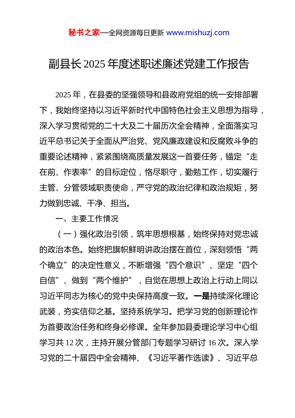 秘书之家—全网资源每日更新 www.mishuzj.com副县长 2025 年度述职述廉述党建工作报告 2025 年,在县委的坚强领导和县政府党组的统一安排部署下,我始终坚持以习近平新时代中国特色社会主义思想为指导,深入学习贯彻党的二十大及二十届历次全会精神,全面落实习近平总书记关于全面从严治党、党风廉政建设和反腐败斗争的重要论述精神,紧紧围绕高质量发展这一首要任务,锚定“走在前、作表率”的目标定位,恪尽职守,勤勉工作,切实履行主管、分管领域职责使命,严守党的政治纪律和政治规矩,努力做到忠诚、干净、担当。一、主要工作情况(一)强化政治引领,筑牢思想根基,始终保持对党忠诚的政治本色。始终把旗帜鲜明讲政治摆在首位,深刻领悟“两个确立”的决定性意义,不断增强“四个意识”、坚定“四个自信”、做到“两个维护”,自觉在思想上政治上行动上同以习近平同志为核心的党中央保持高度一致。一是持续深化理论武装,夯实信仰之基。坚持系统学习。把学习党的创新理论作为首要政治任务和终身必修课。全年参加县委理论学习中心组学习共 12 次,主持开展分管部门专题学习研讨 16 次。深入学习党的二十届四中全会精神、《习近平著作选读》、习近平总秘书之家—全网资源每日更新 www.mishuzj.com书记系列重要讲话和重要指示批示精神,特别是关于高质量发展、中国式现代化、全面从严治党等重要论述。带头撰写学习心得体会、理论文章 8 篇。通过深学细悟,不断深化对习近平新时代中国特色社会主义思想世界观和方法论的理解把握,切实提高运用党的创新理论指导实践、推动工作的能力。二是严守政治纪律规矩,确保政令畅通。严格执行重大事项报告制度。始终把政治纪律和政治规矩挺在前面。对分管领域内的重要工作、重大决策、重要项目安排、大额度资金使用等,均严格遵循组织程序,及时、全面、准确地向县委、县政府主要领导及县政府党组请示报告。全年提请县委常委会、县政府常务会议审议分管领域重要议题 23 项,按规定及时报备重大事项 15 件,确保上级决策部署在分管领域不折不扣贯彻执行。坚决落实上级决策部署。紧紧围绕党中央决策部署和省委、市委、县委的工作安排,特别是关于“稳增长、促改革、惠民生、防风险”等中心任务,立足常务副县长职责定位,勇于担当、狠抓落实。针对经济下行压力加大的挑战,牵头建立完善经济运行监测预警和精准调度机制;针对重大项目建设瓶颈,靠前指挥协调破解难题;针对财政收支平衡压力,多措并举开源节流;针对安全生产风险隐患,紧盯重点领域强化监管。全年牵头推进落实县委县政府重点工作任务 45 项,协调解决跨部门、跨领域的难秘书之家—全网资源每日更新 www.mishuzj.com点堵点问题 33 个,有效推动了各项工作部署落地生根,形成了上下贯通、执行有力的工作格局。三是扛牢压实政治责任,履行“一岗双责”。全面落实党建工作责任。深刻认识抓好党建是最大政绩的理念,认真履行分管领域管党治党政治责任。坚持党建工作与业务工作同谋划、同部署、同推进、同考核。定期听取分管部门(单位)党建工作汇报,研究解决党建工作中存在的突出问题。指导督促分管部门党组(党委)严肃党内政治生活,严格落实“三会一课”、组织生活会、民主评议党员等制度。全年深入分管部门及联系乡镇调研指导党建工作 12 次,为分管部门党员干部讲专题党课 4 次。加强意识形态阵地管理。严格落实意识形态工作责任制,将意识形态工作纳入分管部门年度考核评价体系。密切关注分管领域经济社会热点、敏感问题,加强分析研判,及时有效防范化解风险隐患。加强对分管部门网站、微信公众号等宣传阵地的管理,确保意识形态领域安全可控。注重在项目建设、民生保障、安全生产等重点工作中加强政策解读和舆论引导,积极回应社会关切。(二)聚焦主责主业,锐意担当作为,全力推动经济社会高质量发展。立足常务副县长协助县长负责县政府常务工作,分管发展改革、财政税务、应急管理、统计、行政审批服务、营商环境等关键领域的职责定位,紧紧围绕全县中心工作,紧秘书之家—全网资源每日更新 www.mishuzj.com盯年度目标任务,全力以赴抓调度...