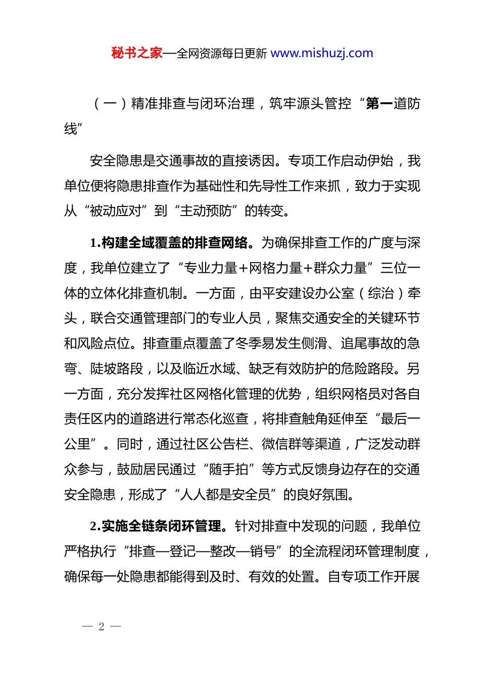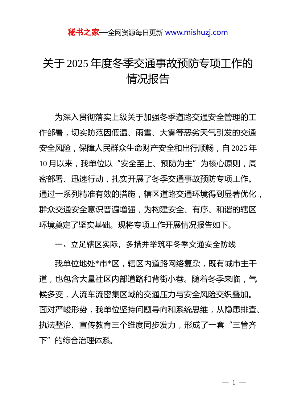 秘书之家—全网资源每日更新 www.mishuzj.com关于 2025 年度冬季交通事故预防专项工作的情况报告为深入贯彻落实上级关于加强冬季道路交通安全管理的工作部署,切实防范因低温、雨雪、大雾等恶劣天气引发的交通安全风险,保障人民群众生命财产安全和出行顺畅,自 2025 年10 月以来,我单位以“安全至上、预防为主”为核心原则,周密部署、迅速行动,扎实开展了冬季交通事故预防专项工作。通过一系列精准有效的措施,辖区道路交通环境得到显著优化,群众交通安全意识普遍增强,为构建安全、有序、和谐的辖区环境奠定了坚实基础。现将专项工作开展情况报告如下。一、立足辖区实际,多措并举筑牢冬季交通安全防线我单位地处*市*区,辖区内道路网络复杂,既有城市主干道,也包含大量社区内部道路和背街小巷。随着冬季来临,气候多变,人流车流密集区域的交通压力与安全风险交织叠加。面对严峻形势,我单位坚持问题导向和系统思维,从隐患排查、执法整治、宣传教育三个维度同步发力,形成了一套“三管齐下”的综合治理体系。— 1 —秘书之家—全网资源每日更新 www.mishuzj.com(一)精准排查与闭环治理,筑牢源头管控“第一道防线”安全隐患是交通事故的直接诱因。专项工作启动伊始,我单位便将隐患排查作为基础性和先导性工作来抓,致力于实现从“被动应对”到“主动预防”的转变。1.构建全域覆盖的排查网络。为确保排查工作的广度与深度,我单位建立了“专业力量+网格力量+群众力量”三位一体的立体化排查机制。一方面,由平安建设办公室(综治)牵头,联合交通管理部门的专业人员,聚焦交通安全的关键环节和风险点位。排查重点覆盖了冬季易发生侧滑、追尾事故的急弯、陡坡路段,以及临近水域、缺乏有效防护的危险路段。另一方面,充分发挥社区网格化管理的优势,组织网格员对各自责任区内的道路进行常态化巡查,将排查触角延伸至“最后一公里”。同时,通过社区公告栏、微信群等渠道,广泛发动群众参与,鼓励居民通过“随手拍”等方式反馈身边存在的交通安全隐患,形成了“人人都是安全员”的良好氛围。2.实施全链条闭环管理。针对排查中发现的问题,我单位严格执行“排查—登记—整改—销号”的全流程闭环管理制度,确保每一处隐患都能得到及时、有效的处置。自专项工作开展— 2 —秘书之家—全网资源每日更新 www.mishuzj.com以来,通过上述多渠道排查方式,累计发现各类交通安全隐患6 处。这些隐患主要包括:部分路口用于物理隔离、减缓车速的阻车桩因碰撞或老化出现损坏松动;个别交通警示或指示标识因风化、污损而缺失或不清;以及道路两侧绿化树木生长过密,遮挡驾驶员和行人视线,形成视觉盲区。针对这些问题,我单位迅速建立专项台账,明确责任部门、整改时限和验收标准。截至目前,台账所列的 6 处隐患已全部整改销号。具体来看,共计修复了 4 处关键节点的损坏阻车桩,数量达到 8 个;对 2 处因树木遮挡导致视线受阻的路段进行了专业修剪,恢复了通透的行车视野。这些看似微小的整改,实则有效清除了潜在的事故风险点,极大地提升了辖区道路的本质安全水平。(二)强化路面联合执法,构建严格有序的“路面管控网”优化路面交通秩序是预防和减少交通事故的关键所在。我单位坚持严格执法与教育引导相结合,通过强化部门联动与力量整合,着力提升路面见警率与管事率,对各类交通违法行为形成强大震慑。— 3 —秘书之家—全网资源每日更新 www.mishuzj.com1.深化部门联动执法机制。为破解单一部门执法力量不足、覆盖面有限的难题,平安建设办公室(综治)主动加强与辖区交通警务站的协同联动,建立了常态化的联合执法机制。自2025 年 10 月以来,双方共同组织开展了针对性的街面交通秩序专项整治行动,累计达到 11 次。行动重点聚焦群众反映强烈、极易引发拥堵和事故的机动车乱停乱放问题。通过现场执法,共计张贴违法停车告知单 700 余张,现场劝离、纠正违规停放及不按规定通行的车辆超过 1800 辆次,有效净化了主次干道及重点区域的停车环境。2.聚焦重点时段与重点行为。执法力量的投入讲求精准高效。我单位将警力部署向早晚高峰时段以及...