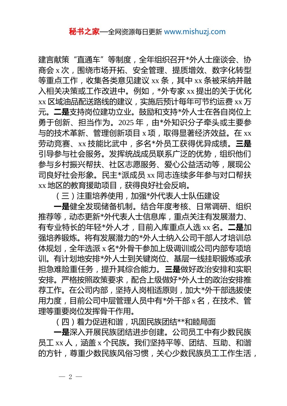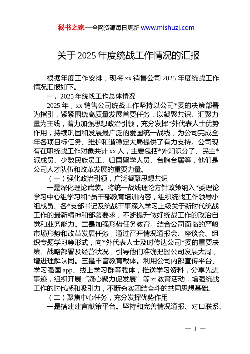 秘书之家—全网资源每日更新 www.mishuzj.com关于 2025 年度统战工作情况的汇报根据年度工作安排,现将 xx 销售公司 2025 年度统战工作情况汇报如下。一、2025 年统战工作总体情况2025 年,xx 销售公司统战工作坚持以公司*委的决策部署为指引,紧紧围绕高质量发展首要任务,以凝聚共识、汇聚力量为主线,着力加强思想政治引领,充分发挥*外代表人士优势作用,持续巩固和发展最广泛的爱国统一战线,为公司完成全年各项目标任务、维护和谐稳定大局提供了有力支持。公司现有在职统战工作对象共计 xx 人,主要包括*外知识分子、民主*派成员、少数民族员工、归国留学人员、台胞台属等,他们是公司人才队伍和改革发展的重要力量。(一)强化政治引领,广泛凝聚思想共识一是深化理论武装。将统一战线理论方针政策纳入*委理论学习中心组学习和*员干部教育培训内容,组织统战工作领导小组成员、各*支部书记及统战干事深入学习上级关于新时代统战工作的最新精神和部署要求,不断提升做好统战工作的政治自觉和业务能力。二是加强形势任务教育。结合公司面临的严峻市场形势和改革发展任务,通过召开情况通报会、座谈会、组织专题学习等形式,向*外代表人士及时传达公司*委的重要决策、战略部署及经营状况,引导他们准确把握公司发展大局,增进理解认同。三是丰富教育载体。利用公司内部宣传平台、学习强国 app、线上学习群等载体,推送学习资料,分享先进事迹,组织开展“凝心聚力促发展”等 zt 教育活动,增强统战工作的时代感和吸引力,不断夯实团结奋斗的共同思想基础。(二)聚焦中心任务,充分发挥优势作用一是搭建建言献策平台。坚持和完善情况通报、对口联系、— 1 —秘书之家—全网资源每日更新 www.mishuzj.com建言献策“直通车”等制度,全年组织召开*外人士座谈会、协商会 x 次,围绕市场开拓、安全管理、提质增效、数字化转型等重点工作,收集各类意见建议 xx 条,其中 xx 条被采纳并融入相关决策或工作改进中。例如,*外专家 xx 提出的关于优化xx 区域油品配送路线的建议,实施后预计每年可节约运费 xx 万元。二是支持岗位建功立业。鼓励和支持*外人士在各自岗位上勇于创新、担当作为。2025 年,由*外知识分子牵头或主要参与的技术革新、管理创新项目 x 项,取得显著经济效益。在 xx劳动竞赛、xx 技能比武中,多名*外员工获得优异成绩。三是引导参与社会服务。发挥统战成员联系广泛的优势,组织他们参与乡村振兴帮扶、社区志愿服务、爱心公益活动等,展现公司良好社会形象。民主*派成员 xx 同志连续多年参与对口帮扶xx 地区的教育援助项目,获得良好社会反响。(三)注重培养使用,加强*外代表人士队伍建设一是健全发现储备机制。结合年度考核、日常调研、组织推荐等,动态更新*外代表人士信息库,重点关注有发展潜力、有专业特长的年轻*外人才,目前入库重点人选 xx 名。二是加强培养锻炼。将有发展潜力的*外人士纳入公司干部人才培训总体规划,全年选派 x 名*外骨干参加上级调训或公司内部专项培训。有计划地安排*外人士到关键岗位、基层一线挂职锻炼或承担急难险重任务,提升其综合能力。三是做好政治安排和实职安排。严格按照政策要求,配合上级做好*外人士的政治安排推荐工作。在公司内部,坚持人岗相适原则,加大*外干部选拔使用力度,目前公司中层管理人员中有*外干部 x 名,在技术、管理等重要岗位发挥骨干作用。(四)着力促进和谐,巩固民族团结**和睦局面一是深入开展民族团结进步创建。公司员工中有少数民族员工 xx 人,涵盖 x 个民族。我们坚持平等、团结、互助、和谐的方针,尊重少数民族风俗习惯,关心少数民族员工工作生活,— 2 —秘书之家—全网资源每日更新 www.mishuzj.com组织开展了民族团结宣传教育活动,营造了各民族员工和睦相处、共同发展的良好氛围。全年未发生任何民族矛盾纠纷。二是稳妥做好**工作。加强马克思主义无神论和科学世界观宣传教育,引导员工树立正确的**观。同时,依法保障员工**信仰自由,加强对信教员工的教育引导,防范非法**活动和境外势力渗透,维护公司意识形态安全。(五)加...