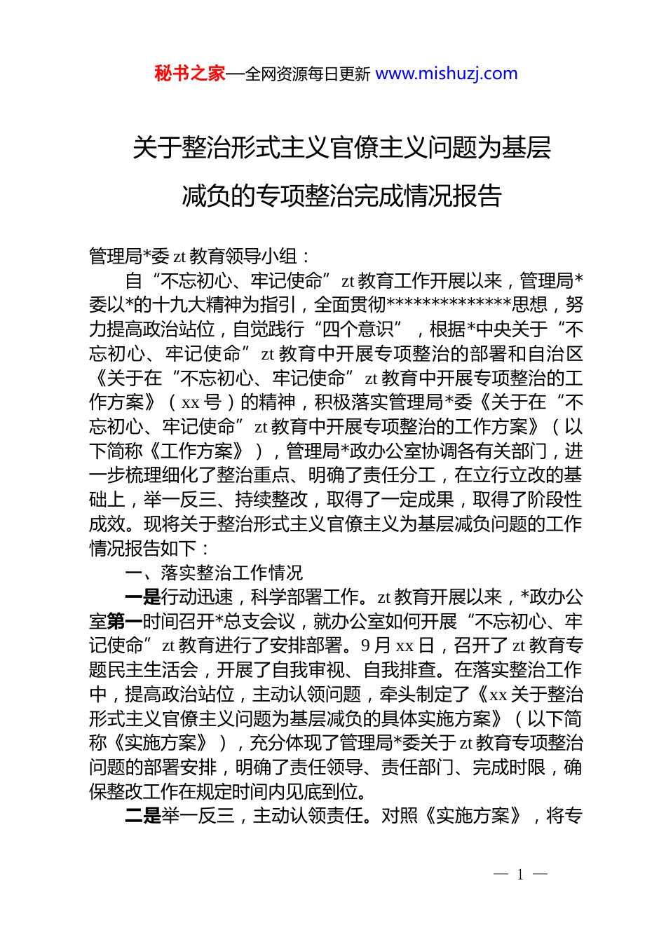 秘书之家—全网资源每日更新 www.mishuzj.com关于整治形式主义官僚主义问题为基层减负的专项整治完成情况报告管理局*委 zt 教育领导小组:自“不忘初心、牢记使命”zt 教育工作开展以来,管理局*委以*的十九大精神为指引,全面贯彻**************思想,努力提高政治站位,自觉践行“四个意识”,根据*中央关于“不忘初心、牢记使命”zt 教育中开展专项整治的部署和自治区《关于在“不忘初心、牢记使命”zt 教育中开展专项整治的工作方案》(xx 号)的精神,积极落实管理局*委《关于在“不忘初心、牢记使命”zt 教育中开展专项整治的工作方案》(以下简称《工作方案》),管理局*政办公室协调各有关部门,进一步梳理细化了整治重点、明确了责任分工,在立行立改的基础上,举一反三、持续整改,取得了一定成果,取得了阶段性成效。现将关于整治形式主义官僚主义为基层减负问题的工作情况报告如下:一、落实整治工作情况一是行动迅速,科学部署工作。zt 教育开展以来,*政办公室第一时间召开*总支会议,就办公室如何开展“不忘初心、牢记使命”zt 教育进行了安排部署。9 月 xx 日,召开了 zt 教育专题民主生活会,开展了自我审视、自我排查。在落实整治工作中,提高政治站位,主动认领问题,牵头制定了《xx 关于整治形式主义官僚主义问题为基层减负的具体实施方案》(以下简称《实施方案》),充分体现了管理局*委关于 zt 教育专项整治问题的部署安排,明确了责任领导、责任部门、完成时限,确保整改工作在规定时间内见底到位。二是举一反三,主动认领责任。对照《实施方案》,将专— 1 —秘书之家—全网资源每日更新 www.mishuzj.com项问题分解梳理细化为 xx 个具体问题、xx 项具体整改措施,其中*政办公室牵头负责的整改措施 xx 项,把整治责任分解落实到每位领导和具体科室,形成了问题清单、责任清单、任务清单、措施清单。按照“条条要整改、件件有着落”要求,细化了时间表,明确责任主体和各阶段任务,制定整改时间表、路线图和任务书,系统梳理任务,确保责任到位。三是传导压力,推动责任落实。根据问题清单,对各单位、管理局机关各部委处室的整治落实工作开展全面督查。各单位各部门按照《实施方案》要求,全面开展了本部门本单位形式主义官僚主义问题大排查。充分发挥职能作用,带头整改自身存在的形式主义官僚主义突出问题,带头在行业、系统内用实际行动就在专项整治,确保了工作有效、基层有感。二、存在的主要问题和工作措施(一)集中整治责任心缺失、随意下令问题,重点是只对上负责、不对下负责,手电筒只照别人不照自己的问题;随意、多头要求基层填表报数报材料,脱离实际向基层发号施令问题;制定政策“一刀切”问题。各部门已针对上述问题进行反馈并提出相关整改措施。管理局据此作出明确要求,同时通过控制白头文件、微信 qq 群部署工作等现象,切实为基层减负。管理局办公室将继续以适当方式加强督促检查,立行立改,长期坚持。(二)集中整治文山会海问题,重点是精文简会不力、文件会议未达到精简比例问题;将红头文件改为白头文件、便函等“隐性文件”问题;未经批准召开会议,重复向下开会问题。按照“以季保年”文件、会议年度精简 30%的要求,强化监督管控,加大文件会议精简力度具体从以下四方面开展整改。一是将规范性文件、议事协调机构成员类文件、通报类文件、工作部署类通知等 4 类文件纳入精简口径,从核心入手精简文件。二是严格规范部门和议事协调机构发文,坚决杜绝部门和— 2 —秘书之家—全网资源每日更新 www.mishuzj.com议事协调机构向各单位*委(*总支)、各单位发指令性公文或在公文中提指令性要求。三是高度重视整治发文中的隐性变异现象,坚决杜绝了将红头文件改为白头文件、便函等形式的发生。四是严格执行年度会议计划,文章系壹号秘书微信公众号原创发布,侵权必究。未列入计划的原则上不以管理局*委、管理局名义召开。对于参会人员相同或者交叉的多个会议进行科学整合、合开套开。未列入计划确需召开的,按规定程序报管理局*政办公室,经主要领导审核,由相应领导小组审议会议内容,报请主要...
