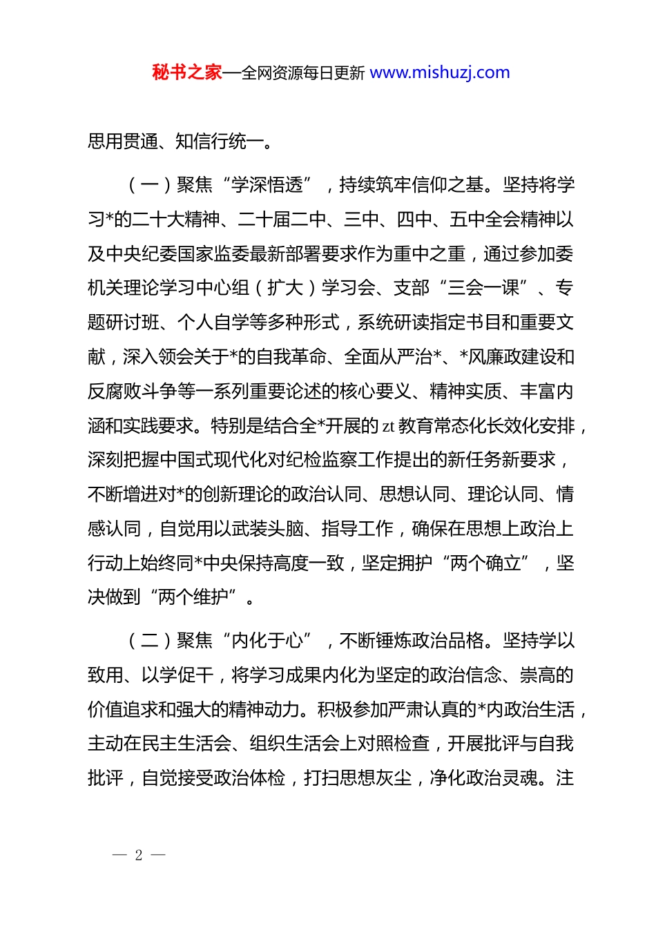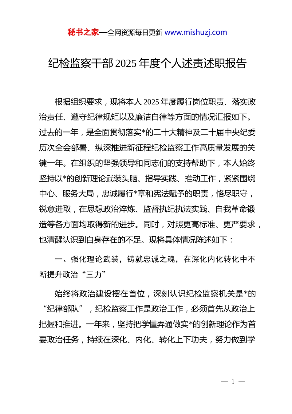 秘书之家—全网资源每日更新 www.mishuzj.com纪检监察干部 2025 年度个人述责述职报告根据组织要求,现将本人 2025 年度履行岗位职责、落实政治责任、遵守纪律规矩以及廉洁自律等方面的情况汇报如下。过去的一年,是全面贯彻落实*的二十大精神及二十届中央纪委历次全会部署、纵深推进新征程纪检监察工作高质量发展的关键一年。在组织的坚强领导和同志们的支持帮助下,本人始终坚持以*的创新理论武装头脑、指导实践、推动工作,紧紧围绕中心、服务大局,忠诚履行*章和宪法赋予的职责,恪尽职守,锐意进取,在思想政治淬炼、监督执纪执法实践、自我革命锻造等各方面均取得新的进步。同时,对照更高标准、更严要求,也清醒认识到自身存在的不足。现将具体情况陈述如下:一、强化理论武装,铸就忠诚之魂,在深化内化转化中不断提升政治“三力”始终将政治建设摆在首位,深刻认识纪检监察机关是*的“纪律部队”,纪检监察工作是政治工作,必须首先从政治上把握和推进。一年来,坚持把学懂弄通做实*的创新理论作为首要政治任务,持续在深化、内化、转化上下功夫,努力做到学— 1 —秘书之家—全网资源每日更新 www.mishuzj.com思用贯通、知信行统一。(一)聚焦“学深悟透”,持续筑牢信仰之基。坚持将学习*的二十大精神、二十届二中、三中、四中、五中全会精神以及中央纪委国家监委最新部署要求作为重中之重,通过参加委机关理论学习中心组(扩大)学习会、支部“三会一课”、专题研讨班、个人自学等多种形式,系统研读指定书目和重要文献,深入领会关于*的自我革命、全面从严治*、*风廉政建设和反腐败斗争等一系列重要论述的核心要义、精神实质、丰富内涵和实践要求。特别是结合全*开展的 zt 教育常态化长效化安排,深刻把握中国式现代化对纪检监察工作提出的新任务新要求,不断增进对*的创新理论的政治认同、思想认同、理论认同、情感认同,自觉用以武装头脑、指导工作,确保在思想上政治上行动上始终同*中央保持高度一致,坚定拥护“两个确立”,坚决做到“两个维护”。(二)聚焦“内化于心”,不断锤炼政治品格。坚持学以致用、以学促干,将学习成果内化为坚定的政治信念、崇高的价值追求和强大的精神动力。积极参加严肃认真的*内政治生活,主动在民主生活会、组织生活会上对照检查,开展批评与自我批评,自觉接受政治体检,打扫思想灰尘,净化政治灵魂。注— 2 —秘书之家—全网资源每日更新 www.mishuzj.com重从*的百年奋斗史特别是新时代全面从严治*取得的历史性、开创性成就中汲取智慧和力量,深刻认识纪检监察机关在推进*的自我革命、守护*的初心使命中的重要作用,不断增强身为纪检监察干部的职业荣誉感、历史使命感和政治责任感。在面对复杂敏感问题、重大原则考验时,能够保持清醒的政治头脑,站稳政治立场,把准政治方向,始终做到*中央提倡的坚决响应、*中央决定的坚决执行、*中央禁止的坚决不做。(三)聚焦“转化于行”,着力提升履职能力。坚持理论联系实际的马克思主义学风,努力把学习成果转化为谋划工作的思路、推动落实的举措和解决问题的本领。紧密联系国际国内形势发展变化,联系本地区本单位全面从严治*阶段性特征,联系自身分管或从事的具体工作,深入思考如何将*中央关于全面从严治*的战略部署转化为具体行动。例如,在谋划年度专项监督工作时,自觉运用*的创新理论中蕴含的立场观点方法,分析研判廉政风险点,精准确定监督重点;在查办案件过程中,注重从政治上审视问题,准确把握政策策略,努力实现政治效果、纪法效果和社会效果的有机统一。通过持续学习转化,自身的政治判断力、政治领悟力、政治执行力得到进一步锻炼和提升。— 3 —秘书之家—全网资源每日更新 www.mishuzj.com二、聚焦主责主业,锐意担当作为,在服务保障大局中履职尽责展现新作为始终牢记职责使命,坚持围绕*中央重大决策部署和省委、市委及委机关工作安排,聚焦监督保障执行、促进完善发展的职能定位,以高度的政治自觉和行动自觉,全力以赴投入各项工作,力求取得实效。(一)做实政治监督,保障决策部署落地生根。深刻把握政治监督的根本任务是督促全*做到“两个...