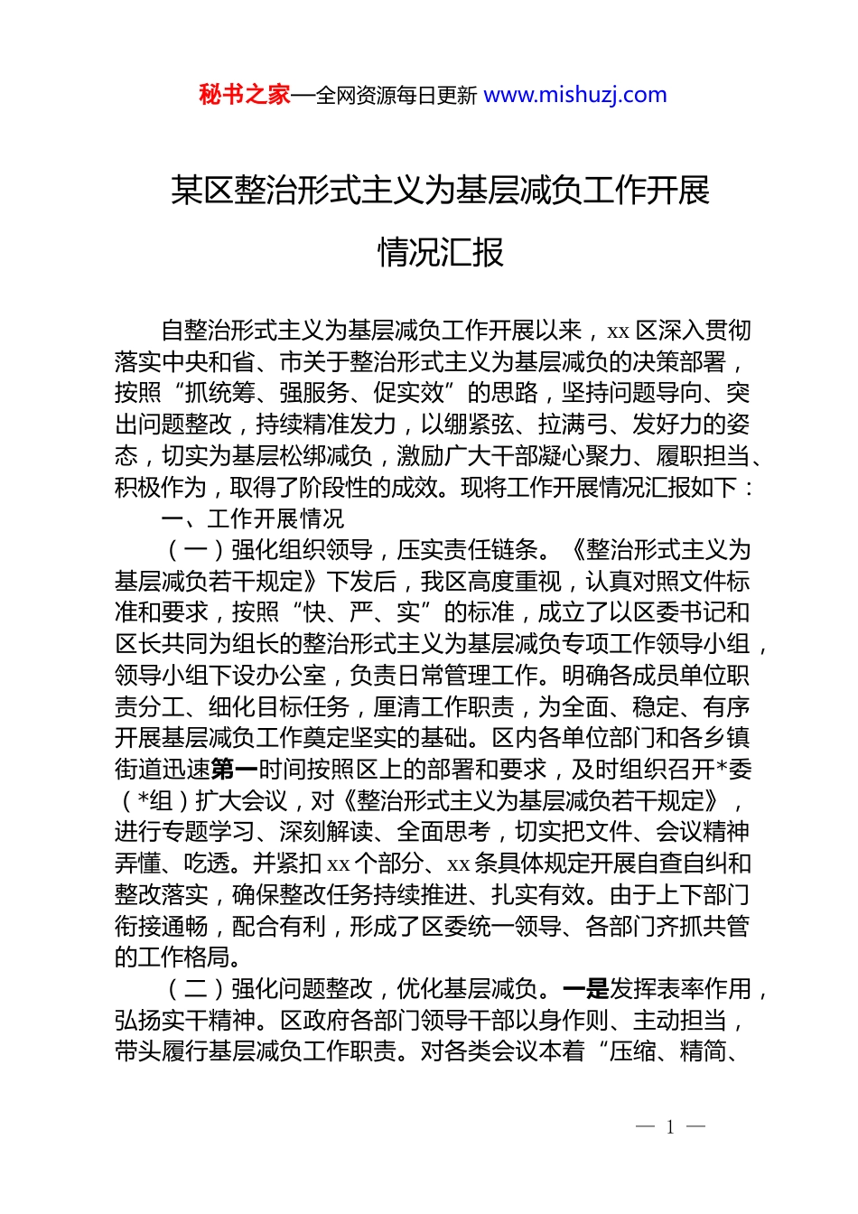 秘书之家—全网资源每日更新 www.mishuzj.com某区整治形式主义为基层减负工作开展情况汇报自整治形式主义为基层减负工作开展以来,xx 区深入贯彻落实中央和省、市关于整治形式主义为基层减负的决策部署,按照“抓统筹、强服务、促实效”的思路,坚持问题导向、突出问题整改,持续精准发力,以绷紧弦、拉满弓、发好力的姿态,切实为基层松绑减负,激励广大干部凝心聚力、履职担当、积极作为,取得了阶段性的成效。现将工作开展情况汇报如下:一、工作开展情况(一)强化组织领导,压实责任链条。《整治形式主义为基层减负若干规定》下发后,我区高度重视,认真对照文件标准和要求,按照“快、严、实”的标准,成立了以区委书记和区长共同为组长的整治形式主义为基层减负专项工作领导小组,领导小组下设办公室,负责日常管理工作。明确各成员单位职责分工、细化目标任务,厘清工作职责,为全面、稳定、有序开展基层减负工作奠定坚实的基础。区内各单位部门和各乡镇街道迅速第一时间按照区上的部署和要求,及时组织召开*委(*组)扩大会议,对《整治形式主义为基层减负若干规定》,进行专题学习、深刻解读、全面思考,切实把文件、会议精神弄懂、吃透。并紧扣 xx 个部分、xx 条具体规定开展自查自纠和整改落实,确保整改任务持续推进、扎实有效。由于上下部门衔接通畅,配合有利,形成了区委统一领导、各部门齐抓共管的工作格局。(二)强化问题整改,优化基层减负。一是发挥表率作用,弘扬实干精神。区政府各部门领导干部以身作则、主动担当,带头履行基层减负工作职责。对各类会议本着“压缩、精简、— 1 —秘书之家—全网资源每日更新 www.mishuzj.com优化”的原则,进行综合考虑、统筹规划、权衡利弊,严格控制开会的时间和规模,提倡开短会、讲短话,坚决杜绝冗长拖沓的节奏。能合并的合并,能套开的套开,能不开的不开。今年全区会议数量较去年减少 x%,一般性会议时间有原来 1 个多小时压缩到半小时以内。大型综合会议不超过不超过半天。同时,采取“四不两直”的模式,有规划、有步骤、有效率地开展调研,深入乡村振兴、农业发展、安全生产、企业发展等重点项目建设一线,及时、准确掌握项目总体规划及建设进展,有效解决群众关心的急难愁盼问题。发扬务求实效的工作作风,减少重复无效的调研,推动全区健康有序发展。截至目前,已深入调研涵盖乡村示范带建设、基础设施建设、民生服务保障等 xx 个领域,发现突出问题 xx 个,提出解决方案 xx 余项。二是突出精简整合,优化考核项目。为减少基层迎检的负担,积极向有关部门征求整改台账的意见建议,抓住核心点和关注点,通过参考斟酌、深思熟虑、分析研判,科学整合各类考核考评台账,从准确性、完整性、规范性的角度出发,减少不必要的流程,压缩重复多余的报表,删除冗余繁杂的事项,确保精简工作落实到位。累计共减少优化考核 xx 项,并由考核办统一进行考核,彻底破除区直部门单位对乡镇各自为政、多头考核的局面。同时扎实开展档案精简工作。坚持从档案的价值、时效性、重复程度等方面进行细致入微的排查工作,做好档案的审查鉴定和归纳梳理,对遇到的疑惑及时征求相关业务部门和专业人员的意见。对精简后的档案进行重新编排、设计、归类,大大提高了工作效率。经过有效调整和梳理,保留 xx 项涉及 xx个部门单位的档案资料事项,基层上报材料工作量逐渐降低,全区年度考核次数减少 xx%,考评内容压缩 xx%,基层负担和压力大大减轻。三是查摆问题短板,强化整改落实。全区各单位严格按照标准要求,健全和完善常态化的管控和整改机制,围绕重点和难点,对标对表,认真查摆存在的突出问题,及时— 2 —秘书之家—全网资源每日更新 www.mishuzj.com梳理和归纳,列出任务清单,列表装框,规定整改时限和责任人,确保问题整改落到实处。区整治办对各单位整改情况进行综合评估和跟踪落实,对于查摆问题不细,工作敷衍了事、整改措施落实不力的单位进行通报批评,对相关负责人进行诫勉谈话。截至目前,完成自查问题整改 xx 个,建立任务清单 xx项。通过全面梳理和整改,xx 区问题整改取得了阶段...