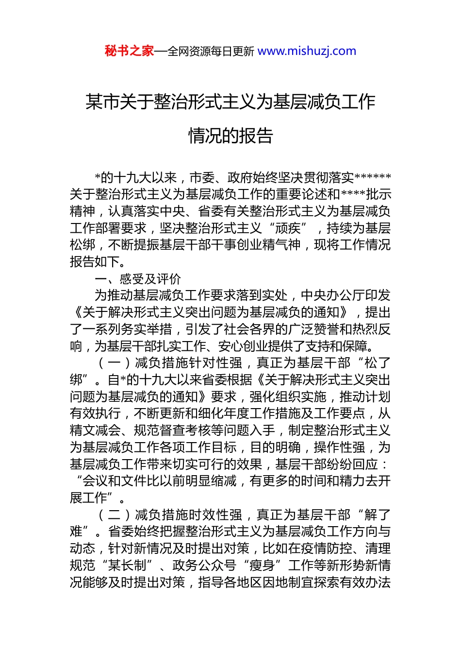 秘书之家—全网资源每日更新 www.mishuzj.com某市关于整治形式主义为基层减负工作情况的报告*的十九大以来,市委、政府始终坚决贯彻落实******关于整治形式主义为基层减负工作的重要论述和****批示精神,认真落实中央、省委有关整治形式主义为基层减负工作部署要求,坚决整治形式主义“顽疾”,持续为基层松绑,不断提振基层干部干事创业精气神,现将工作情况报告如下。一、感受及评价为推动基层减负工作要求落到实处,中央办公厅印发《关于解决形式主义突出问题为基层减负的通知》,提出了一系列务实举措,引发了社会各界的广泛赞誉和热烈反响,为基层干部扎实工作、安心创业提供了支持和保障。(一)减负措施针对性强,真正为基层干部“松了绑”。自*的十九大以来省委根据《关于解决形式主义突出问题为基层减负的通知》要求,强化组织实施,推动计划有效执行,不断更新和细化年度工作措施及工作要点,从精文减会、规范督查考核等问题入手,制定整治形式主义为基层减负工作各项工作目标,目的明确,操作性强,为基层减负工作带来切实可行的效果,基层干部纷纷回应:“会议和文件比以前明显缩减,有更多的时间和精力去开展工作”。(二)减负措施时效性强,真正为基层干部“解了难”。省委始终把握整治形式主义为基层减负工作方向与动态,针对新情况及时提出对策,比如在疫情防控、清理规范“某长制”、政务公众号“瘦身”工作等新形势新情况能够及时提出对策,指导各地区因地制宜探索有效办法秘书之家—全网资源每日更新 www.mishuzj.com带头解决困扰基层的“累点”“痛点”。(三)减负措施导向性强,真正为基层干部“鼓了劲”。省委指导各地区不断给基层松绑,下放权力,改变以往的“小马拉大车”的工作状态,让基层干部能做主、敢做主,避免和减少了反复上报、重复沟通的负担,同时让基层群众少跑腿,对基层工作的满意度不断提高。完善问责制度和激励关怀机制,充实基层力量,满足基层治理和发展需求,让更多的基层干部在工作中脱颖而出,基层服务能力有了质的提升。二、工作成效市委、政府始终高度重视整治形式主义为基层减负工作,坚决贯彻执行*中央、省委工作要求,及时调整市整治形式主义为基层减负专项工作机制组成人员,进一步完善各成员单位职能职责,推动形成市委办牵头抓总,各地区各部门协调联动的责任体系,全力以赴推动为基层减负各项工作举措在我市落实落细落地。(一)严把发文程序质量,发文更加规范高效。一是严格规范精简范围及口径。按照省专项工作机制办公室印发的《关于进一步明确精简文件范围和口径的通知》文件要求,及时向相关部门传达文件精神,明确精简文件范围及口径,切实推动精简文件任务落到实处。二是下大力度精简文件数量。坚决做到“八个不发”、“六个规范”、“三个追责”,严控发文范围,严格按照文件所涉事项、收文单位的职能职责,科学、精准确定文件发布层次,杜绝随意下发普发性公文;减少重复发文,现有文件已有部署且仍然适用的,不得就同一事项再次发文;严控文件篇幅,弘扬“短实新”的优良文风,确保全年发文数量同比上一年只减不增。三是注重发文变异现象。加强日常约束检查,坚决防止出现红头变白头、发文数量明减暗增等问题。四是严格执行发文程序。发文请示须以部门名义向市委和市政府报送,不得直接向领导同志个人请示以市委和秘书之家—全网资源每日更新 www.mishuzj.com政府名义发文。严格执行前置审核制度,以市委和市政府名义印发的重要文件,须经市委办公室或市政府法制审查部门前置审核后才能提交市委常委会会议或市政府常务会议审议;坚决按照发文程序提请发文,对“倒签”、会签不完整等文件,不予发文。五是严格控制发文规格。确需制发的配套文件,一般参照上级机关发文形式,不得随意升格。属于*委、政府各自职责范围的工作,不实行*政联合发文。议事协调机构、部门或部门联合发文能够解决问题的,不得以*委、政府或*政“两办”名义发文。自 2019年统计发文数量以来,连续 2 年发文精简比例达 xx%以上,2022 年上半年共发文 xx 件,同比下降 xx%。(二)优化督查范围事项,督查检查更加高效。一是梳理...