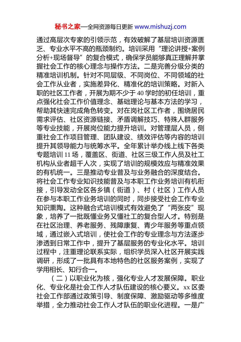 秘书之家—全网资源每日更新 www.mishuzj.com区委社会工作部 2025 年度社工队伍建设工作总结2025 年度,xx 区委社会工作部坚持以**************思想为根本遵循,全面贯彻*的二十大关于完善社会治理体系的决策部署,深入落实 xx 省关于加强社会工作专业人才队伍建设的战略安排及 xx 市新时代人才强市建设工作要求。紧扣区域经济社会发展实际,积极探索社会工作专业人才全生命周期管理模式,通过系统性布局、精准化施策、实效性导向,推动全区社会工作专业人才队伍建设取得突破性进展。截至 2025 年 11 月底,全区全国社会工作者职业资格考试报考人数较 2024 年度实现倍增,年度通过资格考试人数达 99 人,超过此前三年通过人数总和,全区持证社会工作专业人才总量突破 200 人,位居全市首位,初步构建起一支初具规模、结构渐优、能力渐强的专业化社会工作人才队伍。一、基本情况(一)以培训为先,健全分层分类培养体系。教育培训是提升社会工作专业人才能力素质的基础性工程。本年度,xx 区委社会工作部将构建科学化、系统化、常态化的培训机制作为首要任务,通过整合优质资源、创新培训模式、扩大覆盖范围,全面提升社会工作从业者的理论素养与实践能力。一是构建专家引领的高端培训平台。坚持“请进来”与“走出去”相结合,积极对接省内外高校、科研院所及资深社会工作服务机构,建立社会工作领域专家智库。全年累计邀请 12 名社会工作领域专家学者、资深实务工作者参与专题培训,内容涵盖社会工作理论前沿、政策法规解读、实务技能提升、项目管理创新等多个维度秘书之家—全网资源每日更新 www.mishuzj.com通过高层次专家的引领示范,有效破解了基层培训资源匮乏、专业水平不高的瓶颈制约。培训采用“理论讲授+案例分析+现场督导”的复合模式,确保学员能够真正理解并掌握社会工作的核心理念与操作方法。二是完善分级分类的精准培训机制。针对不同层级、不同岗位、不同领域的社会工作从业者,实施差异化、精准化的培训策略。对新入职的社区工作者,开展为期不少于 40 学时的初任培训,重点强化社会工作价值理念、基础理论与基本方法的学习,帮助其快速完成角色转变。对在岗社区工作者,围绕居民需求评估、社区资源链接、矛盾调解技巧、特殊人群服务等专业技能,开展岗位能力提升培训。对管理层人员,侧重社会工作项目管理、团队建设、绩效评估等内容的培训提升其领导能力与统筹水平。全年累计举办线上线下各类专题培训 11 场,覆盖区、街道、社区三级工作人员及社工机构从业者超千人次,实现了培训的规模效应与精准效果的有机统一。三是推动专业普及与业务融合的深度结合。将社会工作专业知识技能普及与本职工作业务培训有机衔接,引导发动全区各乡镇(街道)、村(社区)工作人员在参与本职工作业务培训的同时,同步接受社会工作专业知识熏陶。这种融合式培训模式有效避免了“两张皮”现象,培养了一批既懂业务又懂社工的复合型人才。特别是在社区治理、养老服务、残障康复、青少年服务等重点领域,通过嵌入式培训,使社会工作的专业理念与方法逐步渗透到日常工作中,提升了基层服务的专业化水平。培训过程中,注重理论联系实际,组织学员深入社区开展实践调研,形成了一批具有本地特色的社区服务案例,实现了学用相长、知行合一。(二)以职业化为核,强化专业人才发展保障。职业化、专业化是社会工作人才队伍建设的核心要义。xx 区委社会工作部通过政策引导、制度保障、激励驱动等多维度举措,全力推动社会工作人才队伍的职业化进程。一是广秘书之家—全网资源每日更新 www.mishuzj.com泛宣传引导,营造职业化氛围。将全国社会工作者职业资格考试作为推动队伍职业化的关键抓手,通过召开动员会发放宣传册、开展政策解读、组织经验分享等多种形式,广泛宣传职业资格认证的重要意义与政策红利。在全区所有社区、社工服务机构、相关企事业单位张贴宣传海报,利用微信公众号、工作群等新媒体平台推送考试信息,营造“人人了解社工、人人参与考证”的浓厚氛围。2025 年度报考人数实现翻番式增长,充分体现了宣传引导工作的显著成效。这种增长态势...