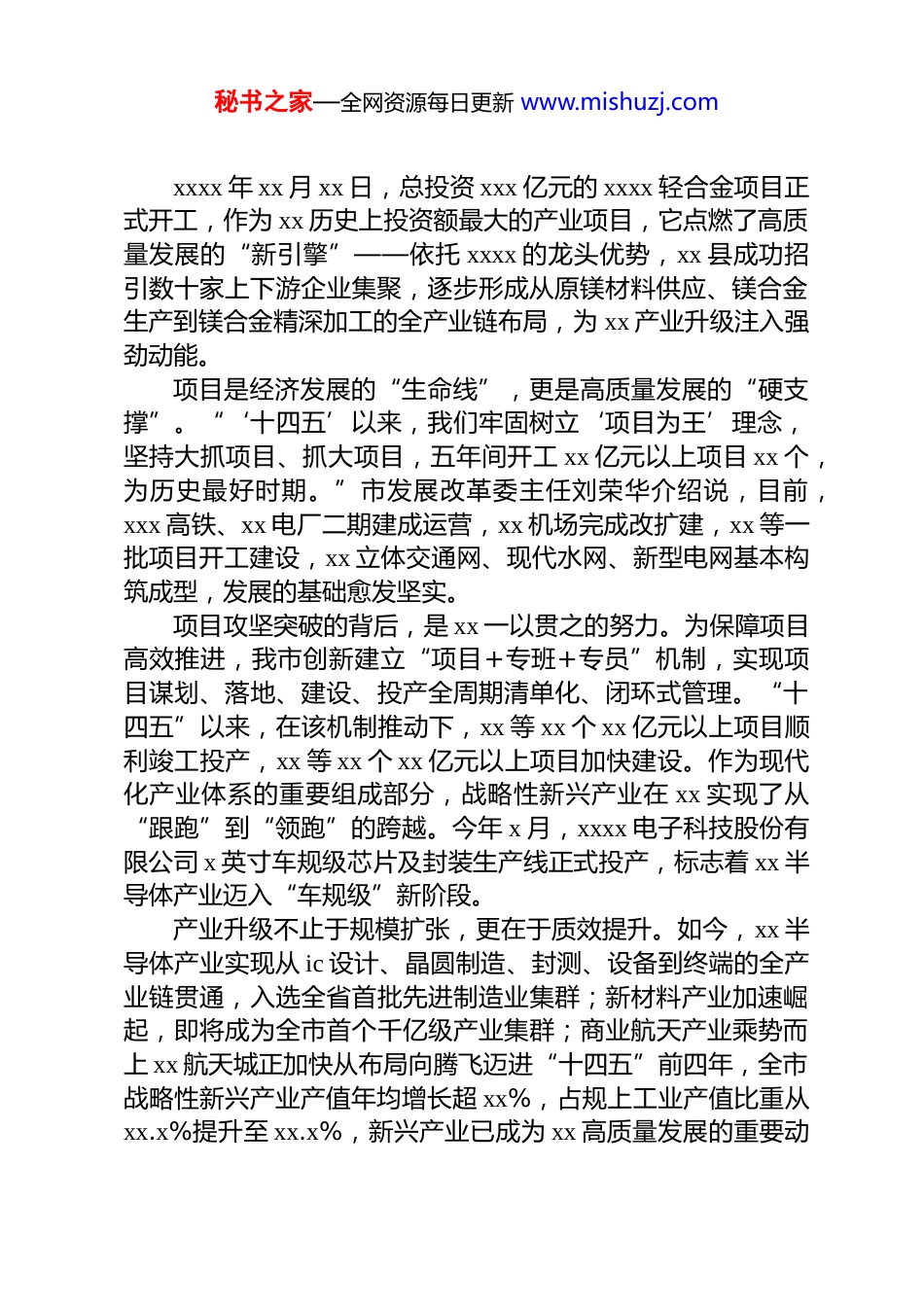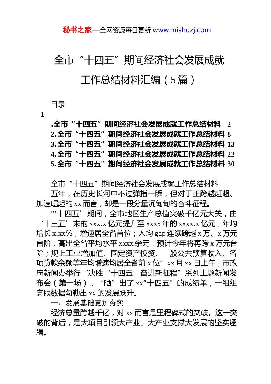 秘书之家—全网资源每日更新 www.mishuzj.com全市“十四五”期间经济社会发展成就工作总结材料汇编(5 篇)目录1.全市“十四五”期间经济社会发展成就工作总结材料22.全市“十四五”期间经济社会发展成就工作总结材料 83.全市“十四五”期间经济社会发展成就工作总结材料 134.全市“十四五”期间经济社会发展成就工作总结材料 225.全市“十四五”期间经济社会发展成就工作总结材料 30全市“十四五”期间经济社会发展成就工作总结材料五年,在历史长河中不过弹指一瞬,但对于正跨越赶超、加速崛起的 xx 而言,却是一段分量沉甸甸的奋斗征程。“‘十四五’期间,全市地区生产总值突破千亿元大关,由‘十三五’末的 xxx.x 亿元提升至 xxxx 年的 xxxx.x 亿元,年均增长 x.xx%,增速居全省首位;人均 gdp 连续跨越 x 万、x 万元台阶,高出全省平均水平 xxxx 余元,预计今年将再跨 x 万元台阶;规上工业增加值、固定资产投资、一般公共预算收入、各项贷款余额等年均增速均居全省前 x 位”xx 月 xx 日上午,市政府新闻办举行“决胜‘十四五’奋进新征程”系列主题新闻发布会(第一场),“晒”出了 xx“十四五”的成绩单,一组组亮眼数据勾勒出 xx 的发展跃升。一、发展基础更加夯实经济总量跨越千亿,对 xx 而言是里程碑式的突破。这一突破的背后,是大项目引领大产业、大产业支撑大发展的坚实逻辑。秘书之家—全网资源每日更新 www.mishuzj.comxxxx 年 xx 月 xx 日,总投资 xxx 亿元的 xxxx 轻合金项目正式开工,作为 xx 历史上投资额最大的产业项目,它点燃了高质量发展的“新引擎”——依托 xxxx 的龙头优势,xx 县成功招引数十家上下游企业集聚,逐步形成从原镁材料供应、镁合金生产到镁合金精深加工的全产业链布局,为 xx 产业升级注入强劲动能。项目是经济发展的“生命线”,更是高质量发展的“硬支撑”。“‘十四五’以来,我们牢固树立‘项目为王’理念,坚持大抓项目、抓大项目,五年间开工 xx 亿元以上项目 xx 个,为历史最好时期。”市发展改革委主任刘荣华介绍说,目前,xxx 高铁、xx 电厂二期建成运营,xx 机场完成改扩建,xx 等一批项目开工建设,xx 立体交通网、现代水网、新型电网基本构筑成型,发展的基础愈发坚实。项目攻坚突破的背后,是 xx 一以贯之的努力。为保障项目高效推进,我市创新建立“项目+专班+专员”机制,实现项目谋划、落地、建设、投产全周期清单化、闭环式管理。“十四五”以来,在该机制推动下,xx 等 xx 个 xx 亿元以上项目顺利竣工投产,xx 等 xx 个 xx 亿元以上项目加快建设。作为现代化产业体系的重要组成部分,战略性新兴产业在 xx 实现了从“跟跑”到“领跑”的跨越。今年 x 月,xxxx 电子科技股份有限公司 x 英寸车规级芯片及封装生产线正式投产,标志着 xx 半导体产业迈入“车规级”新阶段。产业升级不止于规模扩张,更在于质效提升。如今,xx 半导体产业实现从 ic 设计、晶圆制造、封测、设备到终端的全产业链贯通,入选全省首批先进制造业集群;新材料产业加速崛起,即将成为全市首个千亿级产业集群;商业航天产业乘势而上 xx 航天城正加快从布局向腾飞迈进“十四五”前四年,全市战略性新兴产业产值年均增长超 xx%,占规上工业产值比重从xx.x%提升至 xx.x%,新兴产业已成为 xx 高质量发展的重要动秘书之家—全网资源每日更新 www.mishuzj.com力源。在产业发展的同时,xx 坚定不移走生态优先、绿色发展之路,让生态优势转化为核心竞争力。xx 的美誉,一张张生态名片擦亮了 xx 生态底色;特色文旅、农产品、竹制品等产业厚积薄发,获批省级生态产品价值实现机制试点、“以竹代塑”应用推广基地试点,绿色生态产业正成长为全市新的经济增长点。二、发展动能更加强劲改革开放是推动经济社会高质量发展的“关键一招”。这五年,xx 统筹推进深层次改革和高水平开放,坚持用改革的办法破解发展难题,以开放的姿态拓展发展空间,让全市发展活力持续迸发。作为一家专业从事竹制品深加工和出口销售的国家重点龙头企业,xx 鸿叶集团主导制定了全...