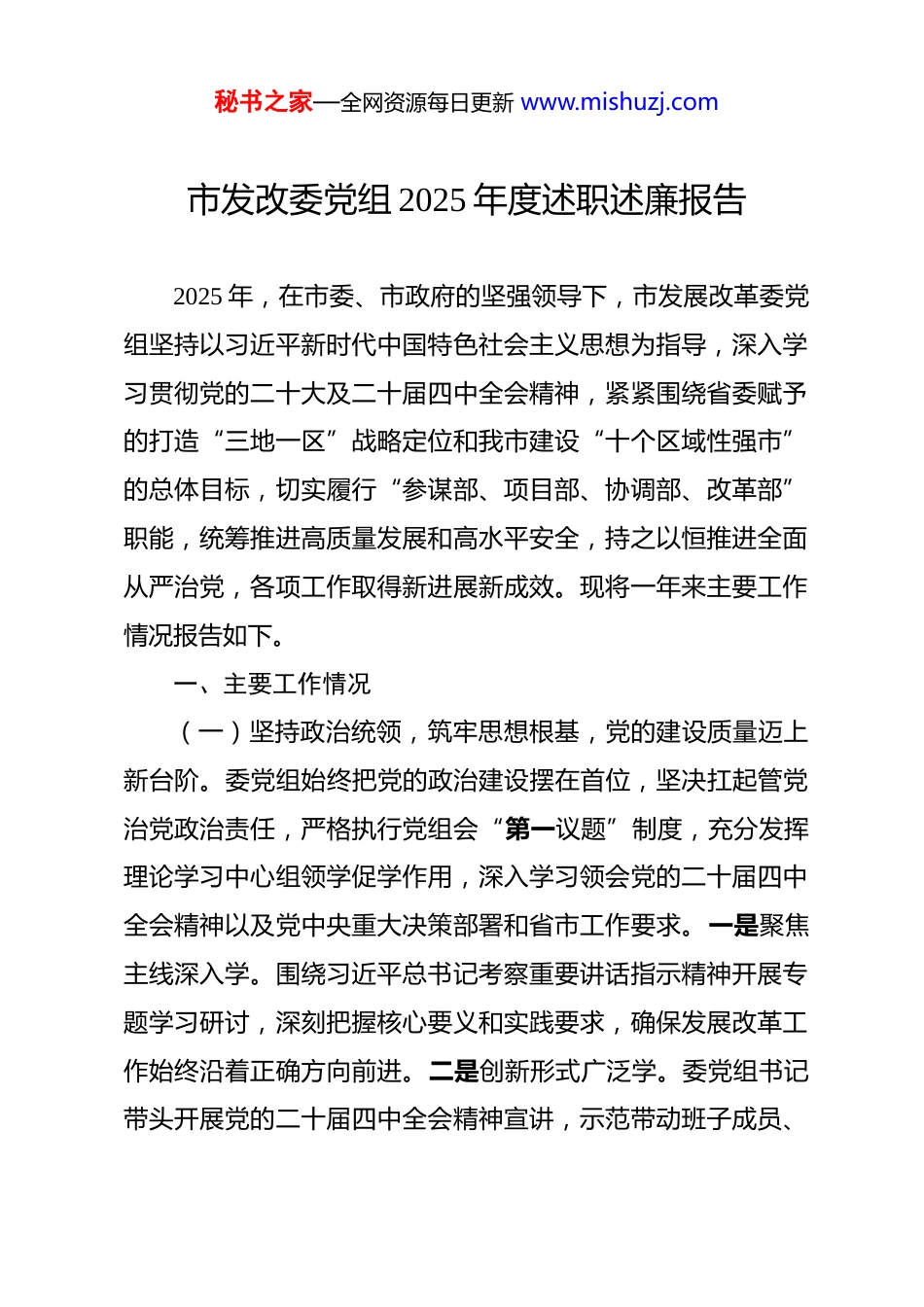 秘书之家—全网资源每日更新 www.mishuzj.com市发改委党组 2025 年度述职述廉报告 2025 年,在市委、市政府的坚强领导下,市发展改革委党组坚持以习近平新时代中国特色社会主义思想为指导,深入学习贯彻党的二十大及二十届四中全会精神,紧紧围绕省委赋予的打造“三地一区”战略定位和我市建设“十个区域性强市”的总体目标,切实履行“参谋部、项目部、协调部、改革部”职能,统筹推进高质量发展和高水平安全,持之以恒推进全面从严治党,各项工作取得新进展新成效。现将一年来主要工作情况报告如下。一、主要工作情况(一)坚持政治统领,筑牢思想根基,党的建设质量迈上新台阶。委党组始终把党的政治建设摆在首位,坚决扛起管党治党政治责任,严格执行党组会“第一议题”制度,充分发挥理论学习中心组领学促学作用,深入学习领会党的二十届四中全会精神以及党中央重大决策部署和省市工作要求。一是聚焦主线深入学。围绕习近平总书记考察重要讲话指示精神开展专题学习研讨,深刻把握核心要义和实践要求,确保发展改革工作始终沿着正确方向前进。二是创新形式广泛学。委党组书记带头开展党的二十届四中全会精神宣讲,示范带动班子成员、秘书之家—全网资源每日更新 www.mishuzj.com党支部书记、驻村第一书记开展专题宣讲 10 余场。举办“举旗帜•送理论”暨新中国成立 76 周年微宣讲竞赛,激发党员干部爱国热情和奋斗精神。开展经济政策宣讲 4 次,有效凝聚发展共识。三是拓展载体灵活学。充分利用“三会一课”、主题党日等形式,组织《中国共产党纪律处分条例》等党内法规专题学习 40 余次、研讨交流 10 余次。积极运用微信、QQ 等平台打造“指尖上”微课堂,实现学习资源共享与常态化交流。(二)聚焦主责主业,勇于担当作为,高质量发展取得新成效。坚决贯彻落实中央及省市决策部署,全力稳增长、促改革、调结构、惠民生、防风险,推动全市经济实现质的有效提升和量的合理增长,呈现稳定向上、结构向优的良好态势。一是做强实体经济根基,产业升级步伐加快。优化产业布局。圆满完成“6849”产业发展布局优化调整,推动产业链集群化发展。壮大先进制造业。创艺、国威通新能源汽车零部件项目成功落地,比亚迪、立讯精密等重大项目实现分期投产,锐美二期项目开工建设。成功设立首只规模 10 亿元的新能源汽车产业基金,为产业集聚注入源头活水。颍东化工园区、晋煤中能分别荣获全省新材料产业“十强园区”“十强企业”称号。提升现代服务业的水平。全市服务业高质量发展成效显著,获省政府督查激励。2025 年其他营利性服务业营业收入增长 28.3%,增速位秘书之家—全网资源每日更新 www.mishuzj.com居全省第 4 位。界首市高新区、华源医药集团入选省“两业融合”发展标杆单位。文化产业园区获省服务业集聚区绩效评价奖励。商贸服务型国家物流枢纽“首创首成”,功能型国家现代流通战略支点城市、国家骨干冷链物流基地建设提速,全社会物流成本有效降低。强化创新驱动。1-11 月,高技术制造业增加值同比增长 32.2%,战略性新兴产业产值增长 0.8%,累计获批省级及以上创新平台 38 家,产业核心竞争力显著增强。二是扩大有效精准投资,发展后劲持续增强。投资运行稳健。1-11 月,全市固定资产投资增长 2.5%,其中制造业投资、基础设施投资分别增长 32.8%、21.6%,增速分居全省第 4 位、第 5 位,投资结构持续优化。资金争取有力。成功争取中央预算内投资、增发国债、地方政府专项债券等上级资金项目 207 个,到位资金 165.9 亿元,有效缓解项目资金压力。项目谋划提质。实施项目谋划提质行动,动态更新“三类项目库”,编制储备亿元以上项目 945 个,总投资 7832.5 亿元。启动“争项目争政策争资金”项目谋划“百日会战”,初步谋划 2025 年市级第一批重点项目 874 个,总投资 5792.6 亿元,年度计划投资 1095 亿元。项目建设提速。实施项目建设提速行动,强化重点项目融资对接,落实重大产业项目单独调度单独服务机制。市县“星期六会商”高效运行,研究项目 2351 个,解决事项 2204 个。151 个秘书之家—全网资源每日更新...