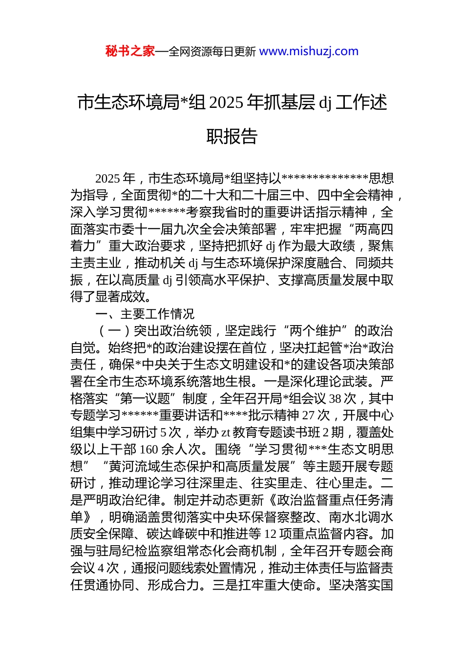 秘书之家—全网资源每日更新 www.mishuzj.com市生态环境局*组 2025 年抓基层 dj 工作述职报告2025 年,市生态环境局*组坚持以**************思想为指导,全面贯彻*的二十大和二十届三中、四中全会精神,深入学习贯彻******考察我省时的重要讲话指示精神,全面落实市委十一届九次全会决策部署,牢牢把握“两高四着力”重大政治要求,坚持把抓好 dj 作为最大政绩,聚焦主责主业,推动机关 dj 与生态环境保护深度融合、同频共振,在以高质量 dj 引领高水平保护、支撑高质量发展中取得了显著成效。一、主要工作情况(一)突出政治统领,坚定践行“两个维护”的政治自觉。始终把*的政治建设摆在首位,坚决扛起管*治*政治责任,确保*中央关于生态文明建设和*的建设各项决策部署在全市生态环境系统落地生根。一是深化理论武装。严格落实“第一议题”制度,全年召开局*组会议 38 次,其中专题学习******重要讲话和****批示精神 27 次,开展中心组集中学习研讨 5 次,举办 zt 教育专题读书班 2 期,覆盖处级以上干部 160 余人次。围绕“学习贯彻***生态文明思想”“黄河流域生态保护和高质量发展”等主题开展专题研讨,推动理论学习往深里走、往实里走、往心里走。二是严明政治纪律。制定并动态更新《政治监督重点任务清单》,明确涵盖贯彻落实中央环保督察整改、南水北调水质安全保障、碳达峰碳中和推进等 12 项重点监督内容。加强与驻局纪检监察组常态化会商机制,全年召开专题会商会议 4 次,通报问题线索处置情况,推动主体责任与监督责任贯通协同、形成合力。三是扛牢重大使命。坚决落实国秘书之家—全网资源每日更新 www.mishuzj.com家重大战略部署,全力保障“一泓清水永续北上”。全年累计投入资金 1.8 亿元用于丹江口库区上游支流综合治理,实施生态修复项目 23 个;黄河干流连续三年稳定达到ⅱ类水质标准,陶岔取水口水质持续保持ⅱ类及以上,饮用水源地达标率 100%。相关工作获省委、省政府通报表扬,并作为典型案例在全国生态环境系统交流推广。(二)强化思想引领,筑牢理想信念根基。坚持用*的创新理论凝心铸魂,持续巩固团结奋斗的共同思想基础,不断增强*员干部的政治认同、思想认同、情感认同。一是扎实开展学习教育。组织全系统深入贯彻中央八项规定及其实施细则精神,聚焦“学查改”一体推进,开展警示教育大会 3 场,观看《警钟长鸣》系列专题片,通报典型案例16 起,组织*员干部撰写心得体会 420 余篇。针对公务接待、差旅报销、办公用房等重点领域开展专项自查,发现问题13 项,均已整改到位。二是丰富学习载体。依托“生态文明大讲堂”平台,邀请高校专家、行业领军人才授课 9 期,内容涵盖气候变化应对、新污染物治理、生态产品价值实现机制等前沿领域,参训人员达 2800 人次。组织开展庆祝中国共产*成立 104 周年系列活动,赴红旗渠、焦裕禄纪念馆等地开展红色教育基地现场教学,覆盖*员 650 人次。深化青年理论学习小组建设,举办“青言青语话生态”读书分享会 6 场,激发青年干部干事创业热情。三是守好意识形态阵地。严格落实意识形态工作责任制,每季度召开分析研判会议,建立舆情风险台账,全年梳理潜在风险点 54 个,制定防控措施 63 条。加强网络舆情监测预警体系建设,编印《市生态环境舆情专报》128 期、《舆情快报》45 期,向局领导报送重要信息 310 条,办结批示件 230 件。妥善应对突发环境事件舆情 8 起,均实现有效引导、平稳化解,未发生重大负面舆情。(三)夯实组织基础,建强战斗堡垒和先锋队伍。牢固树立大抓基层鲜明导向,全面推进*支部标准化规范化建秘书之家—全网资源每日更新 www.mishuzj.com设,不断提升基层*组织政治功能和组织功能。一是优化组织体系。依据《中国共产*和国家机关基层组织工作条例》,对全市生态环境系统基层*组织设置进行系统梳理,调整组建*支部 7 个,撤销合并空壳支部 3 个,实现*组织全覆盖、管理无死角。完成机关*委换届选举,配齐配强专职*务干部,建立*务干部培训档案,实行持证上岗制度。二是提升履职能力。举办全市生态环境系统*务干部...