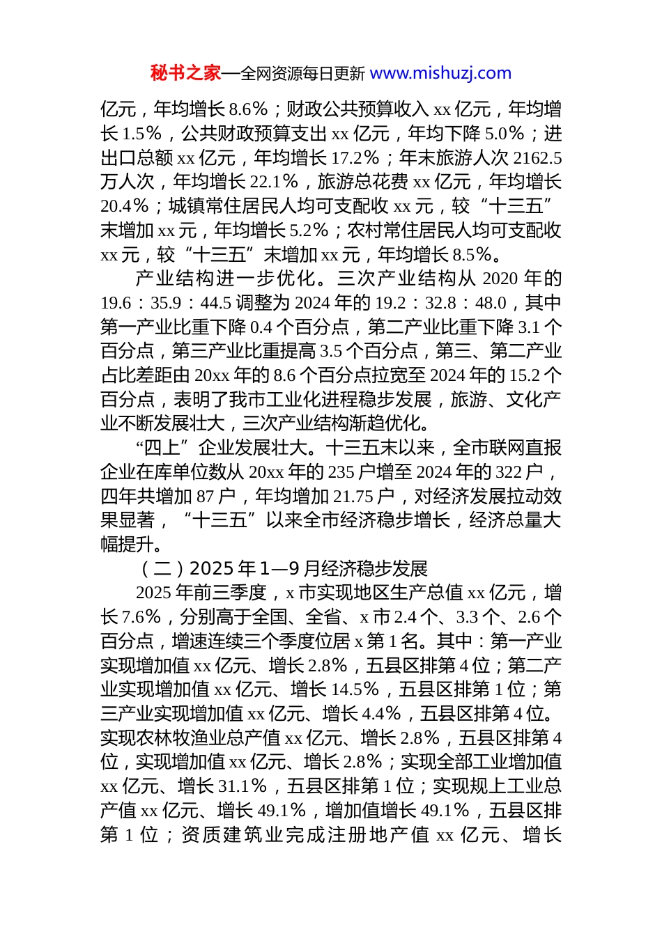 秘书之家—全网资源每日更新 www.mishuzj.com市统计局 2025 年及“十四五”时期工作总结和 2026 年及“十五五”工作计划2025 年及“十四五”期间,在市委、市政府的正确领导下,x 市统计局坚持以**************思想为指导,全面贯彻落实*的 xx 大和二十届一、二、三、四中全会、中央经济工作会议精神,紧紧围绕“3815”战略发展目标、x“五大经济”及全市中心工作,紧盯 x 经济发展目标任务,认真履行统计职能职责,扎实做好各项统计调查、经济普查和人口普查工作,发挥统计预警监测作用,加强统计业务培训推进依法统计,为全市经济高质量发展提供有力的统计服务保障。一、“十四五”主要工作成果(一)经济总量大幅提升20xx 年至 2024 年期间,全市经济平稳发展,生产总值从 20xx 年的 xx 亿元增加到 2024 年的 xx 亿元,总量增加 xx亿元,生产总值年均增长 4.6%。其中,一产实现增加值 xx亿元、增 2.6%,比 20xx 年(xx 亿元)增加 xx 亿元,年均增长 5.0%;二产实现增加值 xx 亿元、增长 1.8%,比 20xx年(xx 亿元)增加 xx 亿元,年均增长 1.6%;三产实现增加值 xx 亿元、增长 4.5%,比 20xx 年(xx 亿元)增加 xx 亿元,年均增长 5.5%。人均生产总值由 20xx 年的 xx 元增加到 2024 年的 xx 元,增加 xx 元,年均增长 4.5%。农林牧渔业总产值 xx 亿元,年均增长 5.8%;规模以上工业总产值xx 亿元,年均下降 10.2%,规上工业增加值下降 11.5%,年均下降 2.2%;建筑业总产值 xx 亿元,年均增长 33%;固定资产投资增长 9.3%,年均增长 6.6%;商品房销售面积39.27 万平方米,年均下降 20%;社会消费品零售总额 xx秘书之家—全网资源每日更新 www.mishuzj.com亿元,年均增长 8.6%;财政公共预算收入 xx 亿元,年均增长 1.5%,公共财政预算支出 xx 亿元,年均下降 5.0%;进出口总额 xx 亿元,年均增长 17.2%;年末旅游人次 2162.5万人次,年均增长 22.1%,旅游总花费 xx 亿元,年均增长20.4%;城镇常住居民人均可支配收 xx 元,较“十三五”末增加 xx 元,年均增长 5.2%;农村常住居民人均可支配收xx 元,较“十三五”末增加 xx 元,年均增长 8.5%。产业结构进一步优化。三次产业结构从 2020 年的19.6:35.9:44.5 调整为 2024 年的 19.2:32.8:48.0,其中第一产业比重下降 0.4 个百分点,第二产业比重下降 3.1 个百分点,第三产业比重提高 3.5 个百分点,第三、第二产业占比差距由 20xx 年的 8.6 个百分点拉宽至 2024 年的 15.2 个百分点,表明了我市工业化进程稳步发展,旅游、文化产业不断发展壮大,三次产业结构渐趋优化。“四上”企业发展壮大。十三五末以来,全市联网直报企业在库单位数从 20xx 年的 235 户增至 2024 年的 322 户,四年共增加 87 户,年均增加 21.75 户,对经济发展拉动效果显著,“十三五”以来全市经济稳步增长,经济总量大幅提升。(二)2025 年 1—9 月经济稳步发展2025 年前三季度,x 市实现地区生产总值 xx 亿元,增长 7.6%,分别高于全国、全省、x 市 2.4 个、3.3 个、2.6 个百分点,增速连续三个季度位居 x 第 1 名。其中:第一产业实现增加值 xx 亿元、增长 2.8%,五县区排第 4 位;第二产业实现增加值 xx 亿元、增长 14.5%,五县区排第 1 位;第三产业实现增加值 xx 亿元、增长 4.4%,五县区排第 4 位。实现农林牧渔业总产值 xx 亿元、增长 2.8%,五县区排第 4位,实现增加值 xx 亿元、增长 2.8%;实现全部工业增加值xx 亿元、增长 31.1%,五县区排第 1 位;实现规上工业总产值 xx 亿元、增长 49.1%,增加值增长 49.1%,五县区排第 1 位 ; 资 质 建 筑 业 完 成 注 册 地 产 值 xx 亿 元 、 增 长秘书之家—全网资源每日更新 www.mishuzj.com12.9%,在地产值 xx 亿元、增长 1.2%,五县区排第 5 位;商品房销售面积完成 25.9 万㎡、下降 0.8%,五县区排第 4位,商品房销售额完成 xx ...
