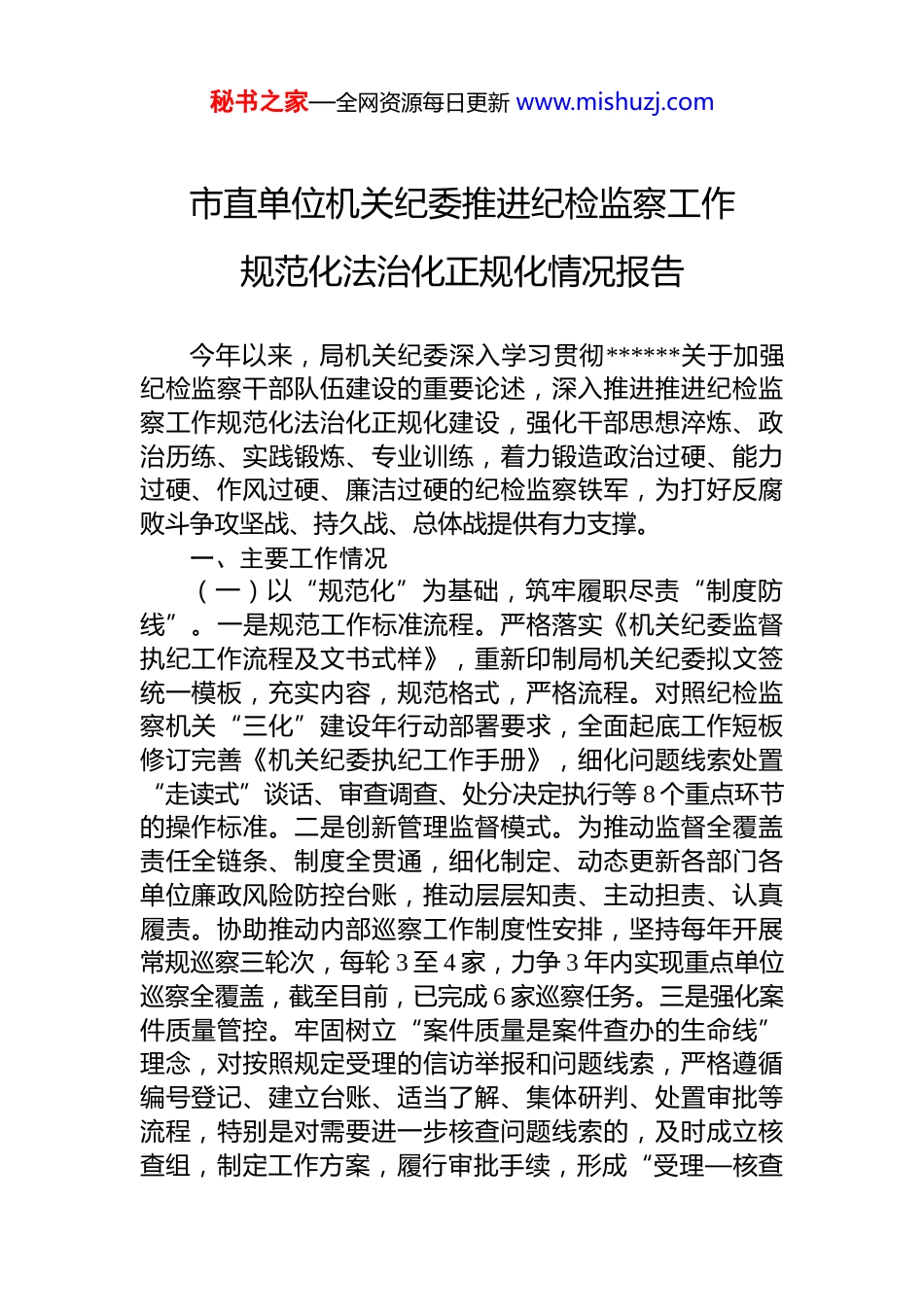 秘书之家—全网资源每日更新 www.mishuzj.com市直单位机关纪委推进纪检监察工作规范化法治化正规化情况报告今年以来,局机关纪委深入学习贯彻******关于加强纪检监察干部队伍建设的重要论述,深入推进推进纪检监察工作规范化法治化正规化建设,强化干部思想淬炼、政治历练、实践锻炼、专业训练,着力锻造政治过硬、能力过硬、作风过硬、廉洁过硬的纪检监察铁军,为打好反腐败斗争攻坚战、持久战、总体战提供有力支撑。一、主要工作情况(一)以“规范化”为基础,筑牢履职尽责“制度防线”。一是规范工作标准流程。严格落实《机关纪委监督执纪工作流程及文书式样》,重新印制局机关纪委拟文签统一模板,充实内容,规范格式,严格流程。对照纪检监察机关“三化”建设年行动部署要求,全面起底工作短板修订完善《机关纪委执纪工作手册》,细化问题线索处置“走读式”谈话、审查调查、处分决定执行等 8 个重点环节的操作标准。二是创新管理监督模式。为推动监督全覆盖责任全链条、制度全贯通,细化制定、动态更新各部门各单位廉政风险防控台账,推动层层知责、主动担责、认真履责。协助推动内部巡察工作制度性安排,坚持每年开展常规巡察三轮次,每轮 3 至 4 家,力争 3 年内实现重点单位巡察全覆盖,截至目前,已完成 6 家巡察任务。三是强化案件质量管控。牢固树立“案件质量是案件查办的生命线”理念,对按照规定受理的信访举报和问题线索,严格遵循编号登记、建立台账、适当了解、集体研判、处置审批等流程,特别是对需要进一步核查问题线索的,及时成立核查组,制定工作方案,履行审批手续,形成“受理—核查秘书之家—全网资源每日更新 www.mishuzj.com—处置—反馈”完整闭环,确保每个环节都有据可查、责任可溯。今年以来共收到信访举报线索 14 件,综合运用“四种形态”进行依规依纪处置,给予批评教育、责令检查处理 8 人、给予*内警告处分 2 人,其中,运用“第一种形态”占比 85%,实现了抓早抓小、防微杜渐的目的。(二)以“法治化”为核心,守住依规执纪“底线红线”。一是加强纪法学习。突出法治思维,将法治理念贯穿纪检干部学习培训全过程。组织开展线上学习时,要求大家严格遵守网络安全、注意个人信息保护;对收到的重要工作信息和重要文件资料,自觉做好**工作等。定期组织参加省直纪检监察工委线上业务测试,不断夯实纪法理论基础。牵头组织机关纪检干部和*支部纪检委员纪法培训班,实现纪检干部纪法学习培训的全覆盖。二是强化纪法教育。从近年来局违规违纪*员干部中选取公车私用、违规经商办企业、违规干预司法等 8 个典型案例,组织编印《局违纪违法案例选编》,下发至各*支部,深入开展以案说德、以案说纪、以案说法、以案说责,用身边事教育身边人。及时推送纪法案例,依托局“纪检工作群”“大河云”平台,常态化推送以案释纪典型案例,教育引导*员干部学纪、知纪、明纪、守纪。三是强化内部监督。建立向机关*委、上级纪检部门定期报告制度,主动接受群众监督,确保纪检干部监督执纪权力在法治轨道上运行。今年以来,结合深入贯彻中央八项规定精神学习教育和违规吃喝集中整治专项行动,聚焦机关纪检干部下基层调研多、明察暗访多等情况,坚决执行违规饮酒“禁令”,通过强化内控机制和问责机制倒逼大家时刻绷紧“纪律之弦”,自觉维护纪检干部形象,严防“灯下黑”问题发生。(三)以“正规化”为根本,锻造纪律检查“铁军”。一是深化理论武装。坚持把学习贯彻**************思想,特别是******关于*的自我革命的重要思想作为重中之重,建立“集体学习+个人研学+线上深学”的学习机制,创新秘书之家—全网资源每日更新 www.mishuzj.com“线上课堂+线下研讨”模式,及时跟进学习*章*规 dj、法律法规条例。针对专职纪检委员在外办公的实际,实行月例会制度,每月初召回机关,通过通报情况、学习研讨、交流经验等形式,不断提高政治素养,坚定职责使命。二是健全完善机制。建立完善机关纪委议事规则和决策程序定期召开*风廉政建设专题会和线索处置会商会。成立机关纪委、人力、财务、审计、驻局纪检组五部门协同机制,在人员信息、...