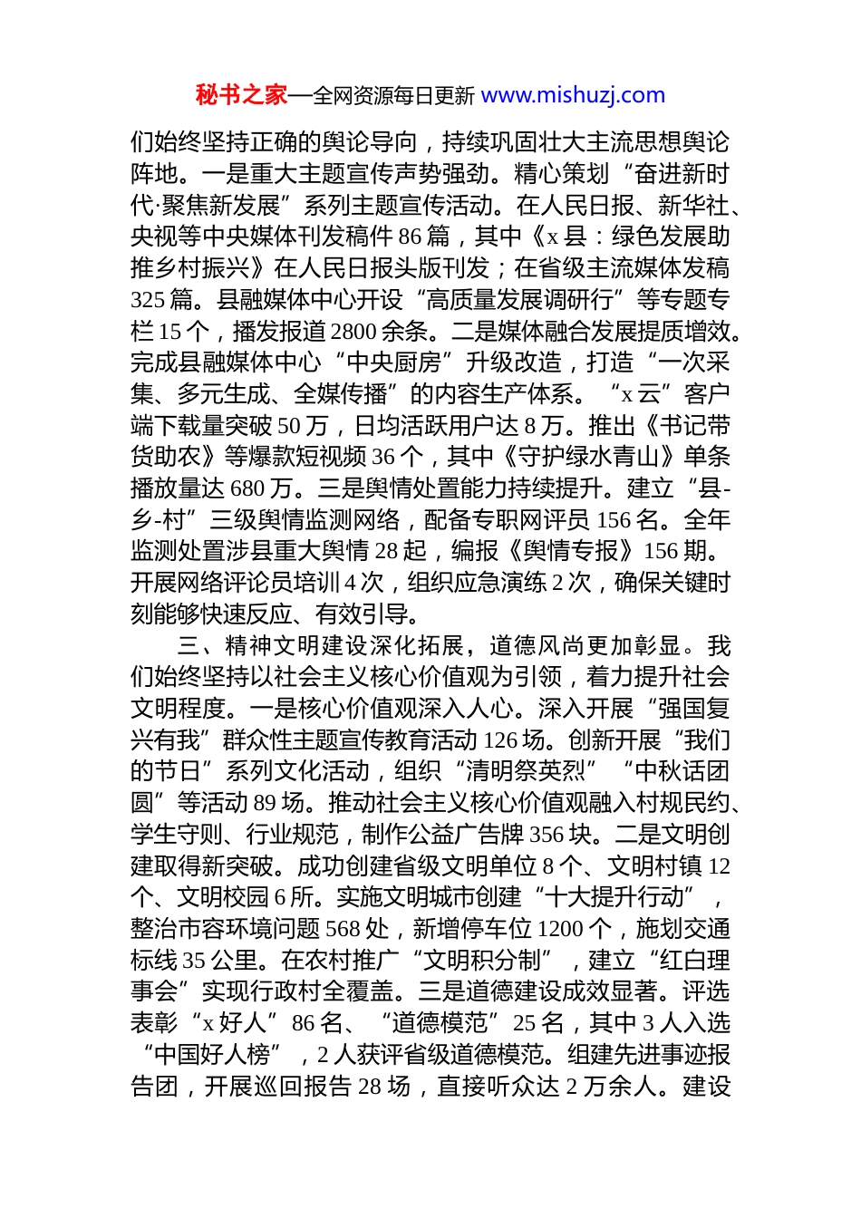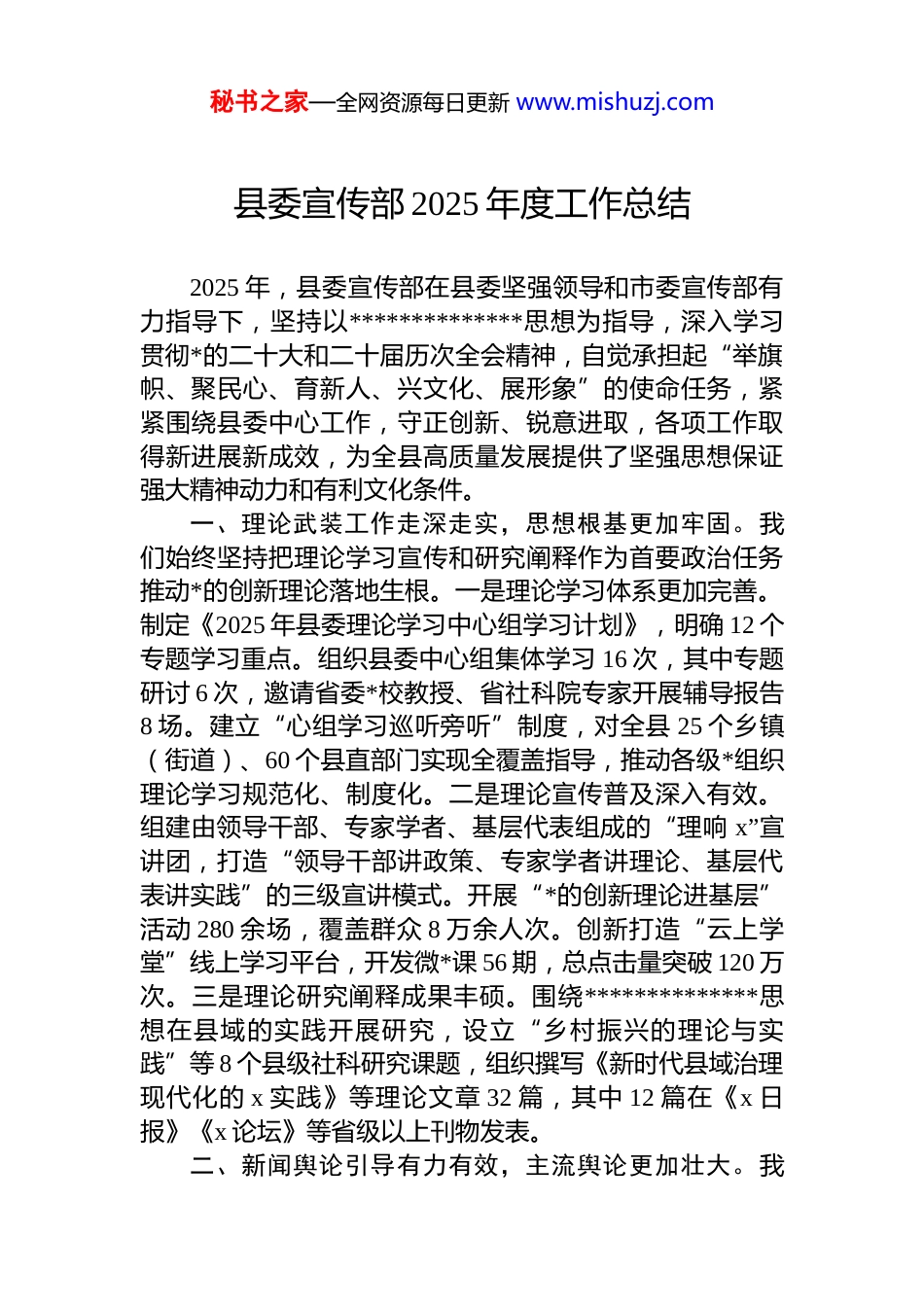 秘书之家—全网资源每日更新 www.mishuzj.com县委宣传部 2025 年度工作总结2025 年,县委宣传部在县委坚强领导和市委宣传部有力指导下,坚持以**************思想为指导,深入学习贯彻*的二十大和二十届历次全会精神,自觉承担起“举旗帜、聚民心、育新人、兴文化、展形象”的使命任务,紧紧围绕县委中心工作,守正创新、锐意进取,各项工作取得新进展新成效,为全县高质量发展提供了坚强思想保证强大精神动力和有利文化条件。一、理论武装工作走深走实,思想根基更加牢固。我们始终坚持把理论学习宣传和研究阐释作为首要政治任务推动*的创新理论落地生根。一是理论学习体系更加完善。制定《2025 年县委理论学习中心组学习计划》,明确 12 个专题学习重点。组织县委中心组集体学习 16 次,其中专题研讨 6 次,邀请省委*校教授、省社科院专家开展辅导报告8 场。建立“心组学习巡听旁听”制度,对全县 25 个乡镇(街道)、60 个县直部门实现全覆盖指导,推动各级*组织理论学习规范化、制度化。二是理论宣传普及深入有效。组建由领导干部、专家学者、基层代表组成的“理响 x”宣讲团,打造“领导干部讲政策、专家学者讲理论、基层代表讲实践”的三级宣讲模式。开展“*的创新理论进基层”活动 280 余场,覆盖群众 8 万余人次。创新打造“云上学堂”线上学习平台,开发微*课 56 期,总点击量突破 120 万次。三是理论研究阐释成果丰硕。围绕**************思想在县域的实践开展研究,设立“乡村振兴的理论与实践”等 8 个县级社科研究课题,组织撰写《新时代县域治理现代化的 x 实践》等理论文章 32 篇,其中 12 篇在《x 日报》《x 论坛》等省级以上刊物发表。二、新闻舆论引导有力有效,主流舆论更加壮大。我秘书之家—全网资源每日更新 www.mishuzj.com们始终坚持正确的舆论导向,持续巩固壮大主流思想舆论阵地。一是重大主题宣传声势强劲。精心策划“奋进新时代·聚焦新发展”系列主题宣传活动。在人民日报、新华社、央视等中央媒体刊发稿件 86 篇,其中《x 县:绿色发展助推乡村振兴》在人民日报头版刊发;在省级主流媒体发稿325 篇。县融媒体中心开设“高质量发展调研行”等专题专栏 15 个,播发报道 2800 余条。二是媒体融合发展提质增效。完成县融媒体中心“中央厨房”升级改造,打造“一次采集、多元生成、全媒传播”的内容生产体系。“x 云”客户端下载量突破 50 万,日均活跃用户达 8 万。推出《书记带货助农》等爆款短视频 36 个,其中《守护绿水青山》单条播放量达 680 万。三是舆情处置能力持续提升。建立“县-乡-村”三级舆情监测网络,配备专职网评员 156 名。全年监测处置涉县重大舆情 28 起,编报《舆情专报》156 期。开展网络评论员培训 4 次,组织应急演练 2 次,确保关键时刻能够快速反应、有效引导。三、精神文明建设深化拓展,道德风尚更加彰显。我们始终坚持以社会主义核心价值观为引领,着力提升社会文明程度。一是核心价值观深入人心。深入开展“强国复兴有我”群众性主题宣传教育活动 126 场。创新开展“我们的节日”系列文化活动,组织“清明祭英烈”“中秋话团圆”等活动 89 场。推动社会主义核心价值观融入村规民约、学生守则、行业规范,制作公益广告牌 356 块。二是文明创建取得新突破。成功创建省级文明单位 8 个、文明村镇 12个、文明校园 6 所。实施文明城市创建“十大提升行动”,整治市容环境问题 568 处,新增停车位 1200 个,施划交通标线 35 公里。在农村推广“文明积分制”,建立“红白理事会”实现行政村全覆盖。三是道德建设成效显著。评选表彰“x 好人”86 名、“道德模范”25 名,其中 3 人入选“中国好人榜”,2 人获评省级道德模范。组建先进事迹报告团,开展巡回报告 28 场,直接听众达 2 万余人。建设秘书之家—全网资源每日更新 www.mishuzj.com“好人广场”12 个,营造了崇德向善的浓厚氛围。四是文明实践创新发展。建成新时代文明实践中心 1 个、实践所25 个、实践站 386 个,实现县乡村三级全覆盖。打造“8+n”志愿服务体系,注册...
