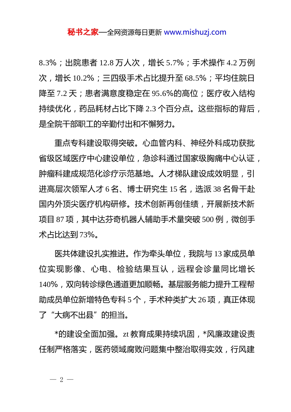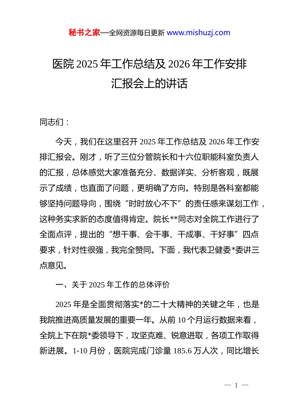 秘书之家—全网资源每日更新 www.mishuzj.com医院 2025 年工作总结及 2026 年工作安排汇报会上的讲话同志们:今天,我们在这里召开 2025 年工作总结及 2026 年工作安排汇报会。刚才,听了三位分管院长和十六位职能科室负责人的汇报,总体感觉大家准备充分、数据详实、分析客观,既展示了成绩,也直面了问题,更明确了方向。特别是各科室都能够坚持问题导向,围绕“时时放心不下”的责任感来谋划工作,这种务实求新的态度值得肯定。院长**同志对全院工作进行了全面点评,提出的“想干事、会干事、干成事、干好事”四点要求,针对性很强,我完全赞同。下面,我代表卫健委*委讲三点意见。一、关于 2025 年工作的总体评价2025 年是全面贯彻落实*的二十大精神的关键之年,也是我院推进高质量发展的重要一年。从前 10 个月运行数据来看,全院上下在院*委领导下,攻坚克难、锐意进取,各项工作取得新进展。1-10 月份,医院完成门诊量 185.6 万人次,同比增长— 1 —秘书之家—全网资源每日更新 www.mishuzj.com8.3%;出院患者 12.8 万人次,增长 5.7%;手术操作 4.2 万例次,增长 10.2%;三四级手术占比提升至 68.5%;平均住院日降至 7.2 天;患者满意度稳定在 95.6%的高位;医疗收入结构持续优化,药品耗材占比下降 2.3 个百分点。这些指标的背后,是全院干部职工的辛勤付出和不懈努力。重点专科建设取得突破。心血管内科、神经外科成功获批省级区域医疗中心建设单位,急诊科通过国家级胸痛中心认证,肿瘤科建成规范化诊疗示范基地。人才梯队建设成效明显,引进高层次领军人才 6 名、博士研究生 15 名,选派 38 名骨干赴国内外顶尖医疗机构研修。技术创新再创佳绩,开展新技术新项目 87 项,其中达芬奇机器人辅助手术量突破 500 例,微创手术占比达到 73%。医共体建设扎实推进。作为牵头单位,我院与 13 家成员单位实现影像、心电、检验结果互认,远程会诊量同比增长140%,双向转诊绿色通道更加顺畅。基层服务能力提升工程帮助成员单位新增特色专科 5 个,手术种类扩大 26 项,真正体现了“大病不出县”的担当。*的建设全面加强。zt 教育成果持续巩固,*风廉政建设责任制严格落实,医药领域腐败问题集中整治取得实效,行风建— 2 —秘书之家—全网资源每日更新 www.mishuzj.com设九项准则执行到位,医务人员廉洁从业意识显著增强。这些成绩来之不易,必须充分肯定。二、当前面临的形势与问题在肯定成绩的同时,更要保持清醒头脑。当前,国家卫生健康事业发展进入新阶段,人民群众对优质医疗服务的需求日益增长,医保支付方式改革持续深化,区域医疗竞争日趋激烈。我们必须正视自身存在的短板和不足。第一,发展不平衡不充分的问题依然突出。从汇报情况看,各科室之间、医护之间、医护技之间的发展水平存在明显差异。部分科室满足于现状,缺乏追求卓越的动力;个别部门创新意识不强,服务流程优化停留在表面,患者就医体验仍有较大提升空间。门诊患者平均等候时间仍高达 38 分钟,住院患者检查预约周期最长需 5 天,这些“中梗阻”问题直接影响了群众就医获得感。第二,医疗服务能力与群众期盼尚有差距。虽然整体业务量保持增长,但高层次人才占比仅为 3.2%,低于省内同类医院平均水平;国家级重点专科仍是空白;在重大疾病诊治、疑难危重患者救治方面,核心竞争力和辐射力还不够强。日均在院— 3 —秘书之家—全网资源每日更新 www.mishuzj.com患者 2700 人次,加床率经常突破 110%,医疗安全风险隐患不容忽视。第三,运营管理的精细化水平亟待提升。成本控制机制不够健全,部分科室耗材使用存在不合理现象;信息化建设存在“烟囱林立”问题,各业务系统数据尚未完全互联互通,影响了管理效率。医保基金使用效率需要进一步提高,dip 支付方式改革下的临床路径管理覆盖面仅为 65%。第四,干部作风建设仍需持续用力。少数中层干部担当精神不足,遇到问题绕道走、碰到矛盾躲着走;有的部门协同配合意识不强,科室壁垒现象依然存在;个别医务人员服务态度生硬,医患沟通不到位,投诉量虽有下降但仍时有发生。这些问题,必...