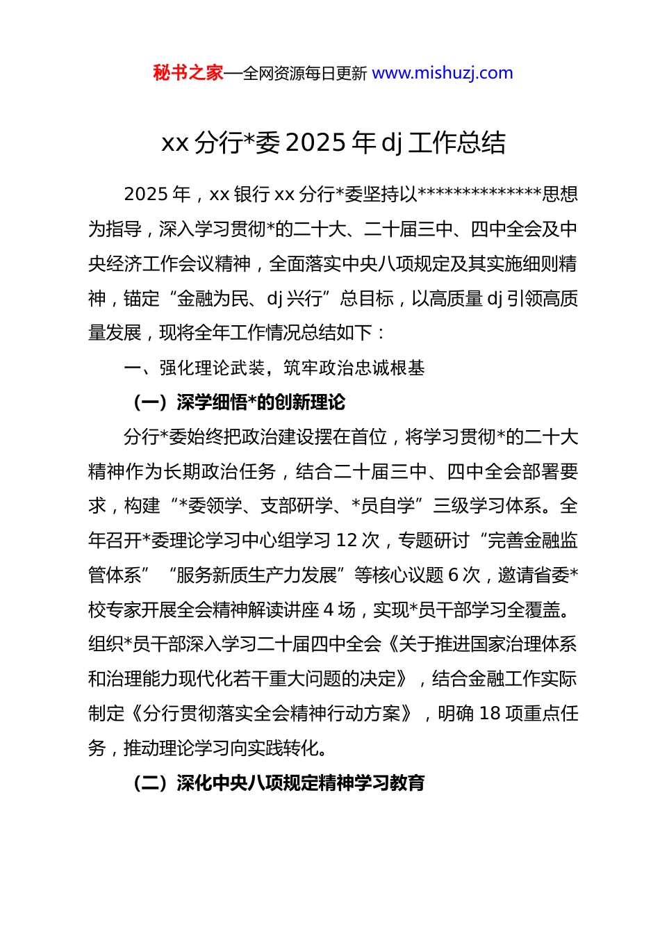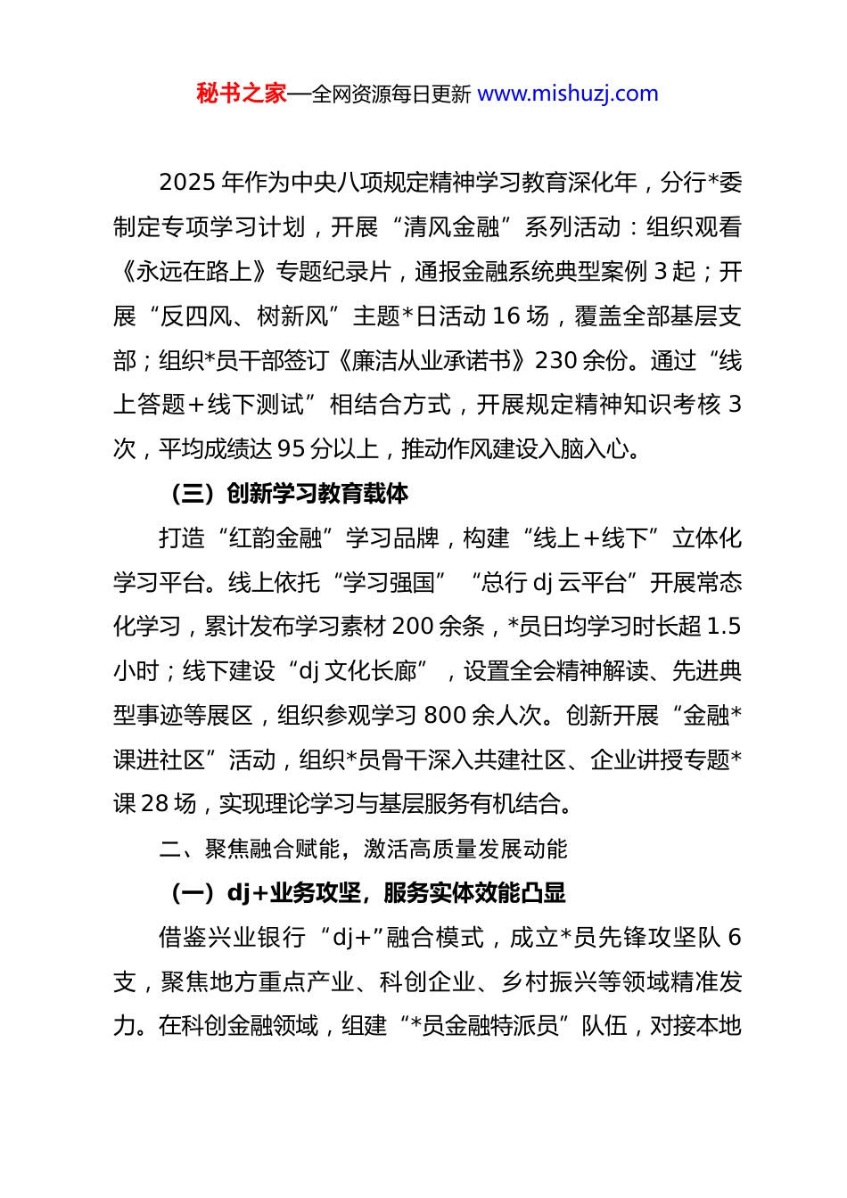 秘书之家—全网资源每日更新 www.mishuzj.comxx 分行*委 2025 年 dj 工作总结2025 年,xx 银行 xx 分行*委坚持以**************思想为指导,深入学习贯彻*的二十大、二十届三中、四中全会及中央经济工作会议精神,全面落实中央八项规定及其实施细则精神,锚定“金融为民、dj 兴行”总目标,以高质量 dj 引领高质量发展,现将全年工作情况总结如下:一、强化理论武装,筑牢政治忠诚根基(一)深学细悟*的创新理论分行*委始终把政治建设摆在首位,将学习贯彻*的二十大精神作为长期政治任务,结合二十届三中、四中全会部署要求,构建“*委领学、支部研学、*员自学”三级学习体系。全年召开*委理论学习中心组学习 12 次,专题研讨“完善金融监管体系”“服务新质生产力发展”等核心议题 6 次,邀请省委*校专家开展全会精神解读讲座 4 场,实现*员干部学习全覆盖。组织*员干部深入学习二十届四中全会《关于推进国家治理体系和治理能力现代化若干重大问题的决定》,结合金融工作实际制定《分行贯彻落实全会精神行动方案》,明确 18 项重点任务,推动理论学习向实践转化。(二)深化中央八项规定精神学习教育秘书之家—全网资源每日更新 www.mishuzj.com2025 年作为中央八项规定精神学习教育深化年,分行*委制定专项学习计划,开展“清风金融”系列活动:组织观看《永远在路上》专题纪录片,通报金融系统典型案例 3 起;开展“反四风、树新风”主题*日活动 16 场,覆盖全部基层支部;组织*员干部签订《廉洁从业承诺书》230 余份。通过“线上答题+线下测试”相结合方式,开展规定精神知识考核 3次,平均成绩达 95 分以上,推动作风建设入脑入心。(三)创新学习教育载体打造“红韵金融”学习品牌,构建“线上+线下”立体化学习平台。线上依托“学习强国”“总行 dj 云平台”开展常态化学习,累计发布学习素材 200 余条,*员日均学习时长超 1.5小时;线下建设“dj 文化长廊”,设置全会精神解读、先进典型事迹等展区,组织参观学习 800 余人次。创新开展“金融*课进社区”活动,组织*员骨干深入共建社区、企业讲授专题*课 28 场,实现理论学习与基层服务有机结合。二、聚焦融合赋能,激活高质量发展动能(一)dj+业务攻坚,服务实体效能凸显借鉴兴业银行“dj+”融合模式,成立*员先锋攻坚队 6支,聚焦地方重点产业、科创企业、乡村振兴等领域精准发力。在科创金融领域,组建“*员金融特派员”队伍,对接本地秘书之家—全网资源每日更新 www.mishuzj.com科创园区 3 个,为 23 家科技企业提供定制化金融服务,累计投放贷款超 15 亿元,助力培育新质生产力。在绿色金融领域,与市发改委、环保企业开展 dj 共建,创新推出“绿享贷”产品,为 12 个光伏电站、污水处理等绿色项目授信 8.6 亿元,推动区域“双碳”目标落地。截至 2025 年末,分行各项贷款余额 286 亿元,较年初新增 32 亿元,其中实体经济贷款占比达 78%,同比提升 5 个百分点。(二)dj+普惠金融,延伸服务触达范围打造“红色金融网格”服务体系,借鉴招商银行重庆分行“红金渝”网格经验,在全市设立 18 个“红色金融驿站”,整合金融服务、政务咨询、便民代办等功能,覆盖社区、村镇、商圈等重点区域。组织 46 家支行*员网格员下沉基层,开展“金融知识进万家”活动 120 余场,通过乡村大喇叭、赶集宣讲、趣味问答等接地气形式,为“一老一少一新”重点群体普及防诈骗、征信保护等知识,服务群众超 2 万人次。创新“个体工商户主题服务点”,推出“商户贷”“创业贷”等普惠产品,全年累计发放普惠小微贷款 45 亿元,支持小微企业、个体工商户 3200 余家。(三)dj+地方战略,助力区域协同发展主动融入地方发展大局,对接承接大湾区产业转移、文旅秘书之家—全网资源每日更新 www.mishuzj.com康养产业发展等区域战略,成立*员服务专班 3 个,远赴深圳、东莞等地走访企业 15 家,为 8 家迁入本地的企业提供一站式金融服务,授信总额超 20 亿元。围绕 2026 年本地文旅发展大会重点项目,开辟绿色审批通道,为 5 个文旅综合体项目投放贷...