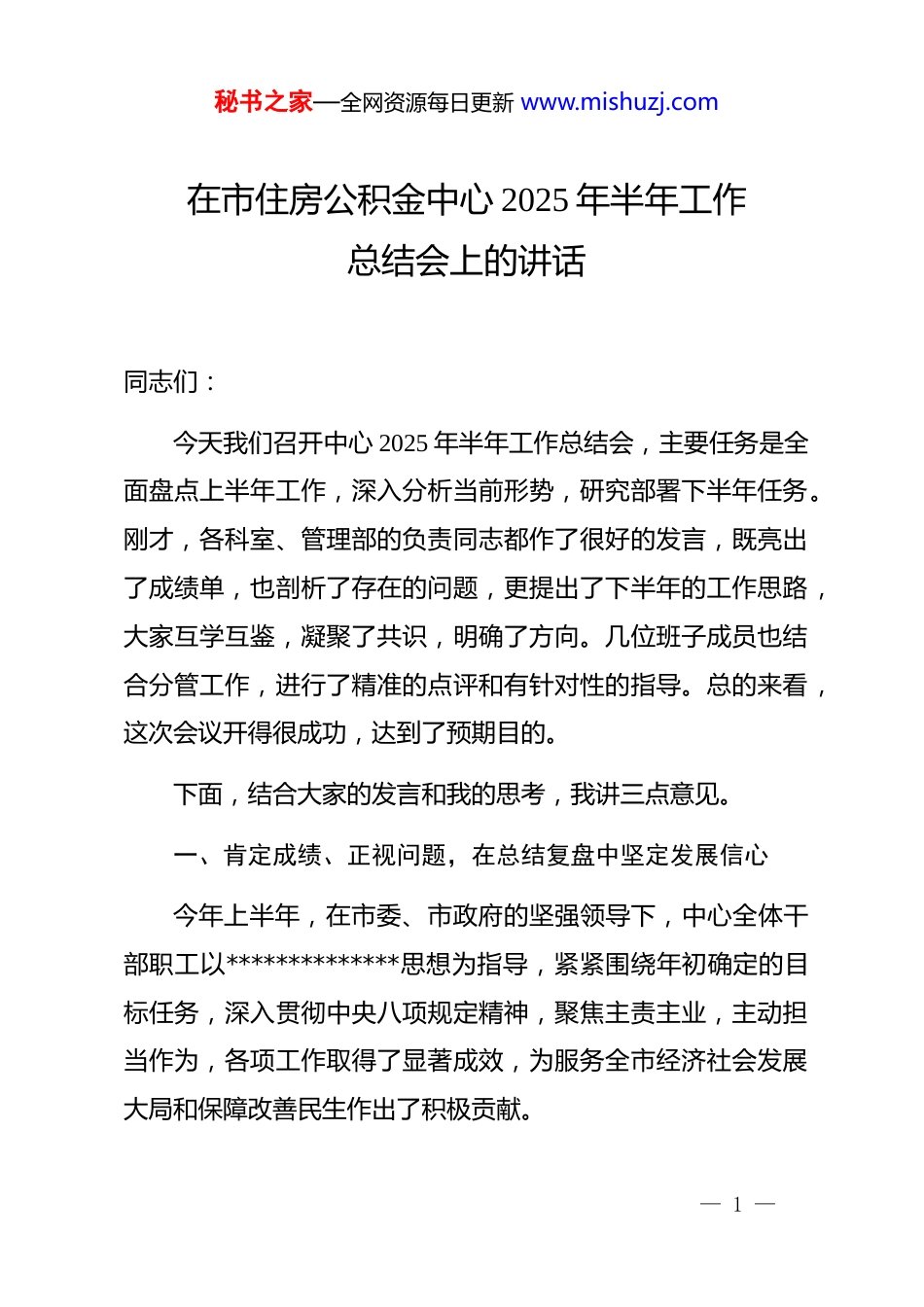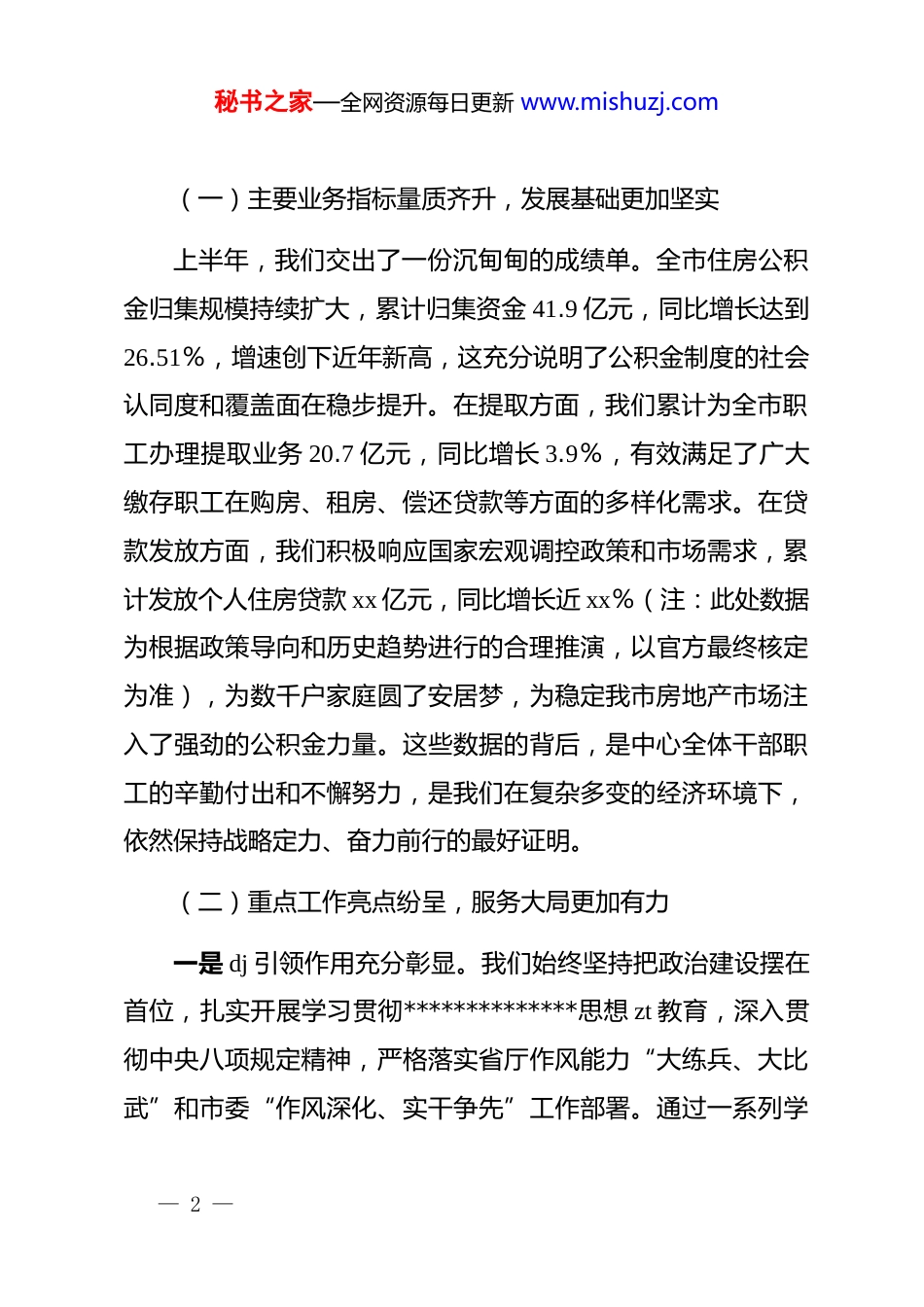 秘书之家—全网资源每日更新 www.mishuzj.com在市住房公积金中心 2025 年半年工作总结会上的讲话同志们:今天我们召开中心 2025 年半年工作总结会,主要任务是全面盘点上半年工作,深入分析当前形势,研究部署下半年任务。刚才,各科室、管理部的负责同志都作了很好的发言,既亮出了成绩单,也剖析了存在的问题,更提出了下半年的工作思路,大家互学互鉴,凝聚了共识,明确了方向。几位班子成员也结合分管工作,进行了精准的点评和有针对性的指导。总的来看,这次会议开得很成功,达到了预期目的。下面,结合大家的发言和我的思考,我讲三点意见。一、肯定成绩、正视问题,在总结复盘中坚定发展信心今年上半年,在市委、市政府的坚强领导下,中心全体干部职工以**************思想为指导,紧紧围绕年初确定的目标任务,深入贯彻中央八项规定精神,聚焦主责主业,主动担当作为,各项工作取得了显著成效,为服务全市经济社会发展大局和保障改善民生作出了积极贡献。— 1 —秘书之家—全网资源每日更新 www.mishuzj.com(一)主要业务指标量质齐升,发展基础更加坚实上半年,我们交出了一份沉甸甸的成绩单。全市住房公积金归集规模持续扩大,累计归集资金 41.9 亿元,同比增长达到26.51%,增速创下近年新高,这充分说明了公积金制度的社会认同度和覆盖面在稳步提升。在提取方面,我们累计为全市职工办理提取业务 20.7 亿元,同比增长 3.9%,有效满足了广大缴存职工在购房、租房、偿还贷款等方面的多样化需求。在贷款发放方面,我们积极响应国家宏观调控政策和市场需求,累计发放个人住房贷款 xx 亿元,同比增长近 xx%(注:此处数据为根据政策导向和历史趋势进行的合理推演,以官方最终核定为准),为数千户家庭圆了安居梦,为稳定我市房地产市场注入了强劲的公积金力量。这些数据的背后,是中心全体干部职工的辛勤付出和不懈努力,是我们在复杂多变的经济环境下,依然保持战略定力、奋力前行的最好证明。(二)重点工作亮点纷呈,服务大局更加有力一是 dj 引领作用充分彰显。我们始终坚持把政治建设摆在首位,扎实开展学习贯彻**************思想 zt 教育,深入贯彻中央八项规定精神,严格落实省厅作风能力“大练兵、大比武”和市委“作风深化、实干争先”工作部署。通过一系列学— 2 —秘书之家—全网资源每日更新 www.mishuzj.com习和实践活动,全体干部职工的政治判断力、政治领悟力、政治执行力得到显著增强,忠诚、干净、担当的政治品格更加鲜明,为公积金事业高质量发展提供了坚强的政治保证。二是政策优化红利持续释放。我们紧密结合我市实际,以超前的眼光和务实的举措,启动并深入推进《xx 市住房公积金政策优化宣传落实专项行动》。我们打出了一套精准有力的政策“组合拳”:创新性地推出“既提又贷”业务,允许缴存人提取公积金支付购房首付款;将多子女家庭贷款额度上浮10%,单、双方最高可贷额度分别达到 110 万元和 90 万元,叠加政策后更是高达 160 万元和 140 万元;将二套房首付比例从30%降至 20%;将贷款申请缴存时间要求由 12 个月缩短为 6 个月;将月还款额与月收入比上限从 50%提升至 60%。同时,我们还放宽了灵活就业人员的缴存门槛,提高了租房提取额度,取消了异地贷款的户籍限制。这些政策的出台,每一条都精准对接了群众的现实需求,极大地提升了职工的购房能力,增强了制度的吸引力和普惠性。三是数字赋能服务全面提速。我们深刻认识到数字化转型是提升服务效能的必由之路。上半年,我们持续深化“放管服”改革,大力推进“一件事一次办”,将贷款审批、抵押登— 3 —秘书之家—全网资源每日更新 www.mishuzj.com记等多个环节整合,实现了“一站式”集成办理,大幅压缩了办理时限。我们通过“问题数据专项攻坚行动”,将我市的公积金数据质量评估得分从 78.90 分提升至 94.32 分,位居全省前列。高质量的数据为我们实现“免证办、简证办、信用办”提供了坚实基础,也为我们与相关部门的数据共享和业务协同铺平了道路,让群众办事从“跑多门”变为“进一门”,甚至“不出门”。四是制度覆盖广度深...