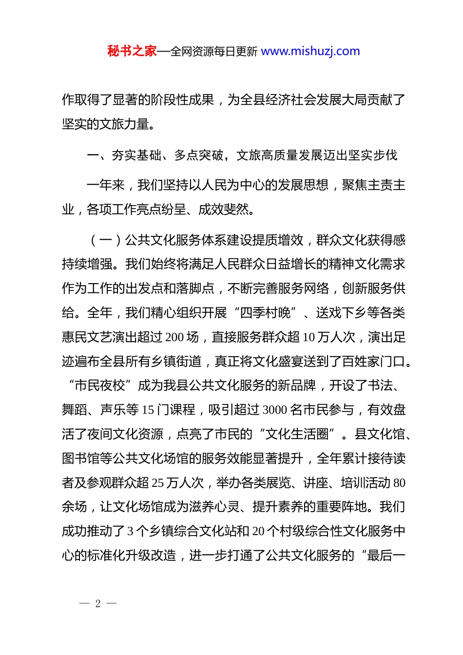 秘书之家—全网资源每日更新 www.mishuzj.com在县文化广电和旅游局 2025 年度工作总结暨2026 年工作谋划会上的讲话同志们:大家好!今天,我们在这里召开全局 2025 年度工作总结暨2026 年工作谋划会,主要任务是全面复盘过去一年的工作成效,系统梳理经验与不足,科学擘画新一年的发展蓝图。刚才,各股室、局属各单位的负责同志都作了很好的发言,既亮出了成绩单,也剖析了存在的问题,分管领导的点评精准到位,点明了症结,也指明了方向。这充分体现了我们文广旅系统求真务实、勇于担当的工作作风。在此,我代表局*组,向为全县文旅事业辛勤付出的全体干部职工,致以最诚挚的感谢和最崇高的敬意。回望 2025 年,这是我县文旅事业高质量发展的攻坚之年,也是我们全体文旅人凝心聚力、砥砺奋进的不凡之年。面对复杂多变的宏观环境和艰巨繁重的发展任务,全局上下在县委、县政府的坚强领导下,紧扣高质量发展主线,以时不我待的紧迫感和舍我其谁的责任感,真抓实干、攻坚克难,推动各项工— 1 —秘书之家—全网资源每日更新 www.mishuzj.com作取得了显著的阶段性成果,为全县经济社会发展大局贡献了坚实的文旅力量。一、夯实基础、多点突破,文旅高质量发展迈出坚实步伐一年来,我们坚持以人民为中心的发展思想,聚焦主责主业,各项工作亮点纷呈、成效斐然。(一)公共文化服务体系建设提质增效,群众文化获得感持续增强。我们始终将满足人民群众日益增长的精神文化需求作为工作的出发点和落脚点,不断完善服务网络,创新服务供给。全年,我们精心组织开展“四季村晚”、送戏下乡等各类惠民文艺演出超过 200 场,直接服务群众超 10 万人次,演出足迹遍布全县所有乡镇街道,真正将文化盛宴送到了百姓家门口。“市民夜校”成为我县公共文化服务的新品牌,开设了书法、舞蹈、声乐等 15 门课程,吸引超过 3000 名市民参与,有效盘活了夜间文化资源,点亮了市民的“文化生活圈”。县文化馆、图书馆等公共文化场馆的服务效能显著提升,全年累计接待读者及参观群众超 25 万人次,举办各类展览、讲座、培训活动 80余场,让文化场馆成为滋养心灵、提升素养的重要阵地。我们成功推动了 3 个乡镇综合文化站和 20 个村级综合性文化服务中心的标准化升级改造,进一步打通了公共文化服务的“最后一— 2 —秘书之家—全网资源每日更新 www.mishuzj.com公里”,城乡一体的公共文化服务体系更加健全。(二)文化遗产保护利用成果丰硕,历史文脉传承展现新活力。我们深知,文化遗产是不可再生的宝贵资源,守护好、传承好、利用好是我们义不容辞的历史责任。2025 年,我们全面启动并扎实推进了第四次全国文物普查工作,组建专业普查队伍,对全县范围内的不可移动文物进行拉网式排查登记,新发现、新认定文物线索 30 余处,为摸清文物家底、实施精准保护奠定了坚实基础。在文物保护修缮方面,我们积极争取上级资金支持,投入超过 800 万元,完成了*古建筑群、*革命旧址等 5 处重点文物保护单位的抢险加固和修缮工程,有效排除了安全隐患,恢复了历史风貌。在非物质文化遗产保护传承方面,我们成功推动“*传统制作技艺”项目入选省级非物质文化遗产代表性项目名录,新增县级非遗代表性传承人 8 名。我们创新举办“非遗购物节”“非遗进景区”等活动,将非遗项目与现代生活、旅游体验相结合,让传统技艺在活态传承中焕发新生机,全年相关活动带动文创产品销售额突破 500 万元。(三)文旅产业融合发展步伐加快,市场主体活力得到有效激发。我们坚持以文塑旅、以旅彰文,全力推动文旅深度融合,培育发展新业态新模式。2025 年,我们成功举办了*县首— 3 —秘书之家—全网资源每日更新 www.mishuzj.com届文化旅游产业发展大会,签约落地重点文旅项目 6 个,总投资额达 15 亿元,为产业发展注入了强劲动力。我们立足县域资源禀赋,精心策划并推出了“古韵寻踪之旅”“生态康养之旅”“红色记忆之旅”三条精品旅游线路,通过整合营销、媒体推广,全年吸引游客量突破 350 万人次,实现旅游综合收入15.2 亿元,较去年同期分别增长 18%和 20%。我们积极拥抱...