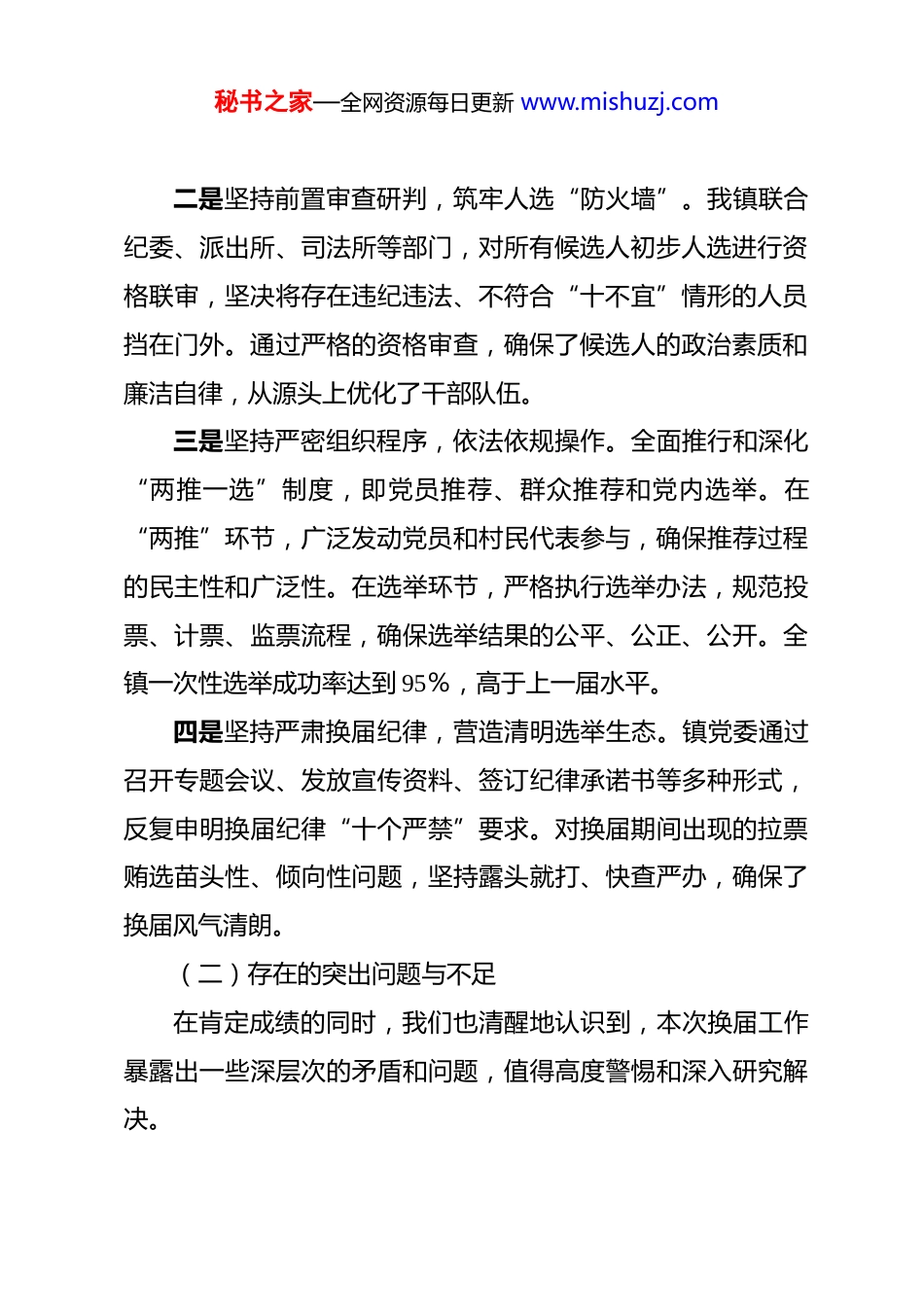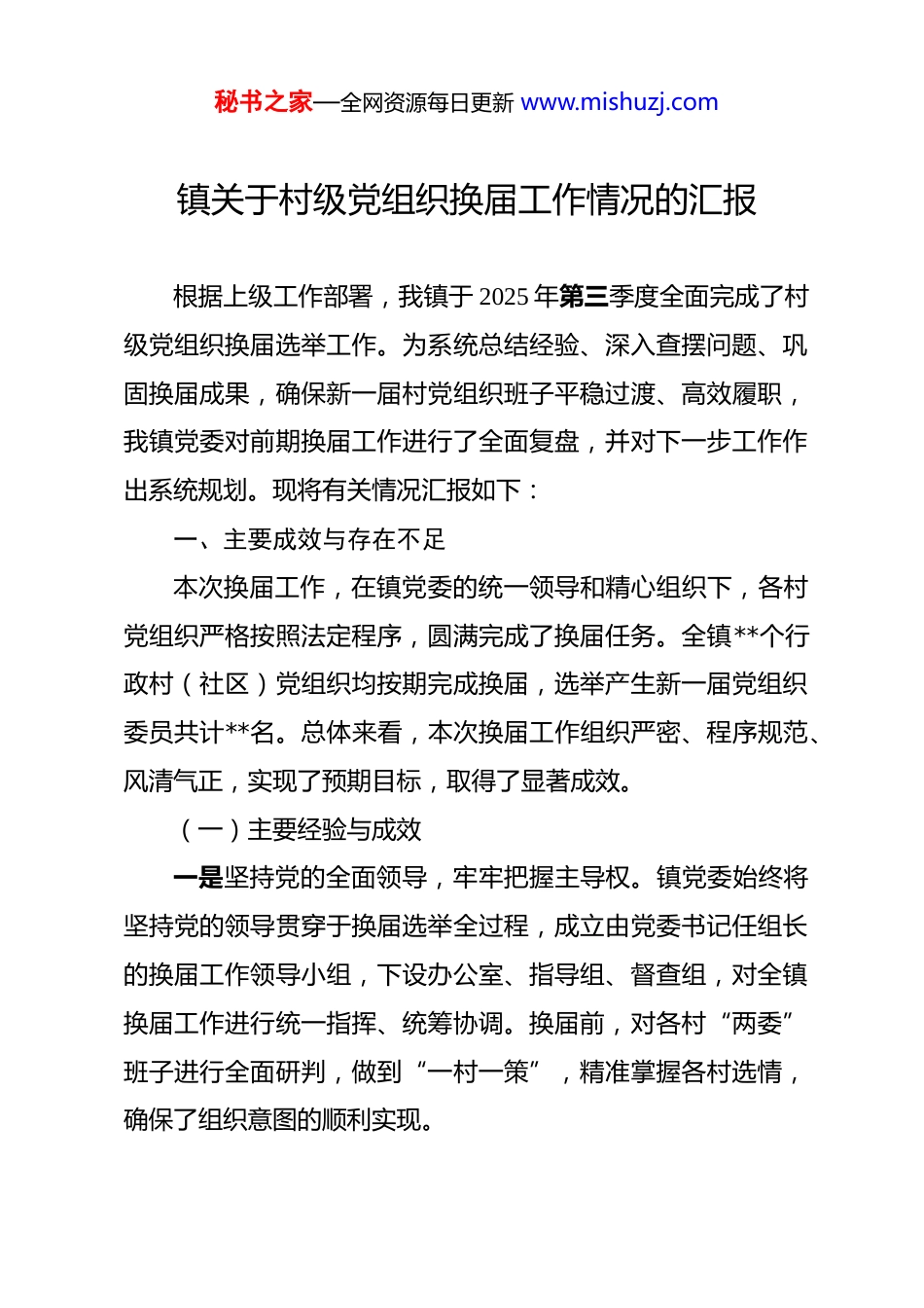 秘书之家—全网资源每日更新 www.mishuzj.com镇关于村级党组织换届工作情况的汇报 根据上级工作部署,我镇于 2025 年第三季度全面完成了村级党组织换届选举工作。为系统总结经验、深入查摆问题、巩固换届成果,确保新一届村党组织班子平稳过渡、高效履职,我镇党委对前期换届工作进行了全面复盘,并对下一步工作作出系统规划。现将有关情况汇报如下:一、主要成效与存在不足本次换届工作,在镇党委的统一领导和精心组织下,各村党组织严格按照法定程序,圆满完成了换届任务。全镇**个行政村(社区)党组织均按期完成换届,选举产生新一届党组织委员共计**名。总体来看,本次换届工作组织严密、程序规范、风清气正,实现了预期目标,取得了显著成效。(一)主要经验与成效一是坚持党的全面领导,牢牢把握主导权。镇党委始终将坚持党的领导贯穿于换届选举全过程,成立由党委书记任组长的换届工作领导小组,下设办公室、指导组、督查组,对全镇换届工作进行统一指挥、统筹协调。换届前,对各村“两委”班子进行全面研判,做到“一村一策”,精准掌握各村选情,确保了组织意图的顺利实现。秘书之家—全网资源每日更新 www.mishuzj.com二是坚持前置审查研判,筑牢人选“防火墙”。我镇联合纪委、派出所、司法所等部门,对所有候选人初步人选进行资格联审,坚决将存在违纪违法、不符合“十不宜”情形的人员挡在门外。通过严格的资格审查,确保了候选人的政治素质和廉洁自律,从源头上优化了干部队伍。三是坚持严密组织程序,依法依规操作。全面推行和深化“两推一选”制度,即党员推荐、群众推荐和党内选举。在“两推”环节,广泛发动党员和村民代表参与,确保推荐过程的民主性和广泛性。在选举环节,严格执行选举办法,规范投票、计票、监票流程,确保选举结果的公平、公正、公开。全镇一次性选举成功率达到 95%,高于上一届水平。四是坚持严肃换届纪律,营造清明选举生态。镇党委通过召开专题会议、发放宣传资料、签订纪律承诺书等多种形式,反复申明换届纪律“十个严禁”要求。对换届期间出现的拉票贿选苗头性、倾向性问题,坚持露头就打、快查严办,确保了换届风气清朗。(二)存在的突出问题与不足在肯定成绩的同时,我们也清醒地认识到,本次换届工作暴露出一些深层次的矛盾和问题,值得高度警惕和深入研究解决。秘书之家—全网资源每日更新 www.mishuzj.com一是部分村庄宗族派系干扰依然存在,选举竞争异常激烈。一些村庄因历史遗留问题、经济利益纠葛等因素,不同姓氏或家族之间的竞争日趋白热化。在“两推一选”过程中,个别候选人为争取选票,暗中进行利益许诺、拉帮结派,对选举秩序造成了一定冲击。二是“两推一选”程序在个别村庄执行不到位,民主质量有待提升。少数村庄在“两推”环节,存在党员和群众代表参与度不高、代表性不强的问题。有的村庄为求省事,将“两推”简化为“一推”,即仅由党员进行推荐,未能充分听取群众意见,导致推荐人选的民意基础不够扎实,为后续选举埋下了隐患。三是干部队伍结构性问题依然突出,后续培养任重道远。部分村庄未能选出 40 岁以下的年轻干部和女干部,班子年龄结构老化、性别结构失衡的问题没有得到根本性扭转。这反映出我镇农村优秀青年人才流失严重,以及女性参政议政的渠道和意愿仍有待加强。四是信访矛盾在换届期间集中爆发,维稳压力较大。换届选举成为一些历史积案和现实矛盾的“引爆点”。部分群众利用换届的特殊时期,通过信访反映村务公开不透明、征地补偿款分配不公、个别干部以权谋私等问题,给换届工作带来了额秘书之家—全网资源每日更新 www.mishuzj.com外的维稳压力。二、重难点村情况分析与风险化解举措在本次换届选举中,我镇有 6 个村(社区)暴露出较为突出的问题,被列为重难点村进行管理。这些村庄的问题具有典型性和代表性,是下一步工作的重中之重。(一)重难点村具体情况一是**村(竞争激烈):该村近年来因**项目征地,获得了数额巨大的集体补偿款,村干部岗位“含金量”骤增。本次换告中,两大宗族势力分别推举候选人,竞争空前激烈。选举期间,出现了互相攻讦、恶意举报、宴请拉票等现象...