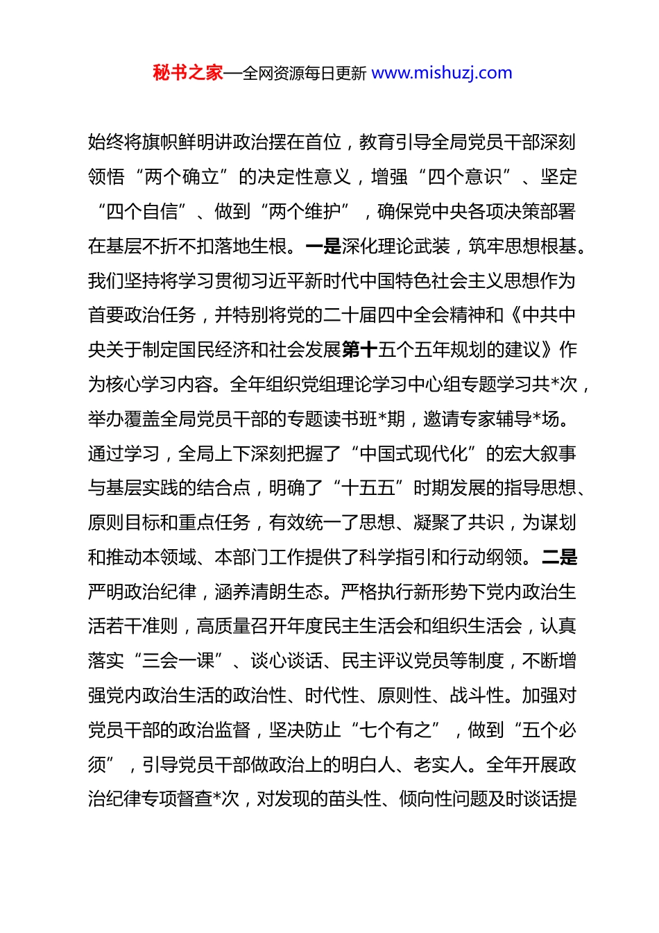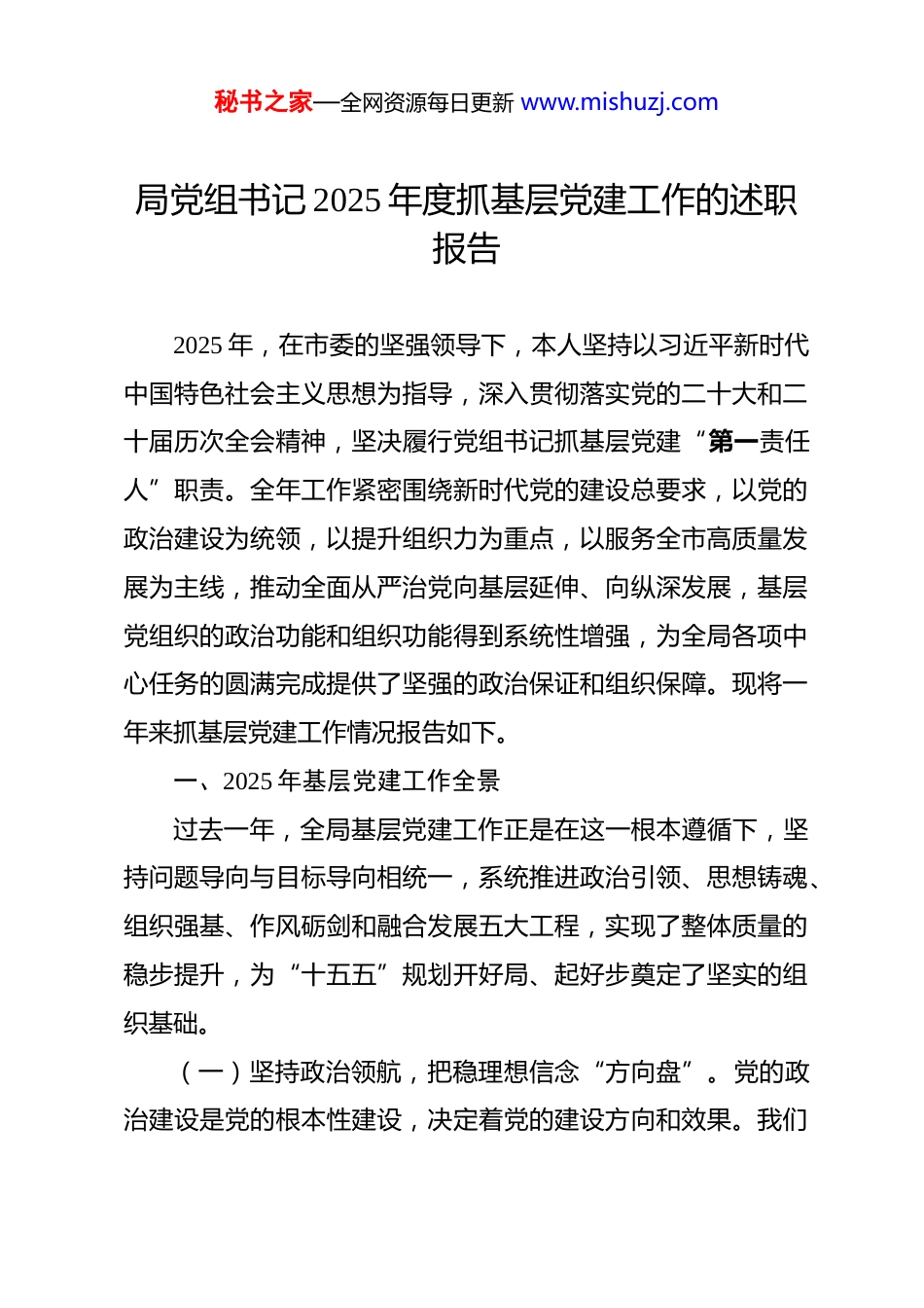 秘书之家—全网资源每日更新 www.mishuzj.com局党组书记 2025 年度抓基层党建工作的述职报告 2025 年,在市委的坚强领导下,本人坚持以习近平新时代中国特色社会主义思想为指导,深入贯彻落实党的二十大和二十届历次全会精神,坚决履行党组书记抓基层党建“第一责任人”职责。全年工作紧密围绕新时代党的建设总要求,以党的政治建设为统领,以提升组织力为重点,以服务全市高质量发展为主线,推动全面从严治党向基层延伸、向纵深发展,基层党组织的政治功能和组织功能得到系统性增强,为全局各项中心任务的圆满完成提供了坚强的政治保证和组织保障。现将一年来抓基层党建工作情况报告如下。一、2025 年基层党建工作全景过去一年,全局基层党建工作正是在这一根本遵循下,坚持问题导向与目标导向相统一,系统推进政治引领、思想铸魂、组织强基、作风砺剑和融合发展五大工程,实现了整体质量的稳步提升,为“十五五”规划开好局、起好步奠定了坚实的组织基础。(一)坚持政治领航,把稳理想信念“方向盘”。党的政治建设是党的根本性建设,决定着党的建设方向和效果。我们秘书之家—全网资源每日更新 www.mishuzj.com始终将旗帜鲜明讲政治摆在首位,教育引导全局党员干部深刻领悟“两个确立”的决定性意义,增强“四个意识”、坚定“四个自信”、做到“两个维护”,确保党中央各项决策部署在基层不折不扣落地生根。一是深化理论武装,筑牢思想根基。我们坚持将学习贯彻习近平新时代中国特色社会主义思想作为首要政治任务,并特别将党的二十届四中全会精神和《中共中央关于制定国民经济和社会发展第十五个五年规划的建议》作为核心学习内容。全年组织党组理论学习中心组专题学习共*次,举办覆盖全局党员干部的专题读书班*期,邀请专家辅导*场。通过学习,全局上下深刻把握了“中国式现代化”的宏大叙事与基层实践的结合点,明确了“十五五”时期发展的指导思想、原则目标和重点任务,有效统一了思想、凝聚了共识,为谋划和推动本领域、本部门工作提供了科学指引和行动纲领。二是严明政治纪律,涵养清朗生态。严格执行新形势下党内政治生活若干准则,高质量召开年度民主生活会和组织生活会,认真落实“三会一课”、谈心谈话、民主评议党员等制度,不断增强党内政治生活的政治性、时代性、原则性、战斗性。加强对党员干部的政治监督,坚决防止“七个有之”,做到“五个必须”,引导党员干部做政治上的明白人、老实人。全年开展政治纪律专项督查*次,对发现的苗头性、倾向性问题及时谈话提秘书之家—全网资源每日更新 www.mishuzj.com醒,确保了全局政治生态持续向好。三是健全决策机制,确保令行禁止。修订完善局党组议事规则和“三重一大”决策制度,凡属重大问题均提交党组会议集体研究决定,确保党的路线方针政策在各项业务工作中得到全面贯彻。建立重大决策部署落实督查机制,对中央和省市委重要会议、文件精神,第一时间传达学习、研究制定落实方案、明确责任分工和时限要求,形成“传达—部署—落实—反馈”的工作闭环,保证了政令畅通、执行有力。(二)聚力思想铸魂,拧紧初心使命“总开关”。思想建设是党的基础性建设。我们坚持不懈用党的创新理论武装头脑、指导实践、推动工作,扎实开展集中性纪律教育和作风建设专项学习,引导党员干部筑牢信仰之基、补足精神之钙、把稳思想之舵。一是高标准开展“深入贯彻中央八项规定精神学习教育”。将此项学习教育作为贯彻落实党的二十届三中全会部署、巩固拓展主题教育成果、深化党纪学习教育的关键举措。制定专项方案,组织全局党员干部原原本本学习中央八项规定及其实施细则精神,重温习近平总书记关于作风建设的重要论述。通过召开警示教育大会、剖析典型案例、参观廉政教育基地等形式,以案明纪、以案促改。学习教育期间,共查摆并整改形式主义、官僚主义具体问题*个,推动修订完善公务接待、会议秘书之家—全网资源每日更新 www.mishuzj.com培训、调研检查等方面制度规定*项,党员干部的纪律规矩意识显著增强。二是常态化推进党性教育。依托本地红色资源,组织开展“追寻红色足迹、传承革命精神”主题党日活动*场,覆盖...