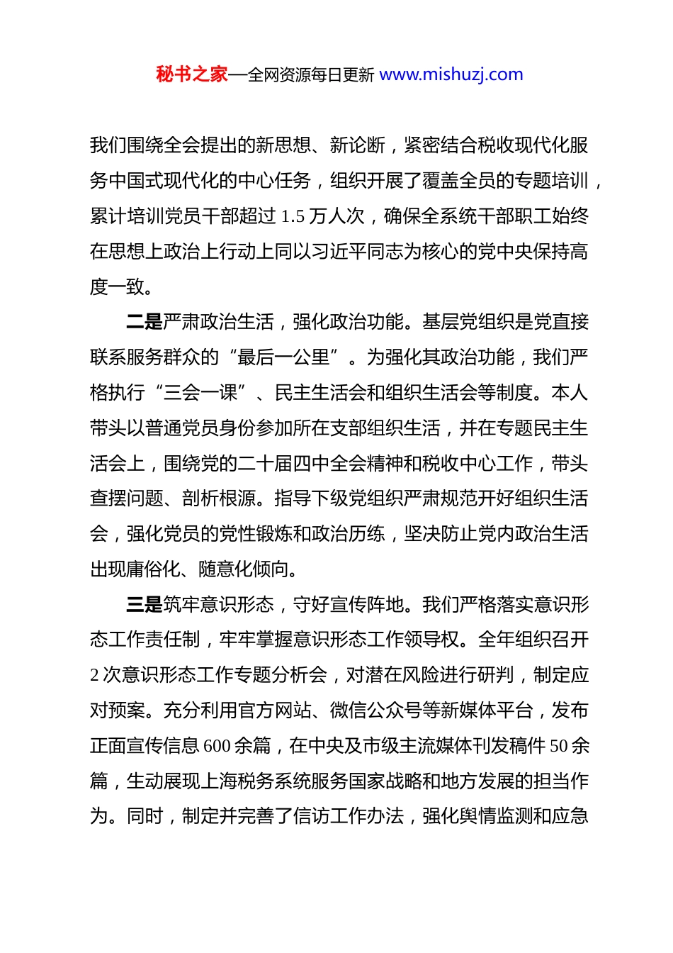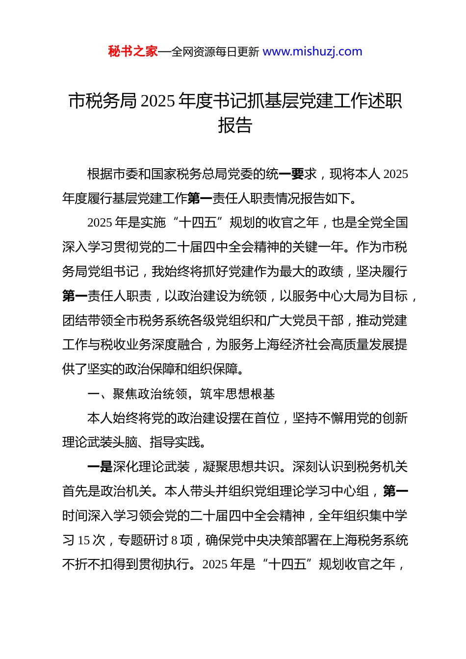 秘书之家—全网资源每日更新 www.mishuzj.com市税务局 2025 年度书记抓基层党建工作述职报告 根据市委和国家税务总局党委的统一要求,现将本人 2025年度履行基层党建工作第一责任人职责情况报告如下。2025 年是实施“十四五”规划的收官之年,也是全党全国深入学习贯彻党的二十届四中全会精神的关键一年。作为市税务局党组书记,我始终将抓好党建作为最大的政绩,坚决履行第一责任人职责,以政治建设为统领,以服务中心大局为目标,团结带领全市税务系统各级党组织和广大党员干部,推动党建工作与税收业务深度融合,为服务上海经济社会高质量发展提供了坚实的政治保障和组织保障。一、聚焦政治统领,筑牢思想根基本人始终将党的政治建设摆在首位,坚持不懈用党的创新理论武装头脑、指导实践。一是深化理论武装,凝聚思想共识。深刻认识到税务机关首先是政治机关。本人带头并组织党组理论学习中心组,第一时间深入学习领会党的二十届四中全会精神,全年组织集中学习 15 次,专题研讨 8 项,确保党中央决策部署在上海税务系统不折不扣得到贯彻执行。2025 年是“十四五”规划收官之年,秘书之家—全网资源每日更新 www.mishuzj.com我们围绕全会提出的新思想、新论断,紧密结合税收现代化服务中国式现代化的中心任务,组织开展了覆盖全员的专题培训,累计培训党员干部超过 1.5 万人次,确保全系统干部职工始终在思想上政治上行动上同以习近平同志为核心的党中央保持高度一致。二是严肃政治生活,强化政治功能。基层党组织是党直接联系服务群众的“最后一公里”。为强化其政治功能,我们严格执行“三会一课”、民主生活会和组织生活会等制度。本人带头以普通党员身份参加所在支部组织生活,并在专题民主生活会上,围绕党的二十届四中全会精神和税收中心工作,带头查摆问题、剖析根源。指导下级党组织严肃规范开好组织生活会,强化党员的党性锻炼和政治历练,坚决防止党内政治生活出现庸俗化、随意化倾向。三是筑牢意识形态,守好宣传阵地。我们严格落实意识形态工作责任制,牢牢掌握意识形态工作领导权。全年组织召开2 次意识形态工作专题分析会,对潜在风险进行研判,制定应对预案。充分利用官方网站、微信公众号等新媒体平台,发布正面宣传信息 600 余篇,在中央及市级主流媒体刊发稿件 50 余篇,生动展现上海税务系统服务国家战略和地方发展的担当作为。同时,制定并完善了信访工作办法,强化舆情监测和应急秘书之家—全网资源每日更新 www.mishuzj.com处置,全年未发生重大涉税舆情和信访事件,有效维护了社会和谐稳定。二、夯实基层基础,提升组织效能基层党组织是党的全部工作和战斗力的基础。一年来,我们持续用力,推动基层党组织全面进步、全面过硬。一是推进组织建设标准化规范化。针对税务系统层级多、党员数量大的特点我们持续深化党支部标准化规范化建设。年初,制定下发了《2025 年度基层党组织标准化建设考评细则》,明确了 25 项具体指标。通过“线上+线下”相结合的方式,对全局 385 个基层党组织进行全覆盖考核验收,推动党支部在组织设置、班子建设、党员教育管理等方面全面达标。根据机构改革和人员变动情况,动态优化党组织设置,确保党的工作覆盖到所有业务单元,目前全局下辖党组织 385 个,党员总数9860 人,实现了应建尽建。二是建强党务干部队伍。党建工作的成效,关键在人。我们高度重视党务干部队伍建设,选优配强党支部书记和党务工作者。今年组织了两期党支部书记专题培训班,培训 120 余人次,内容涵盖《中国共产党支部工作条例(试行)》解读、党建业务融合路径探索等,有效提升了党务干部的专业能力和综合素质。同时,探索建立党务工作与业务工作的干部交流轮岗秘书之家—全网资源每日更新 www.mishuzj.com机制,将 25 名优秀业务骨干充实到党务岗位,为党建工作注入了新的活力。三是创新党建活动载体。为破解党建活动形式单一、吸引力不强的问题,我们积极探索创新。结合纪念抗日战争胜利 80周年,组织全体党员集中观看了阅兵式直播,并开展了线上知识竞赛,参与率达 98%。创建了“蓝税先锋”党建品牌,并指导基...