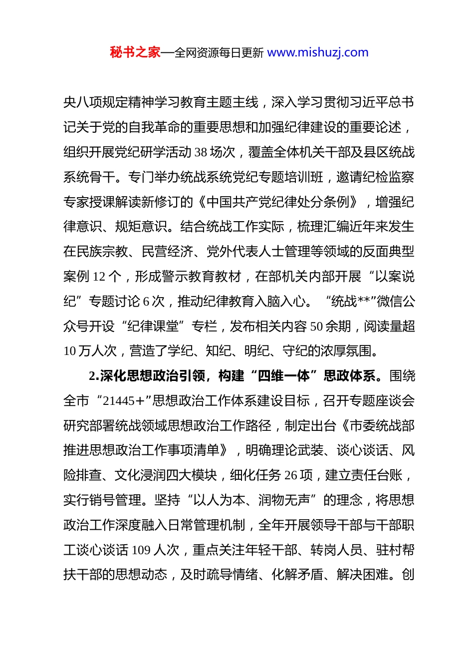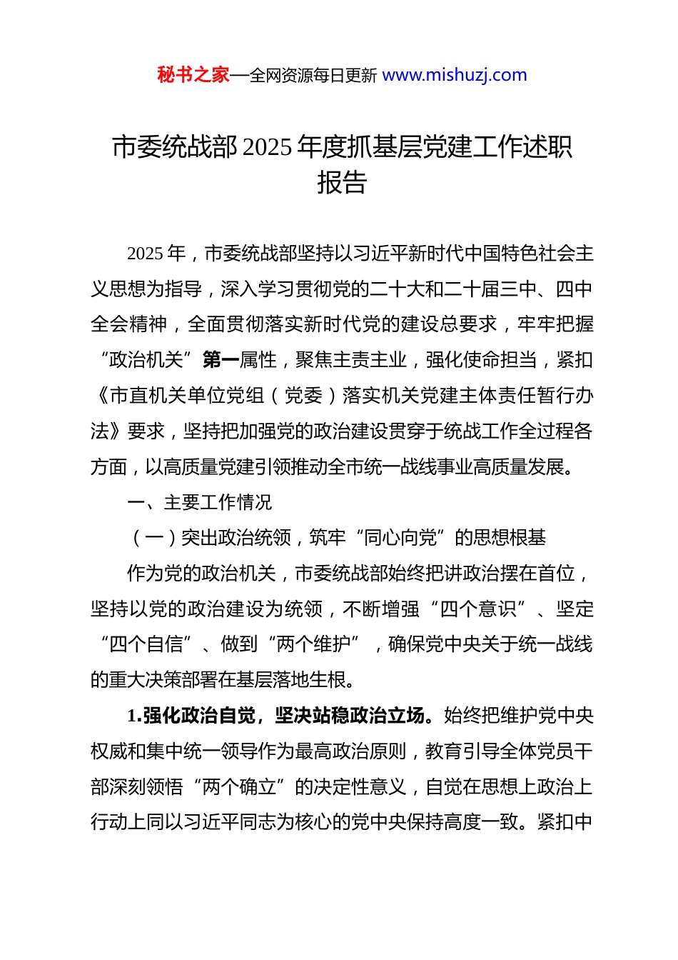 秘书之家—全网资源每日更新 www.mishuzj.com市委统战部 2025 年度抓基层党建工作述职报告 2025 年,市委统战部坚持以习近平新时代中国特色社会主义思想为指导,深入学习贯彻党的二十大和二十届三中、四中全会精神,全面贯彻落实新时代党的建设总要求,牢牢把握“政治机关”第一属性,聚焦主责主业,强化使命担当,紧扣《市直机关单位党组(党委)落实机关党建主体责任暂行办法》要求,坚持把加强党的政治建设贯穿于统战工作全过程各方面,以高质量党建引领推动全市统一战线事业高质量发展。一、主要工作情况(一)突出政治统领,筑牢“同心向党”的思想根基作为党的政治机关,市委统战部始终把讲政治摆在首位,坚持以党的政治建设为统领,不断增强“四个意识”、坚定“四个自信”、做到“两个维护”,确保党中央关于统一战线的重大决策部署在基层落地生根。1.强化政治自觉,坚决站稳政治立场。始终把维护党中央权威和集中统一领导作为最高政治原则,教育引导全体党员干部深刻领悟“两个确立”的决定性意义,自觉在思想上政治上行动上同以习近平同志为核心的党中央保持高度一致。紧扣中秘书之家—全网资源每日更新 www.mishuzj.com央八项规定精神学习教育主题主线,深入学习贯彻习近平总书记关于党的自我革命的重要思想和加强纪律建设的重要论述,组织开展党纪研学活动 38 场次,覆盖全体机关干部及县区统战系统骨干。专门举办统战系统党纪专题培训班,邀请纪检监察专家授课解读新修订的《中国共产党纪律处分条例》,增强纪律意识、规矩意识。结合统战工作实际,梳理汇编近年来发生在民族宗教、民营经济、党外代表人士管理等领域的反面典型案例 12 个,形成警示教育教材,在部机关内部开展“以案说纪”专题讨论 6 次,推动纪律教育入脑入心。“统战**”微信公众号开设“纪律课堂”专栏,发布相关内容 50 余期,阅读量超10 万人次,营造了学纪、知纪、明纪、守纪的浓厚氛围。2.深化思想政治引领,构建“四维一体”思政体系。围绕全市“21445+”思想政治工作体系建设目标,召开专题座谈会研究部署统战领域思想政治工作路径,制定出台《市委统战部推进思想政治工作事项清单》,明确理论武装、谈心谈话、风险排查、文化浸润四大模块,细化任务 26 项,建立责任台账,实行销号管理。坚持“以人为本、润物无声”的理念,将思想政治工作深度融入日常管理机制,全年开展领导干部与干部职工谈心谈话 109 人次,重点关注年轻干部、转岗人员、驻村帮扶干部的思想动态,及时疏导情绪、化解矛盾、解决困难。创秘书之家—全网资源每日更新 www.mishuzj.com新开展机关思想政治工作满意度测评,设计涵盖组织关怀、价值认同、职业归属感等 5 个维度 31 项指标的调查问卷,回收有效问卷 98 份,综合满意度达 96.7%,为优化思想政治工作机制提供了数据支撑和决策参考。通过制度化安排与人性化关怀相结合,进一步增强了统战干部队伍的政治认同、思想认同和情感认同。3.抓实理论武装,打造“五位一体”学习格局。坚持把学习贯彻习近平新时代中国特色社会主义思想作为首要政治任务,统筹制定年度学习计划和教育培训方案,健全完善“第一议题”制度、理论学习中心组学习制度、青年理论学习小组制度三项机制,推动理论学习常态化、规范化、实效化。全年组织召开部务会“第一议题”学习 42 次,理论学习中心组集体学习12 次,围绕党的二十届三中全会精神、铸牢中华民族共同体意识、新型政党制度等重大理论问题开展专题研讨 8 次。依托“同心大讲堂”平台,举办各类专题读书班、辅导讲座、交流分享等活动 100 余场,参与人数累计超过 2000 人次。举办全市统战干部能力提升专题研讨班、民族宗教政策法规培训班等 17期,培训市县两级统战干部逾 600 人次。注重发挥“关键少数”示范作用,形成“领导班子带头学、党组织牵头抓、业务骨干立标杆、青年干部争先锋、全体职工全覆盖”的理论武装秘书之家—全网资源每日更新 www.mishuzj.com新格局。特别是加强青年干部培养,设立青年理论学习小组轮值主持人机制,鼓励年轻干部走上讲台讲业务、谈体会,激发学习主动性与创造...