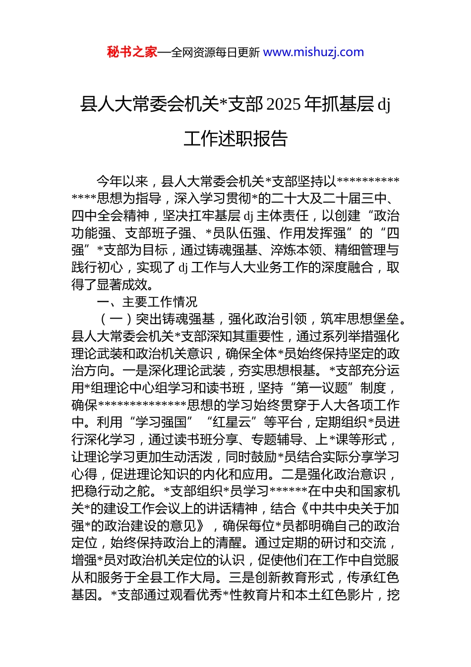 秘书之家—全网资源每日更新 www.mishuzj.com县人大常委会机关*支部 2025 年抓基层 dj工作述职报告今年以来,县人大常委会机关*支部坚持以**************思想为指导,深入学习贯彻*的二十大及二十届三中、四中全会精神,坚决扛牢基层 dj 主体责任,以创建“政治功能强、支部班子强、*员队伍强、作用发挥强”的“四强”*支部为目标,通过铸魂强基、淬炼本领、精细管理与践行初心,实现了 dj 工作与人大业务工作的深度融合,取得了显著成效。一、主要工作情况(一)突出铸魂强基,强化政治引领,筑牢思想堡垒。县人大常委会机关*支部深知其重要性,通过系列举措强化理论武装和政治机关意识,确保全体*员始终保持坚定的政治方向。一是深化理论武装,夯实思想根基。*支部充分运用*组理论中心组学习和读书班,坚持“第一议题”制度,确保**************思想的学习始终贯穿于人大各项工作中。利用“学习强国”“红星云”等平台,定期组织*员进行深化学习,通过读书班分享、专题辅导、上*课等形式,让理论学习更加生动活泼,同时鼓励*员结合实际分享学习心得,促进理论知识的内化和应用。二是强化政治意识,把稳行动之舵。*支部组织*员学习******在中央和国家机关*的建设工作会议上的讲话精神,结合《中共中央关于加强*的政治建设的意见》,确保每位*员都明确自己的政治定位,始终保持政治上的清醒。通过定期的研讨和交流,增强*员对政治机关定位的认识,促使他们在工作中自觉服从和服务于全县工作大局。三是创新教育形式,传承红色基因。*支部通过观看优秀*性教育片和本土红色影片,挖秘书之家—全网资源每日更新 www.mishuzj.com掘身边的红色资源,讲述先进典型的故事,使得*的初心使命在*员心中生动呈现。组织*员参观通道转兵红色基地,走近英雄人物,使*员在心中树立起对*忠诚的榜样,以此激发他们的政治热情和担当精神。(二)聚焦淬炼本领,抓实队伍培育,激发*员活力。县人大常委会机关*支部深知队伍建设对于提升*务能力与*员活力的重要性。*支部从培训赋能、跟班实训出发,致力于打造出一支专业且充满活力的*务队伍,为“四强”*支部的创建提供了坚实的人才保障。一是精研业务知识,提升专业素养。*支部精心组织了一系列专题集训活动,邀请*校理论专家进行辅导,系统解读*章*规、*的最新理论成果以及基层 dj 工作实务规范,结合典型案例剖析*务工作中的重点难点问题;同时借鉴线上*务工作技能实操课堂,鼓励支部班子成员学习 dj 材料撰写、组织生活流程规范、*员信息系统维护等核心业务,帮助新任*务工作者迅速适应角色要求。二是强化实战训练,锻造骨干力量。*支部实施了“业务骨干培育计划”,安排新任*务专干到县委巡察组和县直工委进行实战训练,通过实际操作和一对一指导,确保新任*务工作者不仅理论知识扎实,实际操作能力也得到提升。这一计划的实施,不仅快速提升了*务专干的能力,还形成了“培训一人,带动一片”的辐射效应,整体提升了*务队伍的业务水平。三是情系社区服务,展现先锋形象。*支部组织*员参与“社区共建共享”*员志愿服务,让他们在一线服务中磨炼*性,增强对*的认同感和归属感。在文明创建、抗灾救灾等重大任务中,*员们佩戴*徽,亮明身份,积极投入,展现了*员的责任与担当,也激发了*员队伍的活力,增强了组织的凝聚力。(三)坚持精细管理,压实主体责任,提升落实效能。县人大常委会机关*支部在“四强”*支部创建过程中,通过清单化管理、常态化督查和全覆盖述职,构建了一套科学严谨的责任落实体系,有效推动了 dj 工作任务的落地生秘书之家—全网资源每日更新 www.mishuzj.com根。一是细化责任清单,明晰履职路径。*支部将全年机关dj 工作要点细化为具体考核评分细则,确保每个责任主体都清楚明白自己的职责。从书记到班子成员,都制定了责任清单,让每个环节都有一套清晰的行动指南。每月月初*支部都会根据县直工委工作重点下发清单化提示,让 dj 工作始终保持节奏感和执行力。这种清单化管理方式,既强化了责任意识,又降低了执行偏差。二是严格常态督查,确保闭环管理。*支部下发责任清单一周后,通过现场观察、访谈和资料...
