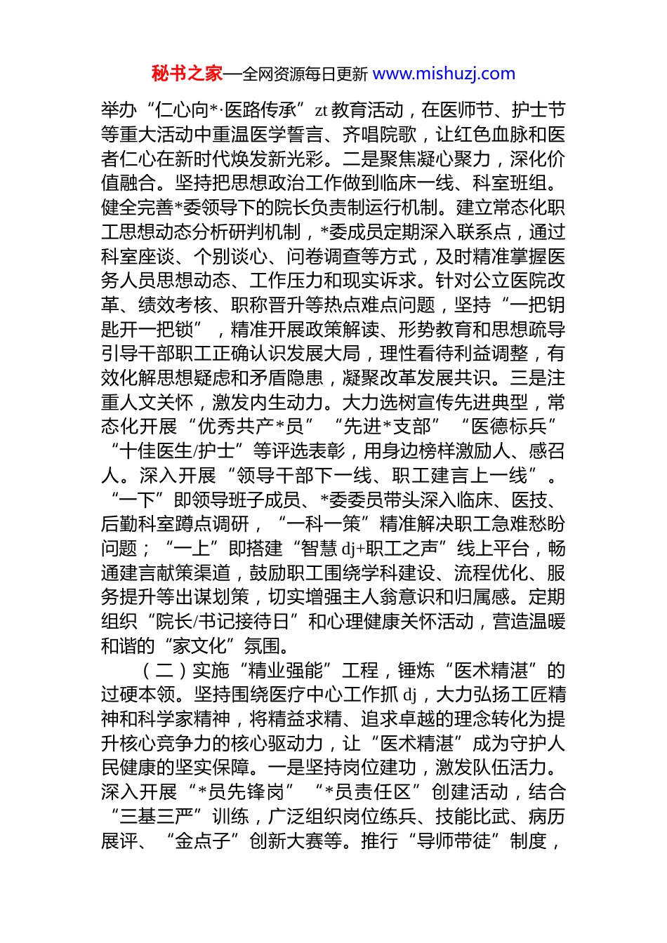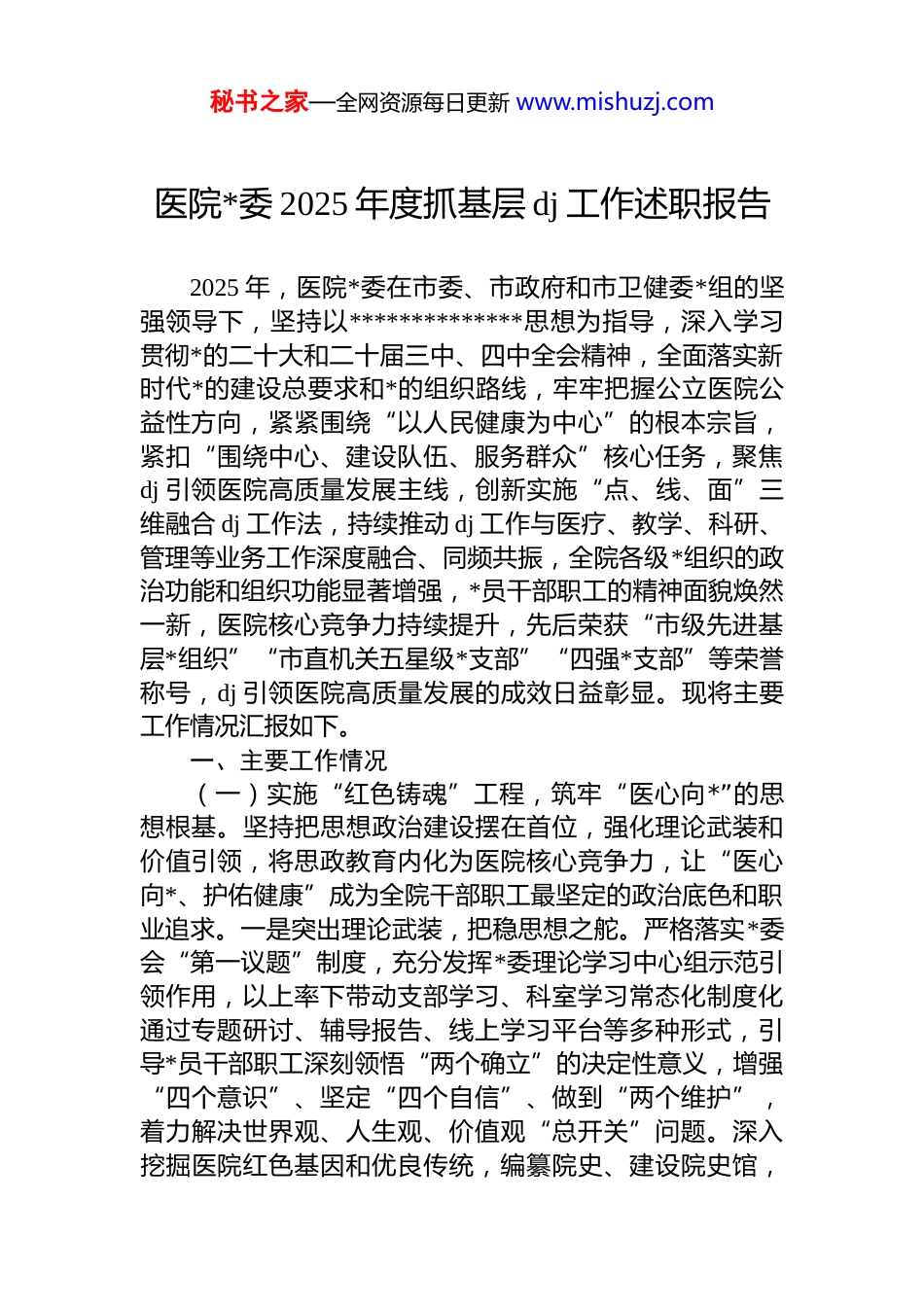 秘书之家—全网资源每日更新 www.mishuzj.com医院*委 2025 年度抓基层 dj 工作述职报告2025 年,医院*委在市委、市政府和市卫健委*组的坚强领导下,坚持以**************思想为指导,深入学习贯彻*的二十大和二十届三中、四中全会精神,全面落实新时代*的建设总要求和*的组织路线,牢牢把握公立医院公益性方向,紧紧围绕“以人民健康为中心”的根本宗旨,紧扣“围绕中心、建设队伍、服务群众”核心任务,聚焦dj 引领医院高质量发展主线,创新实施“点、线、面”三维融合 dj 工作法,持续推动 dj 工作与医疗、教学、科研、管理等业务工作深度融合、同频共振,全院各级*组织的政治功能和组织功能显著增强,*员干部职工的精神面貌焕然一新,医院核心竞争力持续提升,先后荣获“市级先进基层*组织”“市直机关五星级*支部”“四强*支部”等荣誉称号,dj 引领医院高质量发展的成效日益彰显。现将主要工作情况汇报如下。一、主要工作情况(一)实施“红色铸魂”工程,筑牢“医心向*”的思想根基。坚持把思想政治建设摆在首位,强化理论武装和价值引领,将思政教育内化为医院核心竞争力,让“医心向*、护佑健康”成为全院干部职工最坚定的政治底色和职业追求。一是突出理论武装,把稳思想之舵。严格落实*委会“第一议题”制度,充分发挥*委理论学习中心组示范引领作用,以上率下带动支部学习、科室学习常态化制度化通过专题研讨、辅导报告、线上学习平台等多种形式,引导*员干部职工深刻领悟“两个确立”的决定性意义,增强“四个意识”、坚定“四个自信”、做到“两个维护”,着力解决世界观、人生观、价值观“总开关”问题。深入挖掘医院红色基因和优良传统,编纂院史、建设院史馆,秘书之家—全网资源每日更新 www.mishuzj.com举办“仁心向*·医路传承”zt 教育活动,在医师节、护士节等重大活动中重温医学誓言、齐唱院歌,让红色血脉和医者仁心在新时代焕发新光彩。二是聚焦凝心聚力,深化价值融合。坚持把思想政治工作做到临床一线、科室班组。健全完善*委领导下的院长负责制运行机制。建立常态化职工思想动态分析研判机制,*委成员定期深入联系点,通过科室座谈、个别谈心、问卷调查等方式,及时精准掌握医务人员思想动态、工作压力和现实诉求。针对公立医院改革、绩效考核、职称晋升等热点难点问题,坚持“一把钥匙开一把锁”,精准开展政策解读、形势教育和思想疏导引导干部职工正确认识发展大局,理性看待利益调整,有效化解思想疑虑和矛盾隐患,凝聚改革发展共识。三是注重人文关怀,激发内生动力。大力选树宣传先进典型,常态化开展“优秀共产*员”“先进*支部”“医德标兵”“十佳医生/护士”等评选表彰,用身边榜样激励人、感召人。深入开展“领导干部下一线、职工建言上一线”。“一下”即领导班子成员、*委委员带头深入临床、医技、后勤科室蹲点调研,“一科一策”精准解决职工急难愁盼问题;“一上”即搭建“智慧 dj+职工之声”线上平台,畅通建言献策渠道,鼓励职工围绕学科建设、流程优化、服务提升等出谋划策,切实增强主人翁意识和归属感。定期组织“院长/书记接待日”和心理健康关怀活动,营造温暖和谐的“家文化”氛围。(二)实施“精业强能”工程,锤炼“医术精湛”的过硬本领。坚持围绕医疗中心工作抓 dj,大力弘扬工匠精神和科学家精神,将精益求精、追求卓越的理念转化为提升核心竞争力的核心驱动力,让“医术精湛”成为守护人民健康的坚实保障。一是坚持岗位建功,激发队伍活力。深入开展“*员先锋岗”“*员责任区”创建活动,结合“三基三严”训练,广泛组织岗位练兵、技能比武、病历展评、“金点子”创新大赛等。推行“导师带徒”制度,秘书之家—全网资源每日更新 www.mishuzj.com发挥*员专家、学科带头人的传帮带作用,加速青年骨干成长成才,营造“比、学、赶、帮、超”的浓厚氛围。深化与国内外顶尖医学院校、医院的合作,柔性引进高层次人才和专家团队,实现“引进一个专家、带动一个团队、提升一个学科”的雁阵效应,激发全院医务人员追求卓越、勇攀高峰的成才渴望。二是坚持学科引领,构筑发展高地强化*委对学科建设的顶层设计和战...