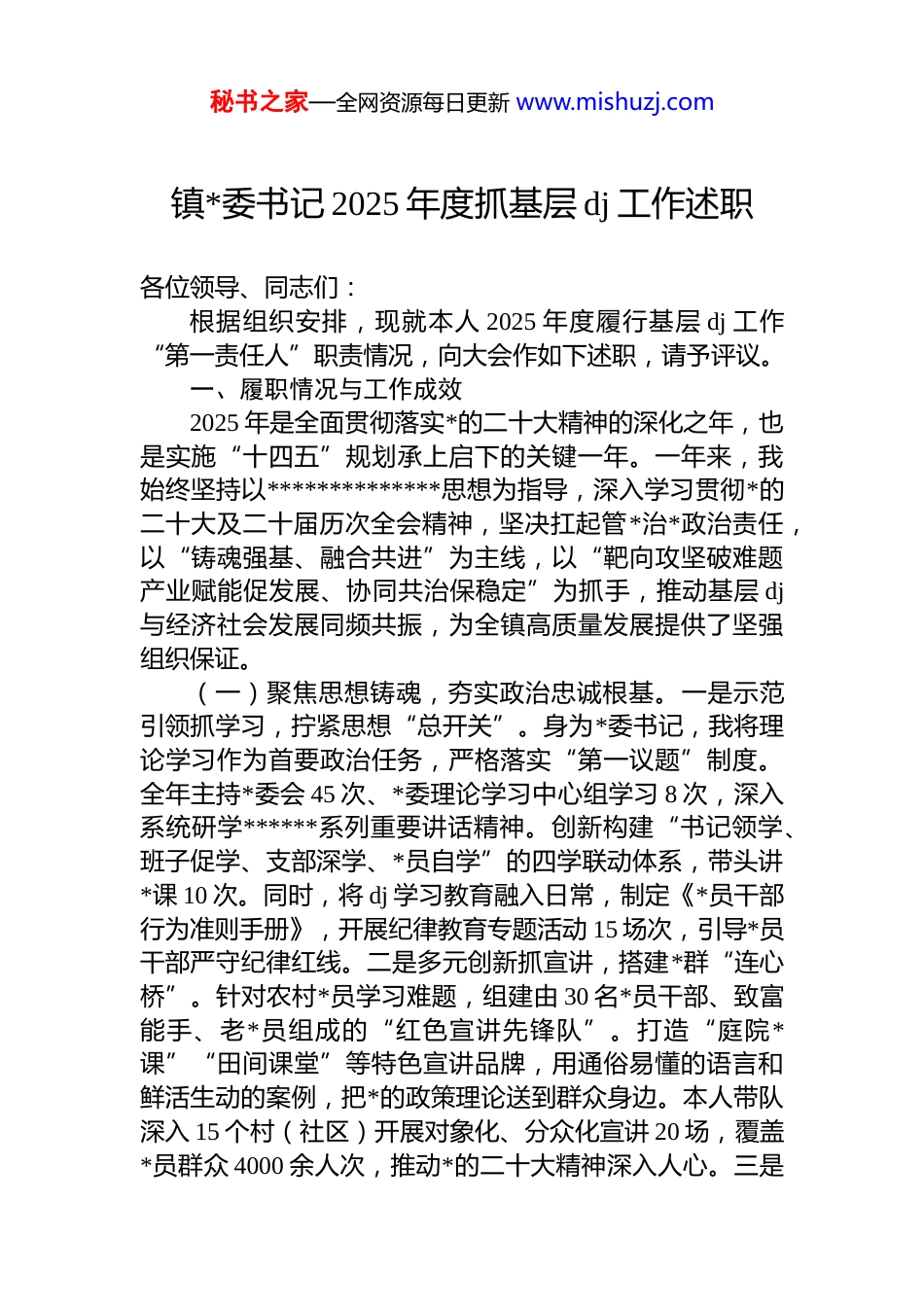 秘书之家—全网资源每日更新 www.mishuzj.com镇*委书记 2025 年度抓基层 dj 工作述职各位领导、同志们:根据组织安排,现就本人 2025 年度履行基层 dj 工作“第一责任人”职责情况,向大会作如下述职,请予评议。一、履职情况与工作成效2025 年是全面贯彻落实*的二十大精神的深化之年,也是实施“十四五”规划承上启下的关键一年。一年来,我始终坚持以**************思想为指导,深入学习贯彻*的二十大及二十届历次全会精神,坚决扛起管*治*政治责任,以“铸魂强基、融合共进”为主线,以“靶向攻坚破难题产业赋能促发展、协同共治保稳定”为抓手,推动基层 dj与经济社会发展同频共振,为全镇高质量发展提供了坚强组织保证。(一)聚焦思想铸魂,夯实政治忠诚根基。一是示范引领抓学习,拧紧思想“总开关”。身为*委书记,我将理论学习作为首要政治任务,严格落实“第一议题”制度。全年主持*委会 45 次、*委理论学习中心组学习 8 次,深入系统研学******系列重要讲话精神。创新构建“书记领学、班子促学、支部深学、*员自学”的四学联动体系,带头讲*课 10 次。同时,将 dj 学习教育融入日常,制定《*员干部行为准则手册》,开展纪律教育专题活动 15 场次,引导*员干部严守纪律红线。二是多元创新抓宣讲,搭建*群“连心桥”。针对农村*员学习难题,组建由 30 名*员干部、致富能手、老*员组成的“红色宣讲先锋队”。打造“庭院*课”“田间课堂”等特色宣讲品牌,用通俗易懂的语言和鲜活生动的案例,把*的政策理论送到群众身边。本人带队深入 15 个村(社区)开展对象化、分众化宣讲 20 场,覆盖*员群众 4000 余人次,推动*的二十大精神深入人心。三是秘书之家—全网资源每日更新 www.mishuzj.com正风肃纪抓廉政,涵养政治“好生态”。严格履行全面从严治*第一责任人职责,牵头开展群众身边腐败和作风问题专项整治。组织观看《永远吹冲锋号》等警示教育片 12 次,剖析典型案例 20 个。建立“廉政风险动态防控台账”,对重点领域、关键岗位人员开展廉政谈话 80 人次,以零容忍态度惩治腐败,营造风清气正的政治生态。(二)聚焦强基固本,锻造坚强战斗堡垒。一是精准整顿提效能。建立“县级领导包联、镇班子成员驻点、第一书记帮扶”的三级整顿机制,对 4 个软弱涣散*组织实行“一村一策”精准治理。调整优化*支部班子 3 个,补充*支部书记 2 名、委员 5 名。引入特色养殖、乡村旅游等项目 6个,推动后进村实现转化升级。例如,[村名]*支部领办葡萄种植合作社,发展葡萄种植基地 300 亩,带动 100 余户群众户均增收一是 5 万元。二是规范建设促提升。深入开展*支部标准化建设,制定《*支部建设标准化手册》,明确组织设置、组织生活、*员管理等方面的具体标准。打造 5 个*支部标准化建设示范点,通过现场观摩、经验交流等方式带动全镇*支部建设水平整体提升。全年新建、改扩建村级活动场所 3 个,为*组织开展活动提供了坚实保障。三是先锋引领树标杆。开展“*员先锋岗”“*员示范户”创建活动,选树*员先进典型 20 名。设立*员志愿服务队 15 支,开展志愿服务活动 100 余次,解决群众急难愁盼问题 200 余件。引导*员在疫情防控、乡村振兴等工作中发挥先锋模范作用,让*旗在基层一线高高飘扬。(三)聚焦融合发展,赋能乡村振兴动力。一是 dj 引领产业兴。实施“dj+产业”发展模式,成立产业发展联合*支部 3 个,推动产业发展与 dj 工作深度融合。培育壮大特色产业,发展蔬菜、水果、中药材等种植基地 5000 余亩,养殖家禽家畜 10 万余头(只)。建立“*支部+合作社+农户”的利益联结机制,带动群众增收致富。全镇农民人均可支配收入达到[具体金额]元,同比增长[x]%。二是人才支秘书之家—全网资源每日更新 www.mishuzj.com撑活力足。出台《人才引进和培养实施办法》,吸引各类人才回乡创业就业。建立人才服务站 5 个,为人才提供政策咨询、项目申报等服务。培养农村实用人才 200 余名,其中致富带头人 50 余名。鼓励人才领办创办新型农业经营主体,推动农业产业现代化发展。三是品牌打造特色显。...