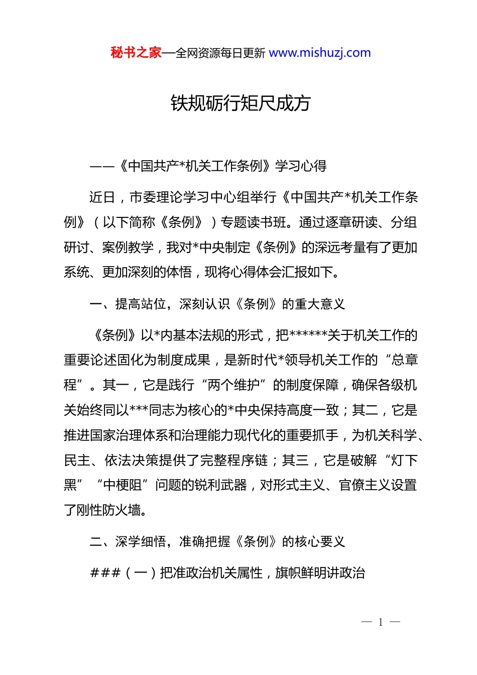 秘书之家—全网资源每日更新 www.mishuzj.com铁规砺行矩尺成方——《中国共产*机关工作条例》学习心得近日,市委理论学习中心组举行《中国共产*机关工作条例》(以下简称《条例》)专题读书班。通过逐章研读、分组研讨、案例教学,我对*中央制定《条例》的深远考量有了更加系统、更加深刻的体悟,现将心得体会汇报如下。一、提高站位,深刻认识《条例》的重大意义《条例》以*内基本法规的形式,把******关于机关工作的重要论述固化为制度成果,是新时代*领导机关工作的“总章程”。其一,它是践行“两个维护”的制度保障,确保各级机关始终同以***同志为核心的*中央保持高度一致;其二,它是推进国家治理体系和治理能力现代化的重要抓手,为机关科学、民主、依法决策提供了完整程序链;其三,它是破解“灯下黑”“中梗阻”问题的锐利武器,对形式主义、官僚主义设置了刚性防火墙。二、深学细悟,准确把握《条例》的核心要义###(一)把准政治机关属性,旗帜鲜明讲政治— 1 —秘书之家—全网资源每日更新 www.mishuzj.com《条例》开宗明义明确“机关首先是政治机关”。学习中我对“政治属性决定工作方向”有了切肤之感:无论是文稿审核、会议筹备,还是督查督办,任何环节都必须把政治标准挺在最前面。要把“第一议题”制度融入日常、做在经常,把是否有利于贯彻*中央决策部署作为衡量一切工作的“第一标尺”。(二)把准服务大局定位,勇挑重担抓落实《条例》强调“机关工作必须围绕中心、服务大局”。作为综合文秘岗位干部,我将把参谋助手作用体现在“三服务”全过程:一是超前服务,紧贴领导决策需求搞好调研、信息、预案;二是精准服务,严格公文审核、精简会议活动,坚决杜绝“以会议落实会议”“以文件落实文件”;三是高效服务,对*中央和省委、市委部署的重点任务,建立“任务清单+责任台账+销号管理”闭环机制,确保事事有回音、件件有落实。(三)把准质量效能导向,推动工作标准化《条例》首次提出“机关工作质量效益评价体系”,把程序合规、结果有效、群众满意作为衡量标准。结合工作实际,我将重点在“三化”上下功夫:一是办文标准化,严格执行行文规则、审核程序、备案要求,坚决纠正“带病发文”;二是— 2 —秘书之家—全网资源每日更新 www.mishuzj.com办会精细化,严控会议规模、时间、规格,能合并不分设、能视频不集中;三是督查法治化,对督查检查考核事项实行年度计划管理,未列入计划的一律不得擅自开展,切实为基层减负。(四)把准作风建设要害,纠树并举扬新风《条例》对整治形式主义、官僚主义作出专章规定,条条指向“灯下黑”顽疾。我深刻认识到:文风会风看似“小事”,实则关乎*风政风。今后起草文稿,坚决做到“短实新”,不穿靴戴帽、不照搬照抄;筹办会议,坚持“无会周”“无纸化”,让干部把更多精力用在抓落实、解难题上。三、知行合一,奋力推动《条例》落地见效(一)在“学”上走深把《条例》纳入支部“三会一课”必学内容,原原本本学逐条逐句学,并与《*章》《准则》《纪律处分条例》贯通起来,真正学出信仰、学出担当、学出本领。(二)在“改”上动真对照《条例》18 项禁止性规定,开展自查自纠,重点查找办文办会、督查检查、调查研究等方面存在的突出问题,建立问题、任务、责任、时限“四清单”,立行立改、对账销号。— 3 —秘书之家—全网资源每日更新 www.mishuzj.com(三)在“立”上求实结合科室职能,修订完善《文稿审核细则》《会议活动管理办法》《督查督办工作规范》等配套制度,把《条例》要求细化为“硬杠杠”,形成用制度管人、按程序办事的长效机制。(四)在“融”上发力把贯彻《条例》与 dj 学习教育、整治形式主义为基层减负、推动高质量发展等重点工作深度融合,做到“两手抓、两促进”,以工作实效检验学习成效。四、结语制度的生命力在于执行。我将以此次学习为新起点,把《条例》要求转化为“时时放心不下”的责任感、“事事精益求精”的进取心,以更高标准、更严要求、更实作风做好“三服务”工作,努力在建设让*放心、让人民满意的模范机关中展现新作为、作出新贡献!— 4 —