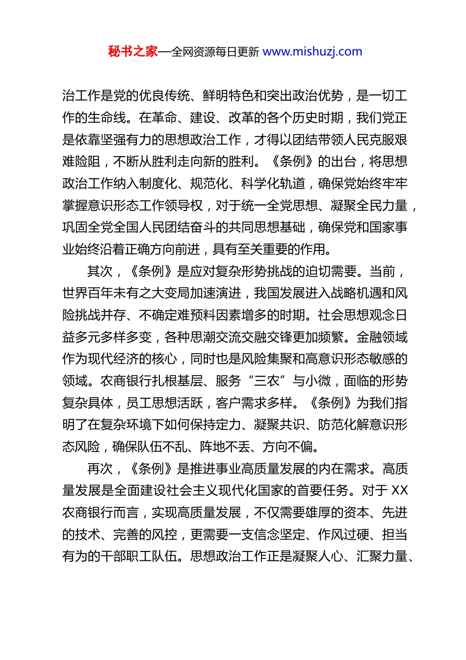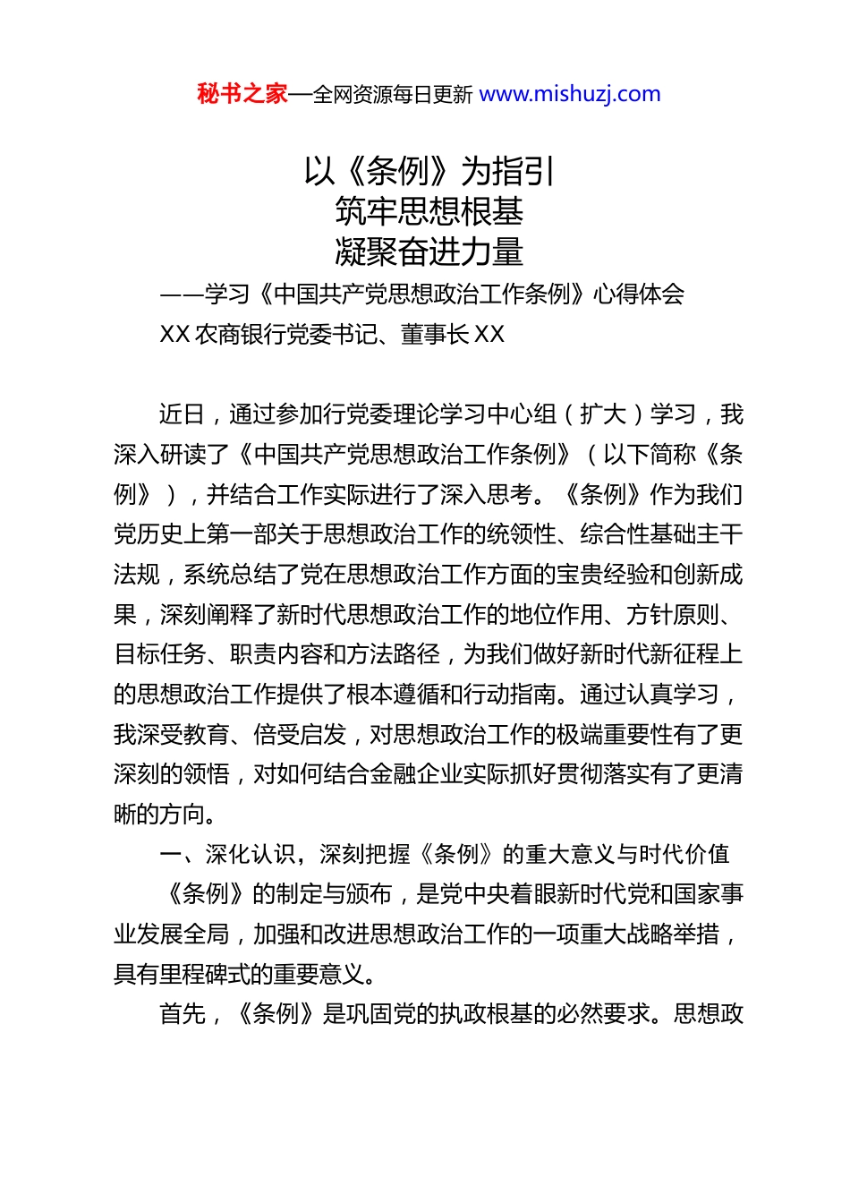 秘书之家—全网资源每日更新 www.mishuzj.com以《条例》为指引筑牢思想根基凝聚奋进力量——学习《中国共产党思想政治工作条例》心得体会XX 农商银行党委书记、董事长 XX近日,通过参加行党委理论学习中心组(扩大)学习,我深入研读了《中国共产党思想政治工作条例》(以下简称《条例》),并结合工作实际进行了深入思考。《条例》作为我们党历史上第一部关于思想政治工作的统领性、综合性基础主干法规,系统总结了党在思想政治工作方面的宝贵经验和创新成果,深刻阐释了新时代思想政治工作的地位作用、方针原则、目标任务、职责内容和方法路径,为我们做好新时代新征程上的思想政治工作提供了根本遵循和行动指南。通过认真学习,我深受教育、倍受启发,对思想政治工作的极端重要性有了更深刻的领悟,对如何结合金融企业实际抓好贯彻落实有了更清晰的方向。一、深化认识,深刻把握《条例》的重大意义与时代价值《条例》的制定与颁布,是党中央着眼新时代党和国家事业发展全局,加强和改进思想政治工作的一项重大战略举措,具有里程碑式的重要意义。首先,《条例》是巩固党的执政根基的必然要求。思想政秘书之家—全网资源每日更新 www.mishuzj.com治工作是党的优良传统、鲜明特色和突出政治优势,是一切工作的生命线。在革命、建设、改革的各个历史时期,我们党正是依靠坚强有力的思想政治工作,才得以团结带领人民克服艰难险阻,不断从胜利走向新的胜利。《条例》的出台,将思想政治工作纳入制度化、规范化、科学化轨道,确保党始终牢牢掌握意识形态工作领导权,对于统一全党思想、凝聚全民力量,巩固全党全国人民团结奋斗的共同思想基础,确保党和国家事业始终沿着正确方向前进,具有至关重要的作用。其次,《条例》是应对复杂形势挑战的迫切需要。当前,世界百年未有之大变局加速演进,我国发展进入战略机遇和风险挑战并存、不确定难预料因素增多的时期。社会思想观念日益多元多样多变,各种思潮交流交融交锋更加频繁。金融领域作为现代经济的核心,同时也是风险集聚和高意识形态敏感的领域。农商银行扎根基层、服务“三农”与小微,面临的形势复杂具体,员工思想活跃,客户需求多样。《条例》为我们指明了在复杂环境下如何保持定力、凝聚共识、防范化解意识形态风险,确保队伍不乱、阵地不丢、方向不偏。再次,《条例》是推进事业高质量发展的内在需求。高质量发展是全面建设社会主义现代化国家的首要任务。对于 XX农商银行而言,实现高质量发展,不仅需要雄厚的资本、先进的技术、完善的风控,更需要一支信念坚定、作风过硬、担当有为的干部职工队伍。思想政治工作正是凝聚人心、汇聚力量、秘书之家—全网资源每日更新 www.mishuzj.com激发动力的关键所在。《条例》强调思想政治工作要“围绕中心、服务大局”,为我们提供了将思想政治工作融入经营管理、业务发展、改革创新全过程的根本遵循,通过强有力的思想引领和精神激励,把党的政治优势、组织优势转化为企业的发展优势、竞争优势,为奋力迈向“战略执行力与数字科技能力‘双一流’”的农商银行目标提供坚强思想保证和强大精神动力。二、领会精髓,准确把握《条例》的核心要义与实践要求《条例》内涵丰富、体系完备,我们必须学深悟透其核心要义,准确把握其精神实质和实践要求。一是必须坚持和加强党的全面领导。这是思想政治工作的根本原则。《条例》通篇贯穿了坚持和加强党对思想政治工作全面领导这一红线。在农商银行实践中,必须毫不动摇地坚持党对金融工作的集中统一领导,将党的领导贯穿于思想政治工作全过程、各方面。行党委要切实履行主体责任,我作为党委书记,必须扛起第一责任人职责,班子成员要落实“一岗双责”,把抓好思想政治工作作为重要政治任务,定期研究、部署、检查、考核,确保党中央关于思想政治工作的各项决策部署在 XX 农商银行不折不扣落到实处。二是必须坚持围绕中心、服务大局。思想政治工作不能空对空,必须紧密围绕党和国家工作大局,紧密结合银行改革发展和经营管理中心任务来展开。我们要自觉将思想政治工作融秘书之家—全网资源每日更新 www.mishuzj.com入服务实体经济、深化...