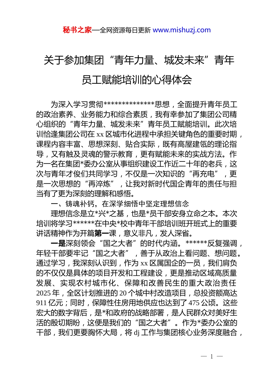 秘书之家—全网资源每日更新 www.mishuzj.com关于参加集团“青年力量、城发未来”青年员工赋能培训的心得体会为深入学习贯彻**************思想,全面提升青年员工的政治素养、业务能力和综合素质,我有幸参加了集团公司精心组织的“青年力量、城发未来”青年员工赋能培训。此次培训恰逢集团公司在 xx 区城市化进程中承担关键角色的重要时期,课程内容丰富、思想深刻、贴合实际,既有高屋建瓴的理论指导,又有触及灵魂的警示教育,更有赋能未来的实战方法。作为一名在集团*委办公室从事组织建设工作近二十年的老兵,这次与青年才俊们共同学习,不仅是一次知识的“再充电”,更是一次思想的“再淬炼”,让我对新时代国企青年的责任与担当有了更为深刻的理解和感悟。一、铸魂补钙,在深学细悟中坚定理想信念理想信念是立*兴*之基,也是*员干部安身立命之本。本次培训将学习******在中央*校中青年干部培训班开班式上的重要讲话精神作为开篇第一课,意义非凡,发人深省。一是深刻领会“国之大者”的时代内涵。******反复强调,年轻干部要牢记“国之大者”,善于从政治上看问题、想问题。通过学习,我深刻认识到,作为 xx 区属国企的一员,我们肩负的不仅仅是具体的项目开发和工程建设,更是推动区域高质量发展、实现农村城市化、保障和改善民生的重大政治责任2025 年,全区计划推进的 20 个城中村改造项目,总投资额高达911 亿元;同时,保障性住房用地供应也达到了 475 公顷。这些宏大的数字背后,是*和政府的战略部署,是人民群众对美好生活的殷切期盼,这便是我们的“国之大者”。作为*委办公室的干部,我们更要胸怀大局,将 dj 工作与集团核心业务深度融合,— 1 —秘书之家—全网资源每日更新 www.mishuzj.com确保集团发展的每一步都与区委区政府的战略部署同频共振,确保*的领导贯穿于项目决策、建设、运营的全过程。二是不断锤炼对*忠诚的政治品格。******指出,对*忠诚,是共产*人首要的政治品质。培训中重温了***关于“五个必须”和“七个有之”的论述,对我触动很大。忠诚不是空洞的口号,而是具体的行动。在日常工作中,就是要不折不扣地贯彻执行*的路线方针政策和上级*委的决策部署。在干部管理和组织建设中,要坚持*管干部原则,把政治标准放在首位,确保选拔出来的干部都是“忠诚、干净、担当”的好干部。同时,要通过扎实的 dj 工作,引导广大青年员工增强“四个意识”、坚定“四个自信”、做到“两个维护”,将个人成长融入集团发展和区域建设的伟大事业中。三是时刻保持敢于斗争的奋进姿态。当前,集团正处于转型发展的关键期,探索农村集体经营性建设用地建设保障性租赁住房和长租公寓、推进城市更新等新业务增长点,既是机遇也是挑战。这些新领域没有现成的经验可循,必然会遇到各种矛盾和困难。***教导我们,要发扬斗争精神,增强斗争本领,在原则问题上寸步不让,在困难面前迎难而上。这要求我们青年员工,特别是青年干部,必须摒弃“佛系”“躺平”心态,敢于啃硬骨头、敢于涉险滩,在推动一级开发、城中村改造等传统业务提质增效的同时,积极投身到新业务的探索实践中去,用实际行动为集团开辟新的发展空间。二、以案为鉴,在警钟长鸣中筑牢纪律防线“以案说纪”是本次培训的“重头戏”,一个个鲜活的案例,一句句锥心的忏悔,为我们所有参训人员上了一堂触及灵魂的廉洁教育课。这些案例既有发生在国企领域利用职权在工程发包、土地出让中谋取私利的“巨贪”,也有像张某、王某等因沉迷网络、追求奢靡而挪用公款、收受礼品的年轻干部,他们的堕落轨迹为我们敲响了警钟。— 2 —秘书之家—全网资源每日更新 www.mishuzj.com一是必须守住廉洁自律的底线。案例中,许多违纪违法的年轻干部都是从一顿饭、一份礼品开始,逐步放松警惕,最终滑向犯罪的深渊。这警示我们,作风问题无小事,廉洁防线一旦被突破,后果不堪设想。作为国企员工,我们手中或多或少都掌握着一定的公共资源和权力,必须时刻保持清醒的头脑,正确处理公与私、义与利、情与法的关系。要严格遵守中央八项规定精神,净化自己的社交圈、生活圈、朋友圈,做到知敬畏、存戒惧、...