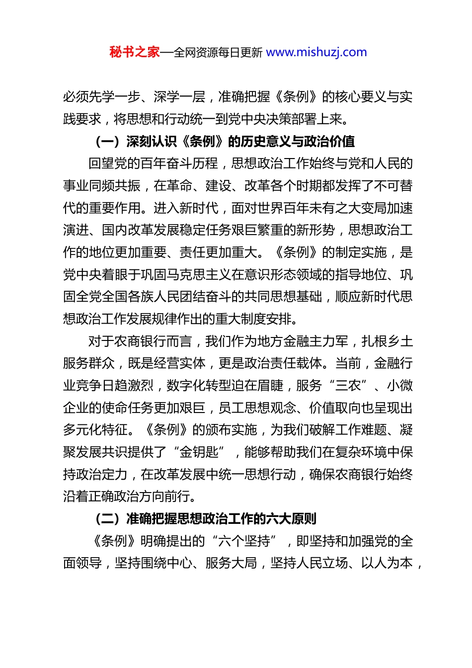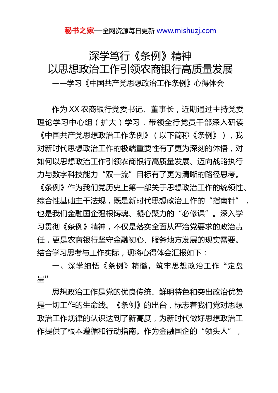 秘书之家—全网资源每日更新 www.mishuzj.com深学笃行《条例》精神以思想政治工作引领农商银行高质量发展——学习《中国共产党思想政治工作条例》心得体会作为 XX 农商银行党委书记、董事长,近期通过主持党委理论学习中心组(扩大)学习,带领全行党员干部深入研读《中国共产党思想政治工作条例》(以下简称《条例》),我对新时代思想政治工作的极端重要性有了更为深刻的体悟,对如何以思想政治工作引领农商银行高质量发展、迈向战略执行力与数字科技能力“双一流”目标有了更为清晰的路径思考。《条例》作为我们党历史上第一部关于思想政治工作的统领性、综合性基础主干法规,既是新时代思想政治工作的“指南针”,也是我们金融国企强根铸魂、凝心聚力的“必修课”。深入学习贯彻《条例》精神,不仅是落实全面从严治党要求的政治责任,更是农商银行坚守金融初心、服务地方发展的现实需要。结合学习思考与工作实际,现将心得体会汇报如下:一、深学细悟《条例》精髓,筑牢思想政治工作“定盘星”思想政治工作是党的优良传统、鲜明特色和突出政治优势是一切工作的生命线。《条例》的出台,标志着我们党对思想政治工作规律的认识达到了新高度,为新时代做好思想政治工作提供了根本遵循和行动指南。作为金融国企的“领头人”,秘书之家—全网资源每日更新 www.mishuzj.com必须先学一步、深学一层,准确把握《条例》的核心要义与实践要求,将思想和行动统一到党中央决策部署上来。(一)深刻认识《条例》的历史意义与政治价值回望党的百年奋斗历程,思想政治工作始终与党和人民的事业同频共振,在革命、建设、改革各个时期都发挥了不可替代的重要作用。进入新时代,面对世界百年未有之大变局加速演进、国内改革发展稳定任务艰巨繁重的新形势,思想政治工作的地位更加重要、责任更加重大。《条例》的制定实施,是党中央着眼于巩固马克思主义在意识形态领域的指导地位、巩固全党全国各族人民团结奋斗的共同思想基础,顺应新时代思想政治工作发展规律作出的重大制度安排。对于农商银行而言,我们作为地方金融主力军,扎根乡土服务群众,既是经营实体,更是政治责任载体。当前,金融行业竞争日趋激烈,数字化转型迫在眉睫,服务“三农”、小微企业的使命任务更加艰巨,员工思想观念、价值取向也呈现出多元化特征。《条例》的颁布实施,为我们破解工作难题、凝聚发展共识提供了“金钥匙”,能够帮助我们在复杂环境中保持政治定力,在改革发展中统一思想行动,确保农商银行始终沿着正确政治方向前行。(二)准确把握思想政治工作的六大原则《条例》明确提出的“六个坚持”,即坚持和加强党的全面领导,坚持围绕中心、服务大局,坚持人民立场、以人为本,秘书之家—全网资源每日更新 www.mishuzj.com坚持实事求是、守正创新,坚持全党动手、全面覆盖,坚持做在日常、落到基层,是对思想政治工作实践经验的高度凝练,也是我们开展工作必须牢牢把握的根本遵循。坚持党的全面领导是思想政治工作的根本保证。农商银行作为国有金融企业,必须把党的领导贯穿思想政治工作全过程各方面,将党组织的政治优势、组织优势转化为发展优势。作为党委书记,我深刻认识到,只有把牢政治方向,确保思想政治工作始终体现党的意志、反映党的主张,才能让全行上下在思想上政治上行动上同以习近平同志为核心的党中央保持高度一致,确保农商银行姓“党”姓“公”的属性不偏离。坚持围绕中心、服务大局是思想政治工作的价值所在。思想政治工作不能空对空,必须与业务发展同频共振。我们始终坚持把思想政治工作融入服务地方经济、支持乡村振兴、推进数字化转型等中心工作,引导员工深刻认识“金融为民”的初心使命,将个人价值实现与银行发展、地方繁荣紧密结合,避免思想政治工作与业务工作“两张皮”。坚持人民立场、以人为本是思想政治工作的核心要义。农商银行的服务对象是广大群众,员工是发展的根本力量。思想政治工作既要“以客户为中心”,回应群众金融需求;也要“以员工为根本”,关心员工成长发展,把解决思想问题与解决实际问题结合起来,让思想政治工作有温度、有实效。坚持实事求是、守正创新是...