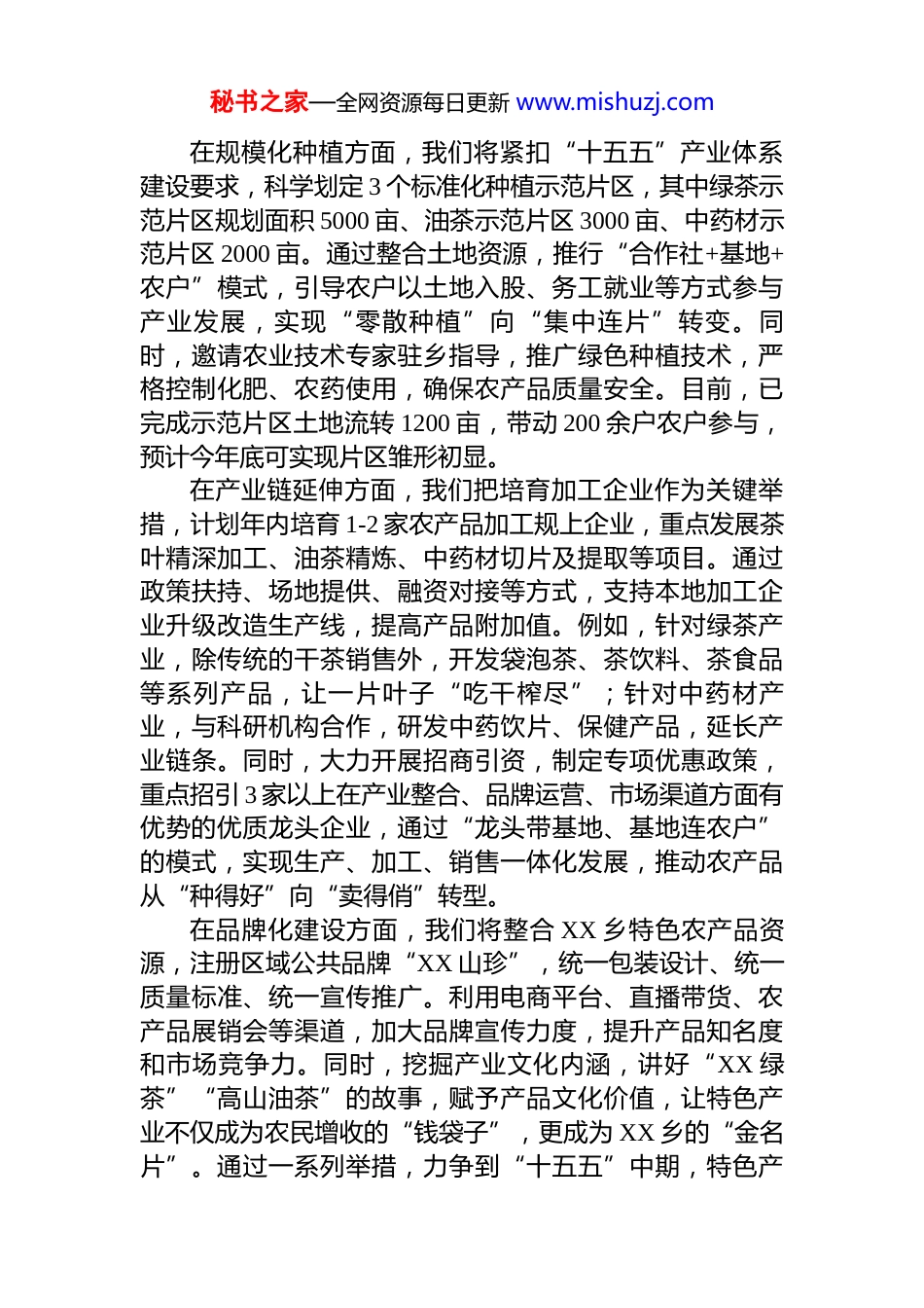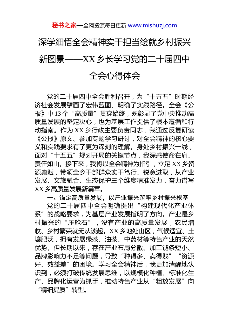 秘书之家—全网资源每日更新 www.mishuzj.com深学细悟全会精神实干担当绘就乡村振兴新图景——XX 乡长学习党的二十届四中全会心得体会党的二十届四中全会胜利召开,为“十五五”时期经济社会发展擘画了宏伟蓝图、明确了实践路径。全会《公报》中 13 个“高质量”贯穿始终,既彰显了党中央推动高质量发展的坚定决心,也为基层工作提供了根本遵循和行动指南。作为 XX 乡行政主要负责同志,我通过反复研读《公报》原文、参加专题学习研讨,对全会精神的核心要义和实践要求有了更为深刻的理解。身处乡村振兴一线,面对“十五五”规划开局的关键节点,我深感使命在肩、责任如山。接下来,我将以全会精神为指引,立足 XX 乡资源禀赋,带领全乡干部群众实干笃行、锐意进取,从产业发展、文旅融合、生态保护三个维度精准发力,奋力谱写XX 乡高质量发展新篇章。一、锚定高质量发展,以产业振兴筑牢乡村振兴根基党的二十届四中全会明确提出“构建现代化产业体系”的战略要求,为基层产业发展指明了方向。产业是乡村振兴的“压舱石”,没有产业的高质量发展,农民增收、乡村繁荣就无从谈起。XX 乡地处山区,气候适宜、土壤肥沃,拥有发展绿茶、油茶、中药材等特色产业的天然优势。但长期以来,存在产业布局分散、加工链条短小、品牌影响力不足等问题,导致“种得多、卖得贱”“资源好、效益差”的困境。学习全会精神后,我更加清醒地认识到,必须打破传统发展思维,以规模化种植、标准化生产、品牌化运营为抓手,推动特色产业从“粗放发展”向“精细提质”转型。秘书之家—全网资源每日更新 www.mishuzj.com在规模化种植方面,我们将紧扣“十五五”产业体系建设要求,科学划定 3 个标准化种植示范片区,其中绿茶示范片区规划面积 5000 亩、油茶示范片区 3000 亩、中药材示范片区 2000 亩。通过整合土地资源,推行“合作社+基地+农户”模式,引导农户以土地入股、务工就业等方式参与产业发展,实现“零散种植”向“集中连片”转变。同时,邀请农业技术专家驻乡指导,推广绿色种植技术,严格控制化肥、农药使用,确保农产品质量安全。目前,已完成示范片区土地流转 1200 亩,带动 200 余户农户参与,预计今年底可实现片区雏形初显。在产业链延伸方面,我们把培育加工企业作为关键举措,计划年内培育 1-2 家农产品加工规上企业,重点发展茶叶精深加工、油茶精炼、中药材切片及提取等项目。通过政策扶持、场地提供、融资对接等方式,支持本地加工企业升级改造生产线,提高产品附加值。例如,针对绿茶产业,除传统的干茶销售外,开发袋泡茶、茶饮料、茶食品等系列产品,让一片叶子“吃干榨尽”;针对中药材产业,与科研机构合作,研发中药饮片、保健产品,延长产业链条。同时,大力开展招商引资,制定专项优惠政策,重点招引 3 家以上在产业整合、品牌运营、市场渠道方面有优势的优质龙头企业,通过“龙头带基地、基地连农户”的模式,实现生产、加工、销售一体化发展,推动农产品从“种得好”向“卖得俏”转型。在品牌化建设方面,我们将整合 XX 乡特色农产品资源,注册区域公共品牌“XX 山珍”,统一包装设计、统一质量标准、统一宣传推广。利用电商平台、直播带货、农产品展销会等渠道,加大品牌宣传力度,提升产品知名度和市场竞争力。同时,挖掘产业文化内涵,讲好“XX 绿茶”“高山油茶”的故事,赋予产品文化价值,让特色产业不仅成为农民增收的“钱袋子”,更成为 XX 乡的“金名片”。通过一系列举措,力争到“十五五”中期,特色产秘书之家—全网资源每日更新 www.mishuzj.com业年产值突破 5 亿元,带动农民人均年增收 XX 万元,让产业振兴真正成为乡村振兴的核心支撑。二、深挖资源禀赋,以文体旅融合激活高质量发展新动能全会提出“推动文化和旅游深度融合发展”,为基层盘活生态文化资源、培育新的经济增长点提供了重要遵循。XX 乡山清水秀、风光旖旎,境内有白莲河库区绵延数十里,森林覆盖率达 75%,兼具山水之美与生态之优;同时,拥有深厚的传统文化底蕴,古村落、民俗风情保存完好。但长期以来,这些资源处于“养在深闺人未识”的状态,...