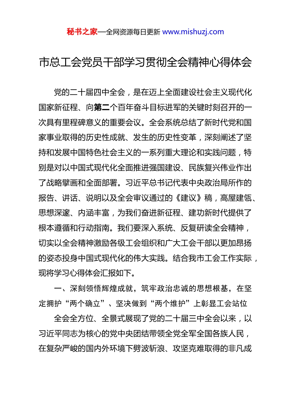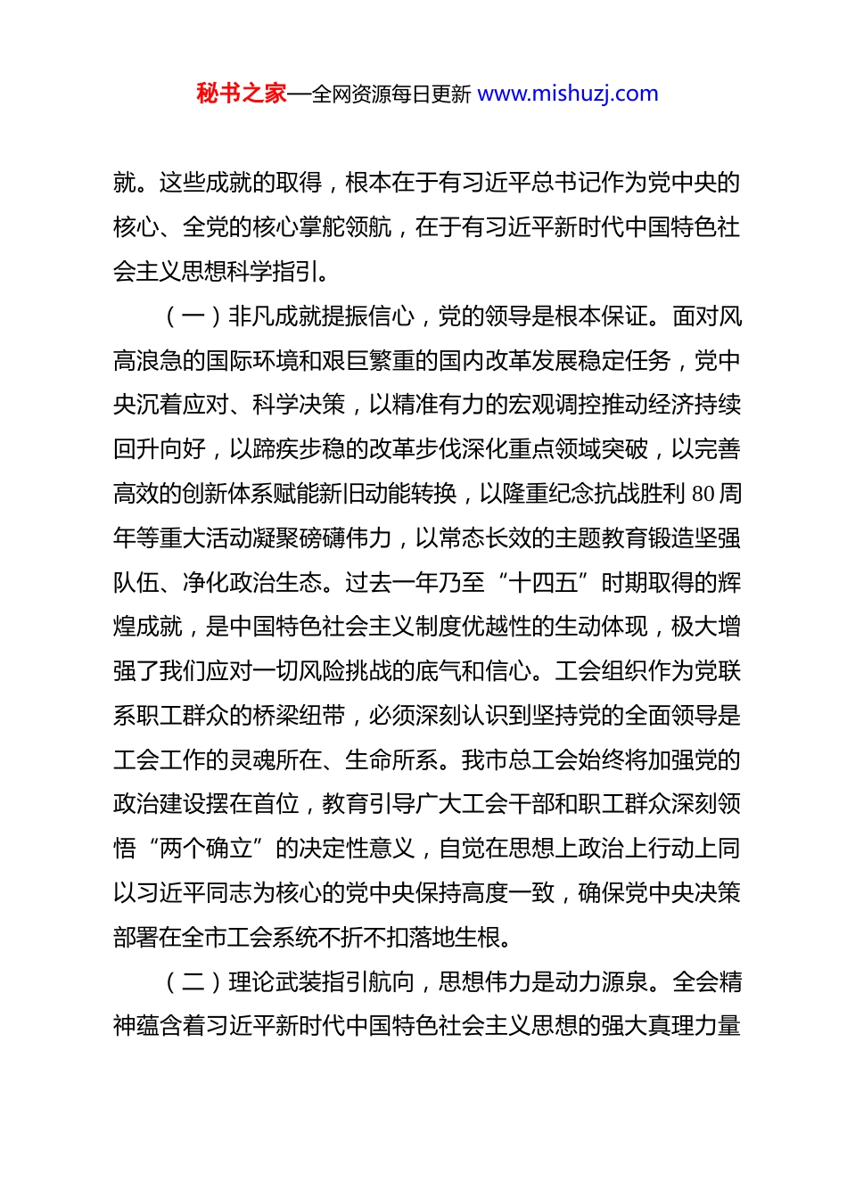 秘书之家—全网资源每日更新 www.mishuzj.com市总工会党员干部学习贯彻全会精神心得体会 党的二十届四中全会,是在迈上全面建设社会主义现代化国家新征程、向第二个百年奋斗目标进军的关键时刻召开的一次具有里程碑意义的重要会议。全会系统总结了新时代党和国家事业取得的历史性成就、发生的历史性变革,深刻阐述了坚持和发展中国特色社会主义的一系列重大理论和实践问题,特别是对以中国式现代化全面推进强国建设、民族复兴伟业作出了战略擘画和全面部署。习近平总书记代表中央政治局所作的报告、讲话、说明以及全会审议通过的《建议》稿,高屋建瓴、思想深邃、内涵丰富,为我们奋进新征程、建功新时代提供了根本遵循和行动指南。我们要深入系统、反复研读全会精神,切实以全会精神激励各级工会组织和广大工会干部以更加昂扬的姿态投身中国式现代化的伟大实践。结合我市工会工作实际,现将学习心得体会汇报如下。一、深刻领悟辉煌成就,筑牢政治忠诚的思想根基,在坚定拥护“两个确立”、坚决做到“两个维护”上彰显工会站位全会全方位、全景式展现了党的二十届三中全会以来,以习近平同志为核心的党中央团结带领全党全军全国各族人民,在复杂严峻的国内外环境下劈波斩浪、攻坚克难取得的非凡成秘书之家—全网资源每日更新 www.mishuzj.com就。这些成就的取得,根本在于有习近平总书记作为党中央的核心、全党的核心掌舵领航,在于有习近平新时代中国特色社会主义思想科学指引。(一)非凡成就提振信心,党的领导是根本保证。面对风高浪急的国际环境和艰巨繁重的国内改革发展稳定任务,党中央沉着应对、科学决策,以精准有力的宏观调控推动经济持续回升向好,以蹄疾步稳的改革步伐深化重点领域突破,以完善高效的创新体系赋能新旧动能转换,以隆重纪念抗战胜利 80 周年等重大活动凝聚磅礴伟力,以常态长效的主题教育锻造坚强队伍、净化政治生态。过去一年乃至“十四五”时期取得的辉煌成就,是中国特色社会主义制度优越性的生动体现,极大增强了我们应对一切风险挑战的底气和信心。工会组织作为党联系职工群众的桥梁纽带,必须深刻认识到坚持党的全面领导是工会工作的灵魂所在、生命所系。我市总工会始终将加强党的政治建设摆在首位,教育引导广大工会干部和职工群众深刻领悟“两个确立”的决定性意义,自觉在思想上政治上行动上同以习近平同志为核心的党中央保持高度一致,确保党中央决策部署在全市工会系统不折不扣落地生根。(二)理论武装指引航向,思想伟力是动力源泉。全会精神蕴含着习近平新时代中国特色社会主义思想的强大真理力量秘书之家—全网资源每日更新 www.mishuzj.com和实践伟力。特别是其中关于工人阶级和工会工作的重要论述,为我们做好新时代新征程工会工作指明了前进方向、提供了根本遵循。市总工会始终坚持把学习贯彻党的创新理论作为首要政治任务。持续深化“中国梦·劳动美”主题宣传教育,运用职工书屋、劳模工匠宣讲团、工会新媒体矩阵等多维载体,推动党的创新理论进企业、进车间、进班组,引导广大职工深刻理解中国式现代化的本质要求和重大原则,自觉做党的创新理论的坚定信仰者和忠实实践者,不断巩固团结奋斗的共同思想基础。(三)政治引领凝聚共识,团结奋斗是时代主题。全会深刻指出,团结奋斗是中国人民创造历史伟业的必由之路。工人阶级是我国的领导阶级,是实现民族复兴伟业的主力军。市总工会始终把巩固党执政的阶级基础和群众基础作为政治责任。通过大力弘扬劳模精神、劳动精神、工匠精神,选树宣传我市各条战线涌现出的先进模范人物和感人事迹,讲好新时代我市工人的奋斗故事,激发广大职工的主人翁意识和历史主动精神,引导他们坚定不移听党话、跟党走,将个人理想融入强国建设、民族复兴的伟大实践,汇聚起万众一心、共创伟业的强大合力。二、准确把握战略部署,锚定服务大局的目标方向,在推动高质量发展和中国式现代化我市实践中展现工会作为秘书之家—全网资源每日更新 www.mishuzj.com全会审议通过的《建议》稿,是指导未来五年乃至更长时期国家发展的纲领性文件。其核心要义在于全面推进中国式现代化,并对产业发展、科技创...